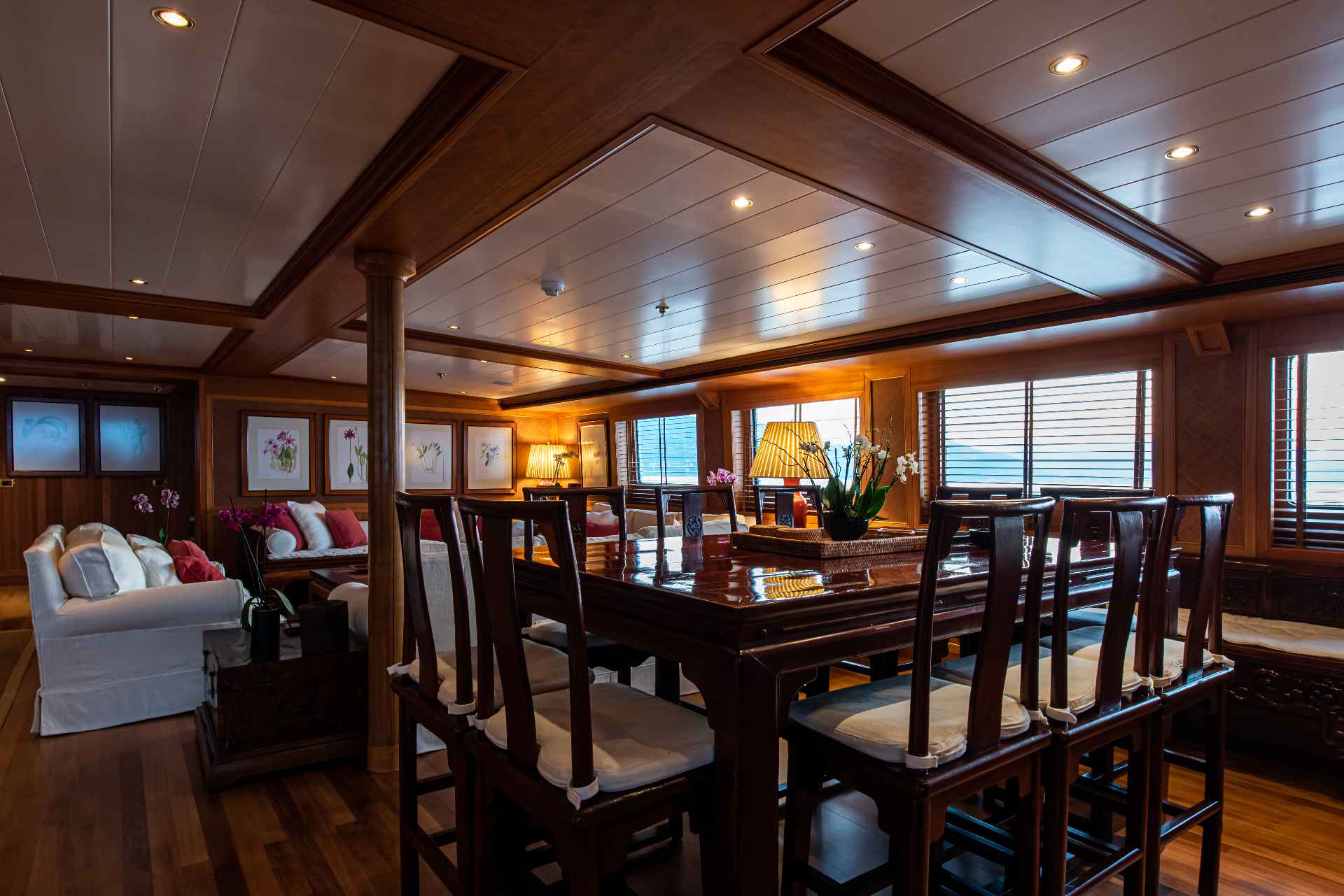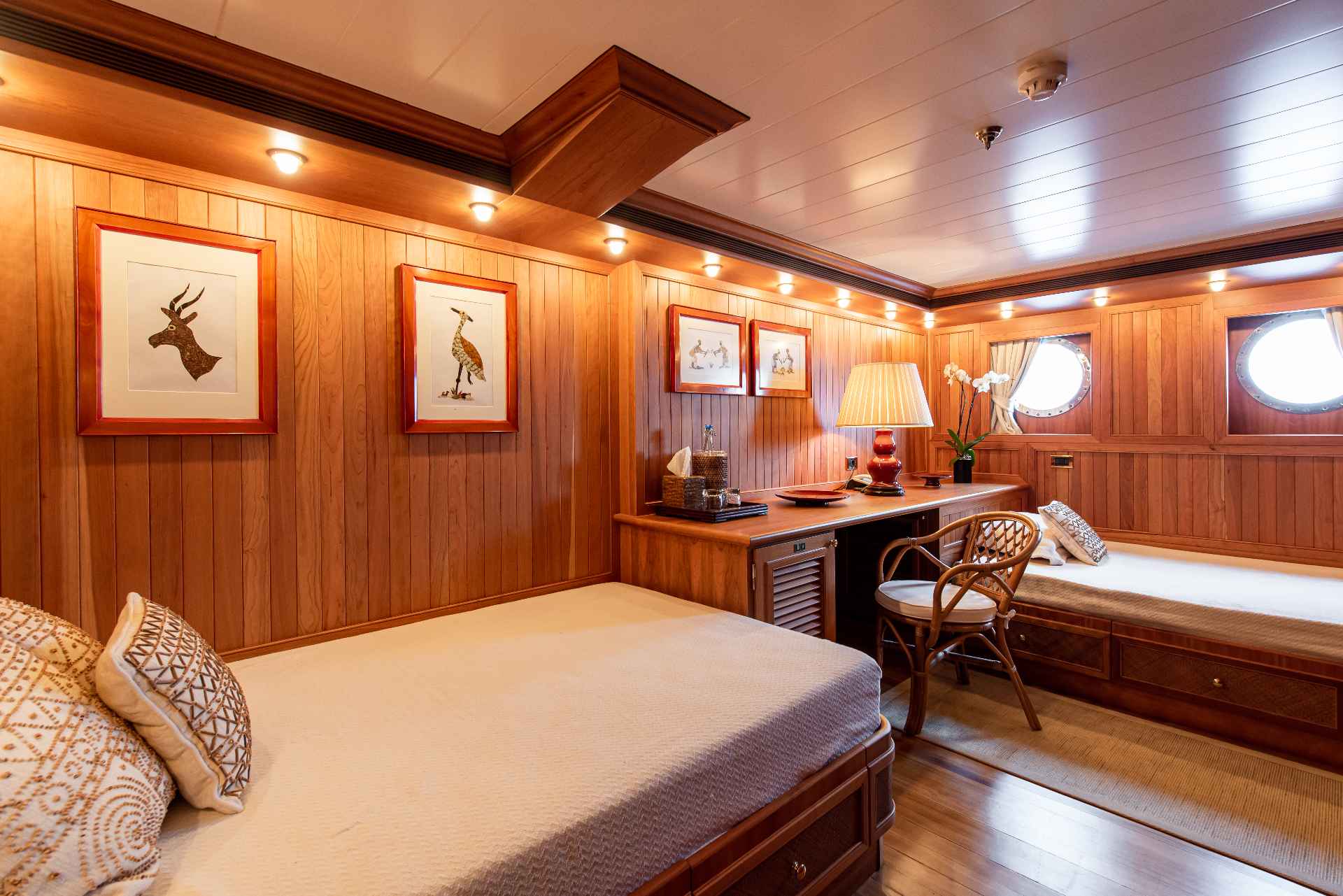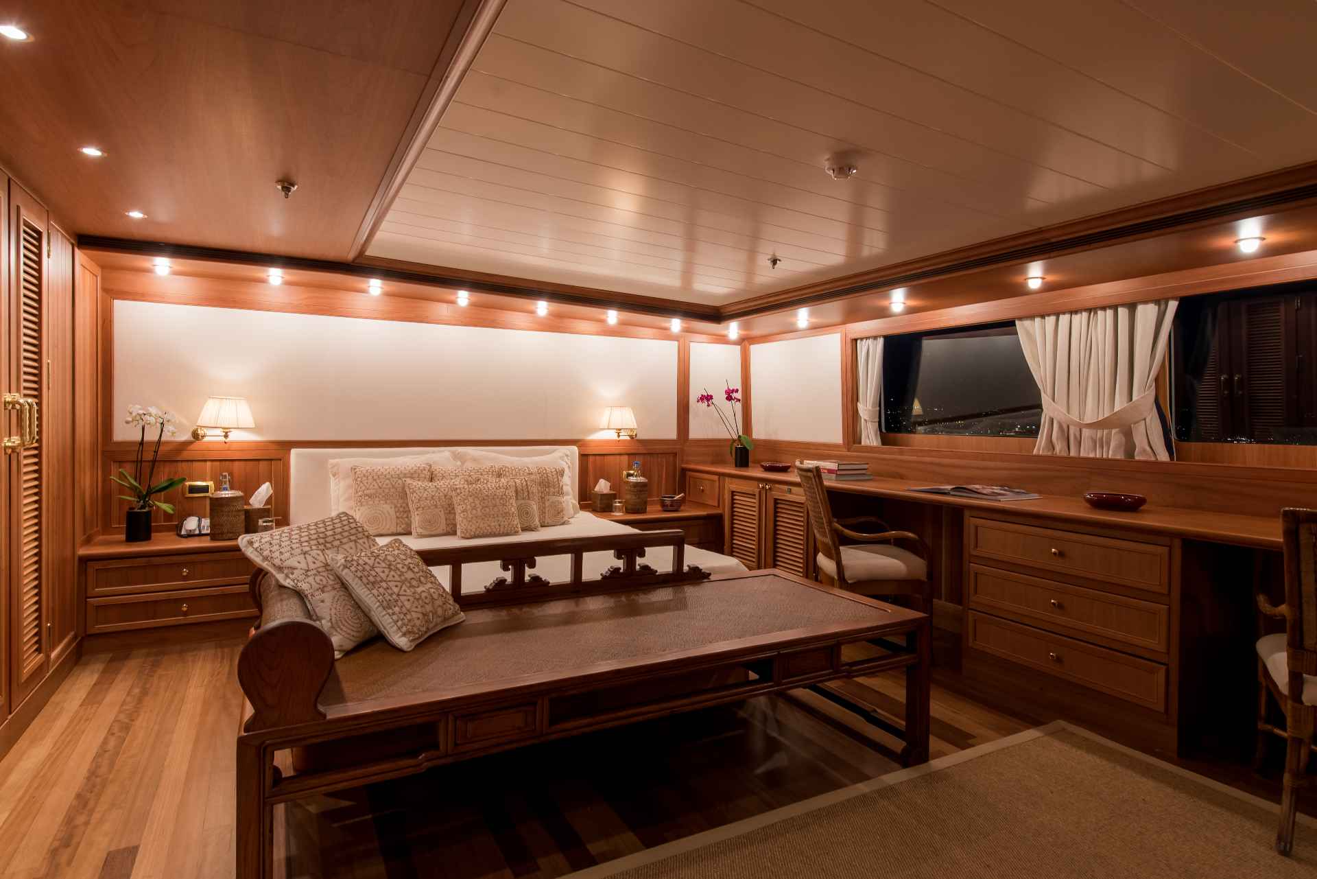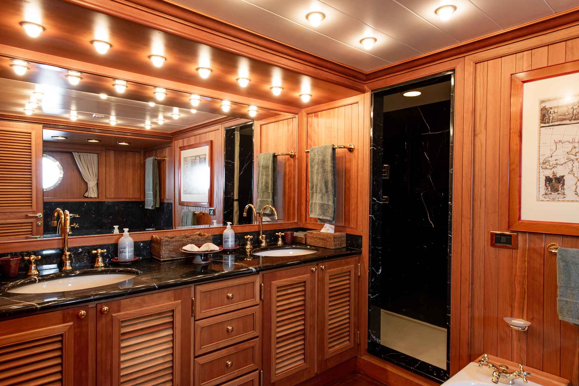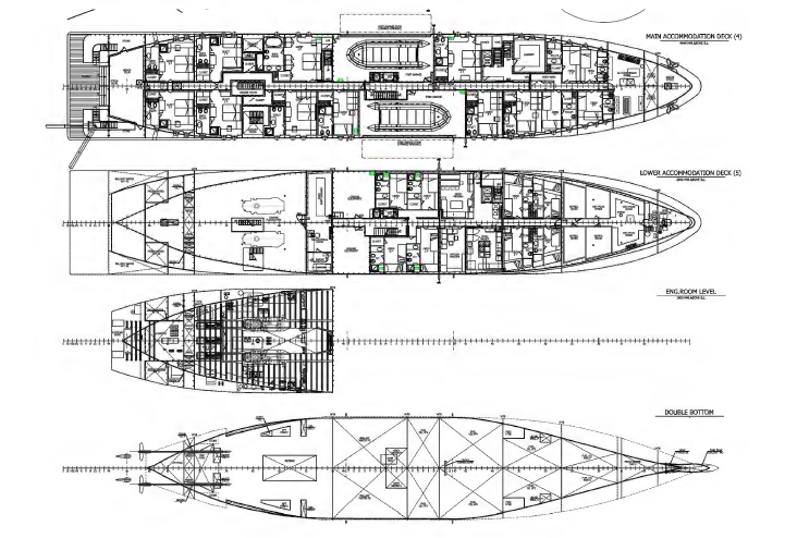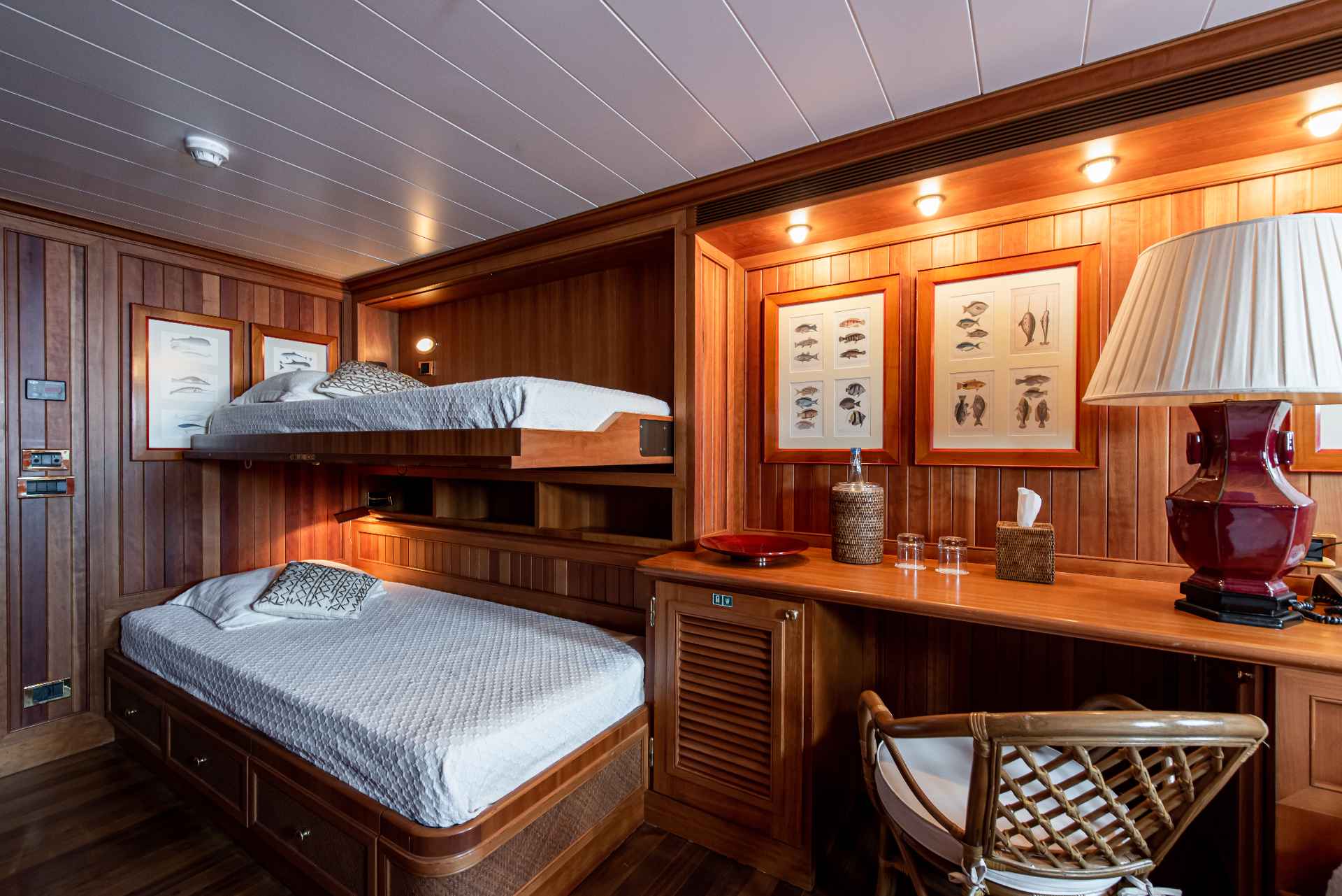 Guest accommodation onboard includes a stunning full-beam Owner’s suite with a private study plus his & hers dressing rooms and ensuite bathrooms, two VIP cabins, six double cabins, two triple cabins and two twin cabins each with an additional Pullman berth. BLEU DE NÎMES also has two staff cabins plus accommodation for her 23-person crew on the lower decks.