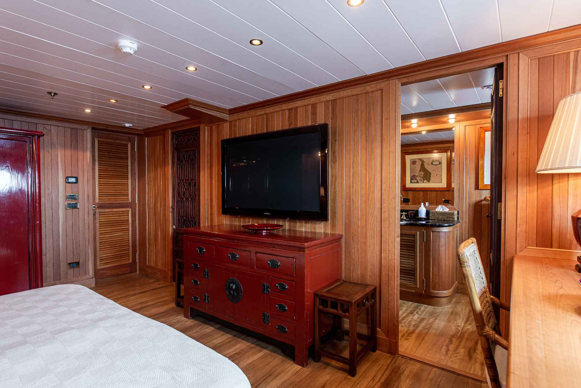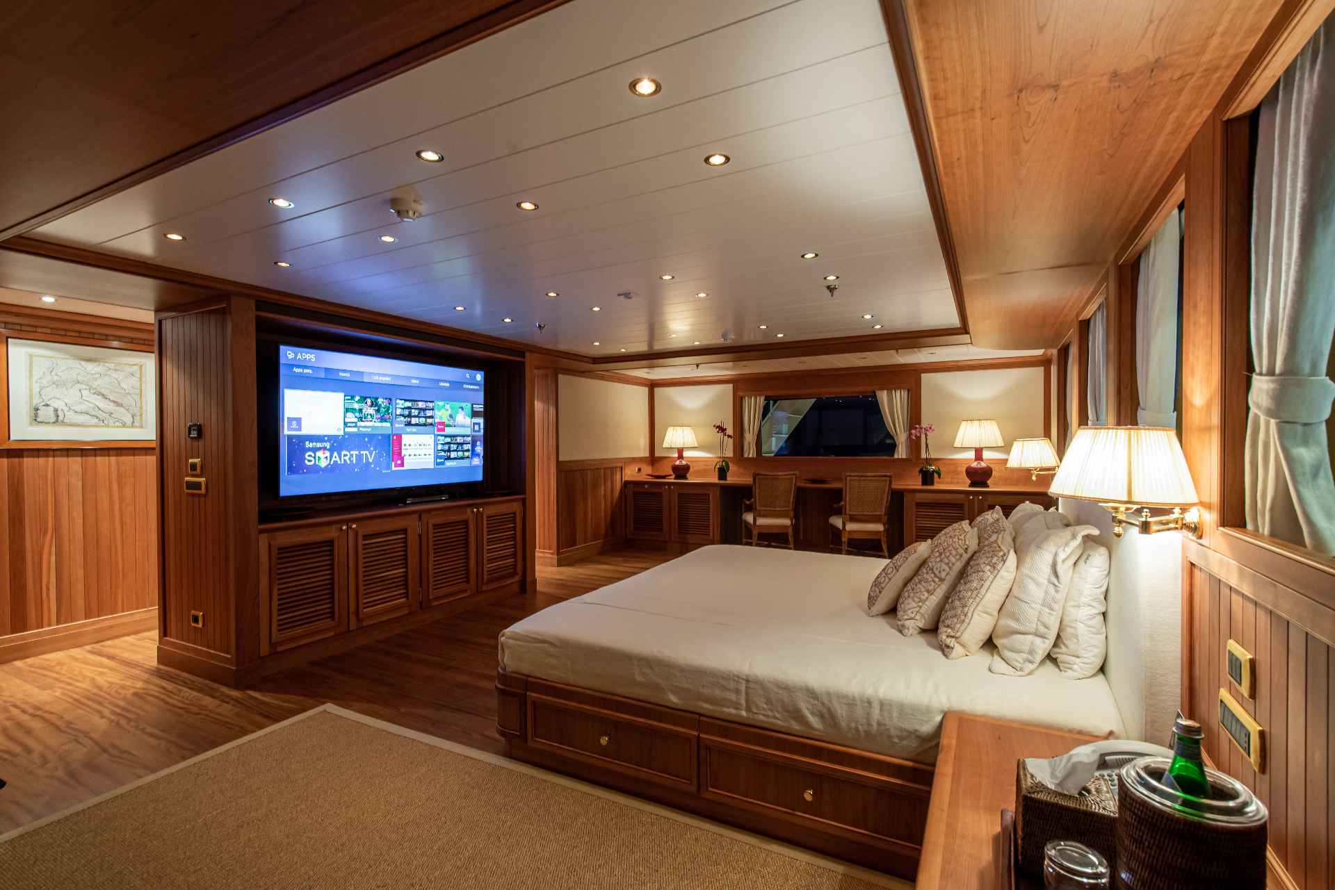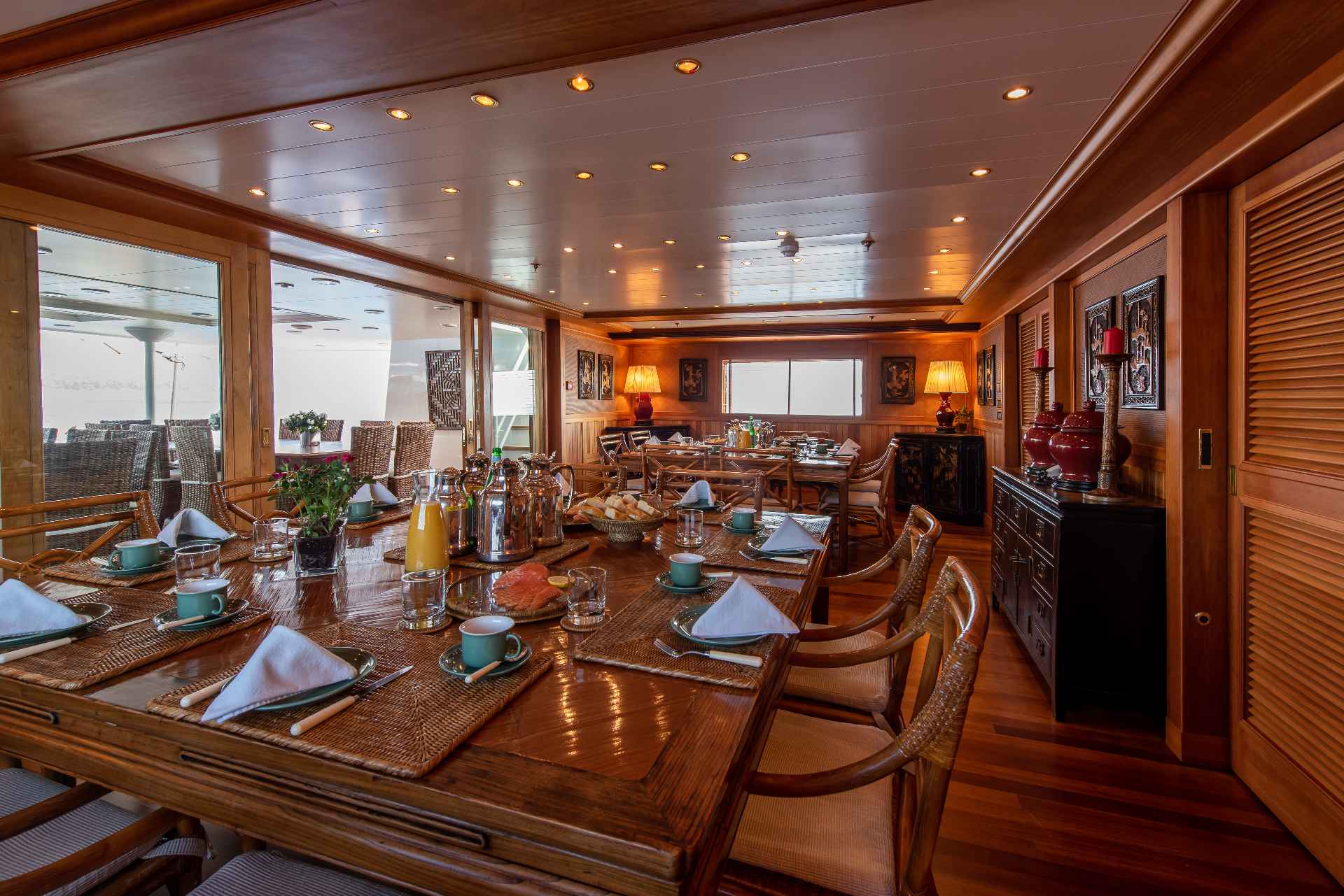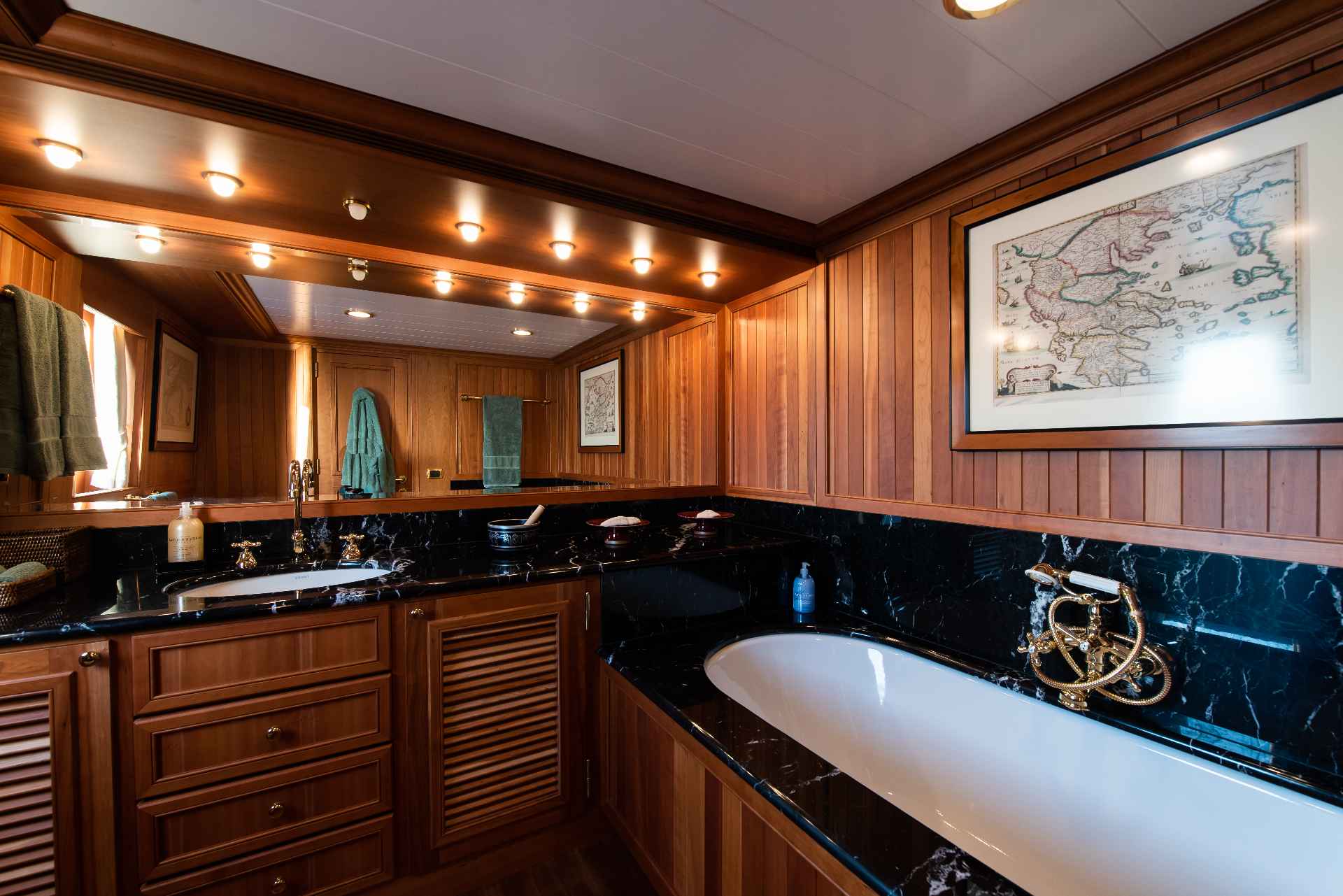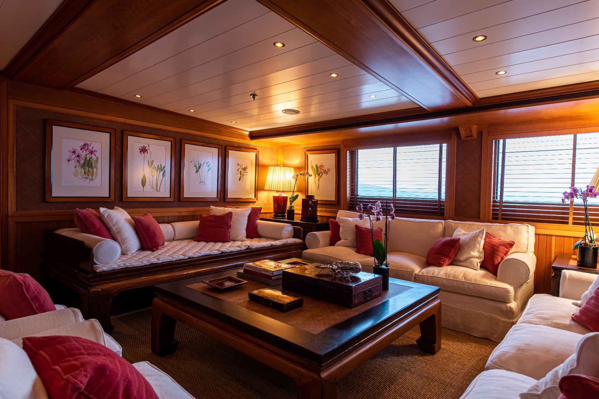 Guest accommodation onboard includes a stunning full-beam Owner’s suite with a private study plus his & hers dressing rooms and ensuite bathrooms, two VIP cabins, six double cabins, two triple cabins and two twin cabins each with an additional Pullman berth. BLEU DE NÎMES also has two staff cabins plus accommodation for her 23-person crew on the lower decks.