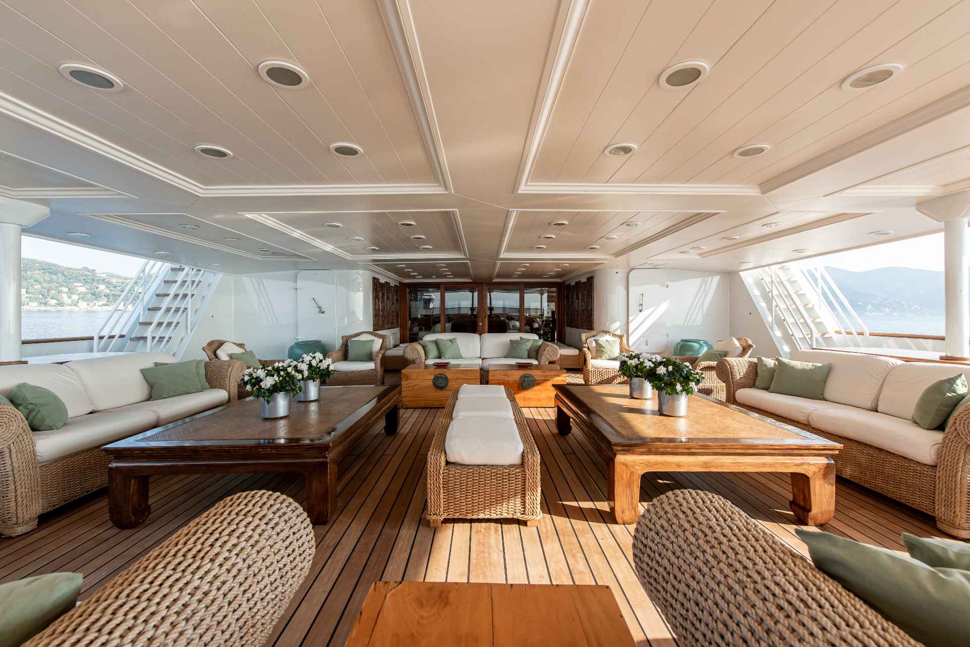 BLEU DE NÎMES’ interior is more than matched by her spacious exterior which offers guests a choice of outdoor living areas plus a touch-and-go helipad for easy transfers to shore. On the upper deck, a large dining area can seat up to 36 guests for al fresco lunches while up on the sundeck an outdoor lounge area features two spa pools. Her vast beach club offers direct access to the water when swimming or using the vast collection of toys, tenders and diving equipment.