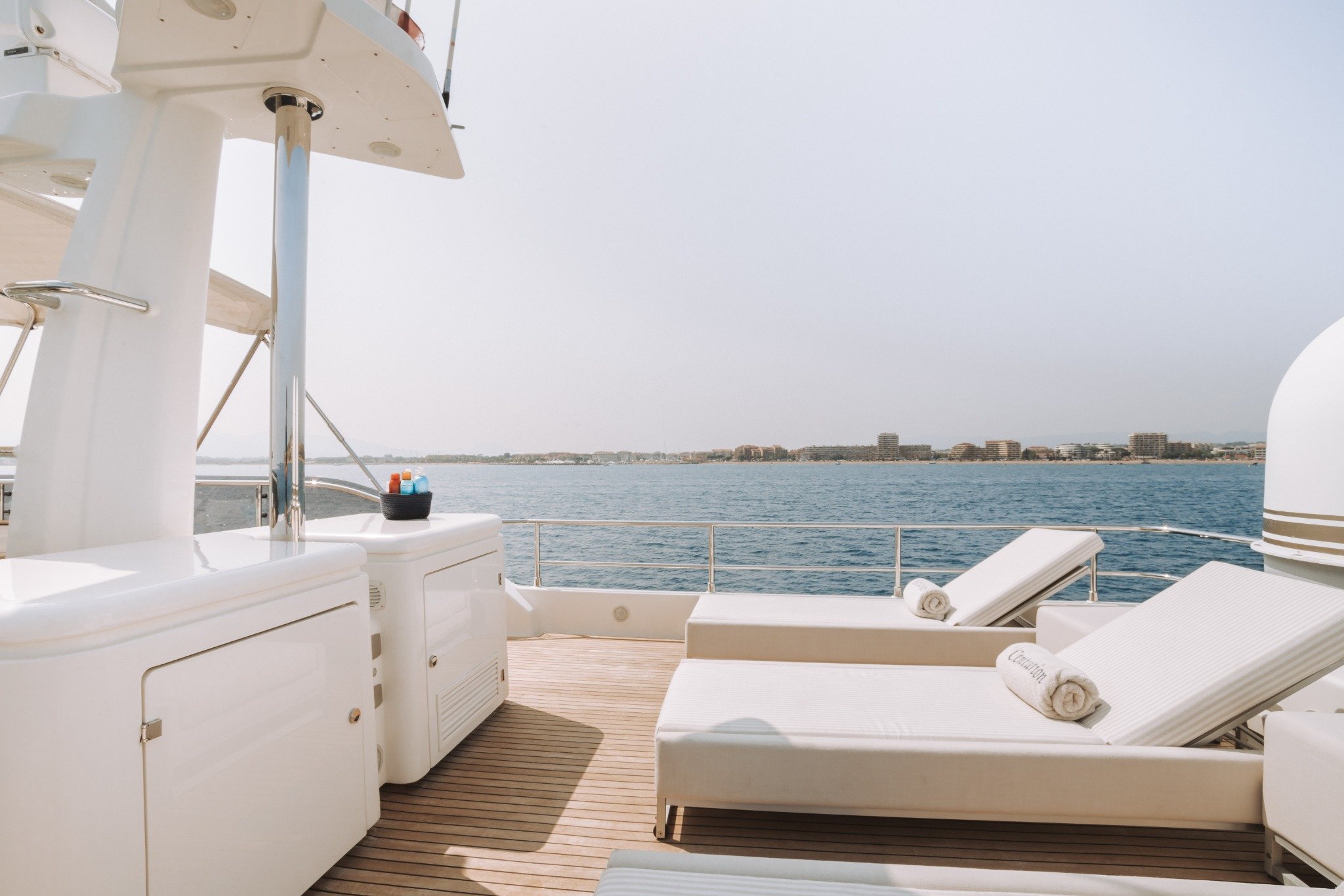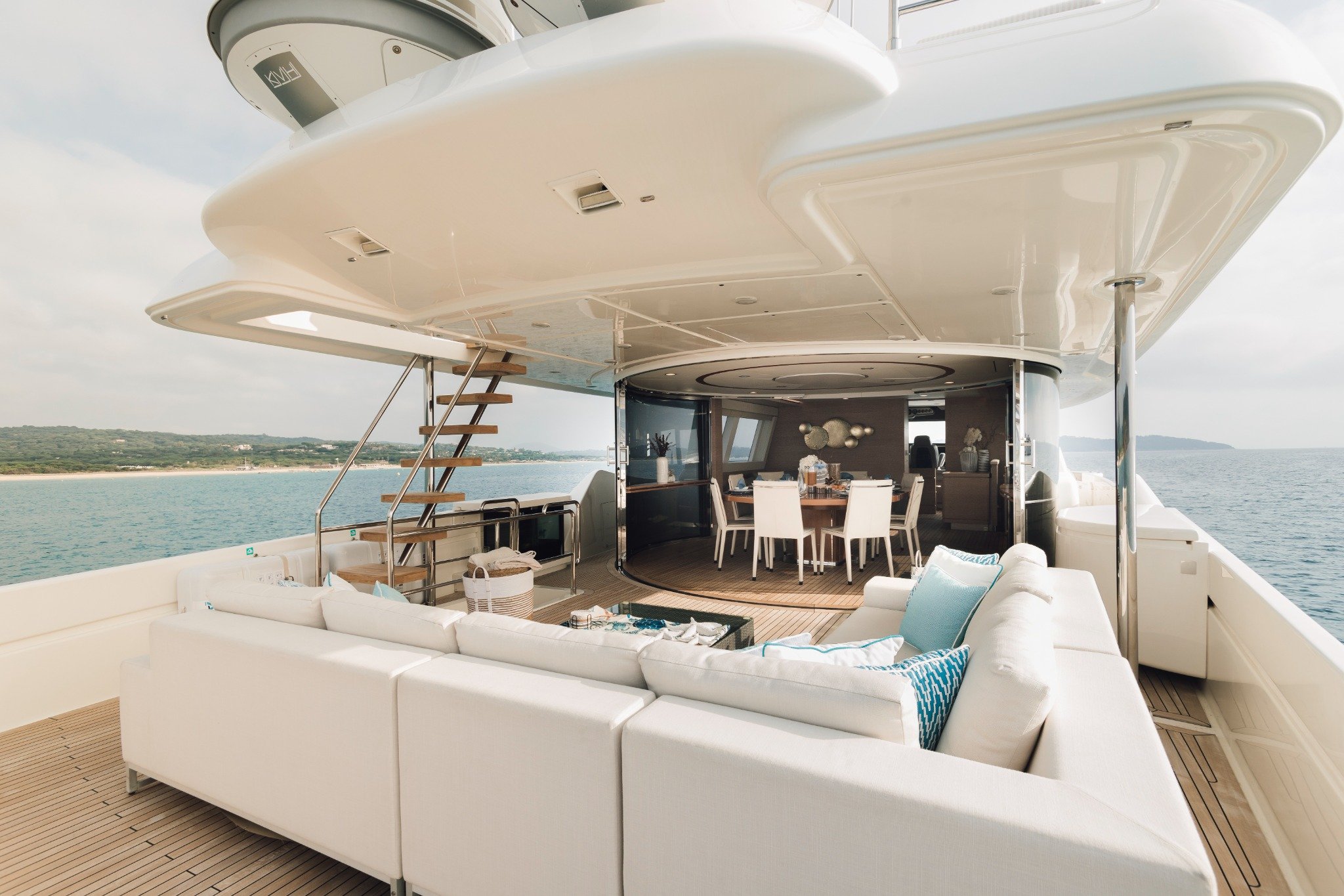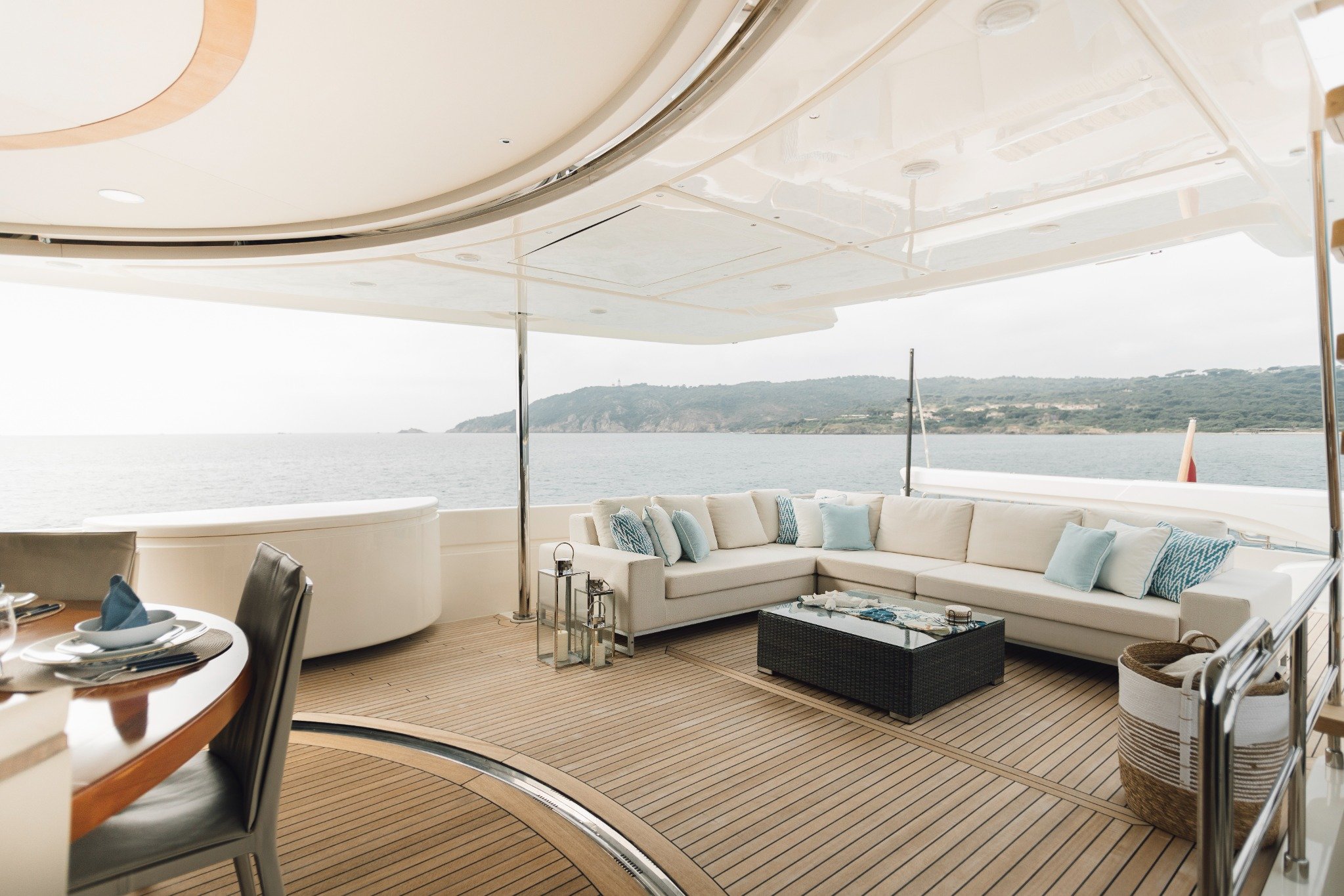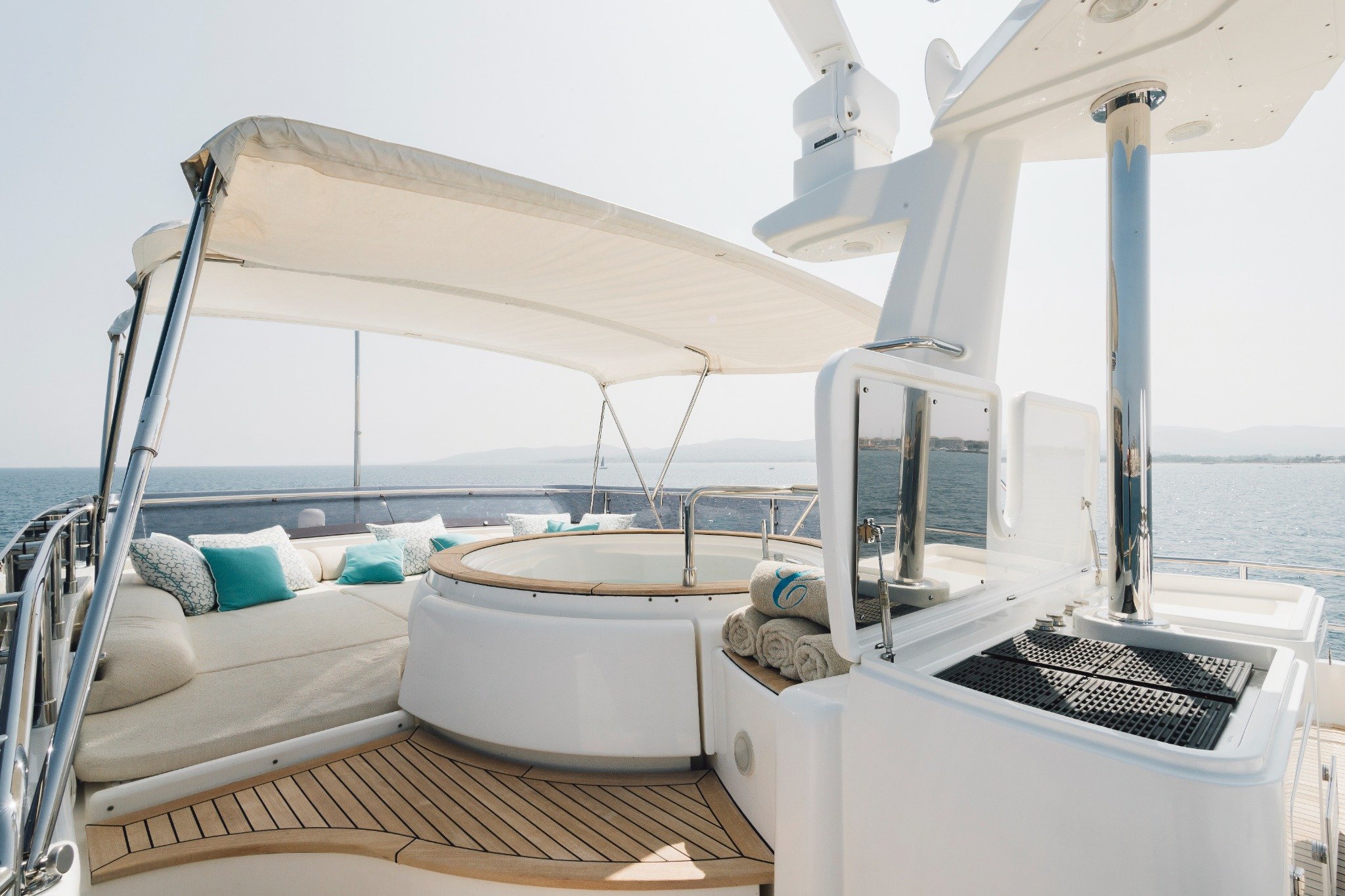 Moving up to the sundeck, guests will find a jacuzzi, sunbeds, spacious sun pad area and a fully equipped BBQ, perfect for casual outdoor dining experiences and relaxation. A Bimini provides shelter from the sun while still allowing guests to enjoy refreshing breezes.
