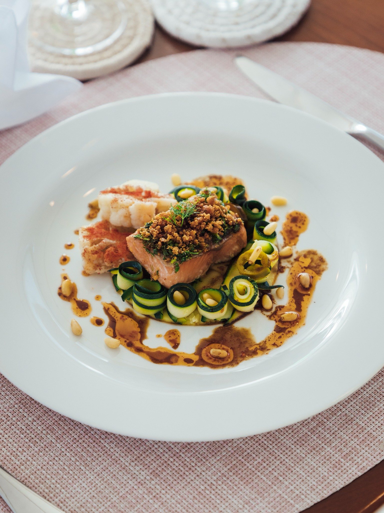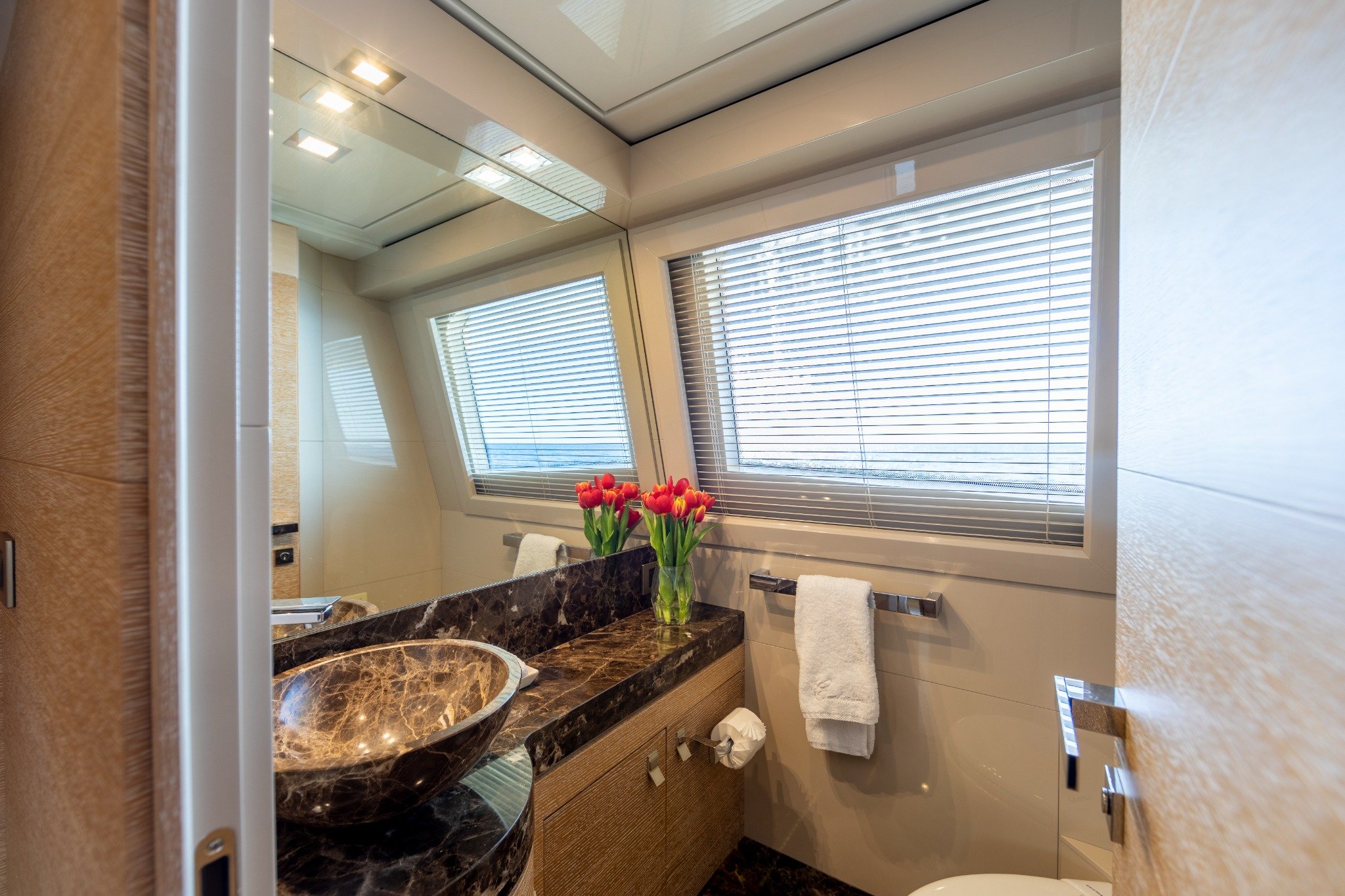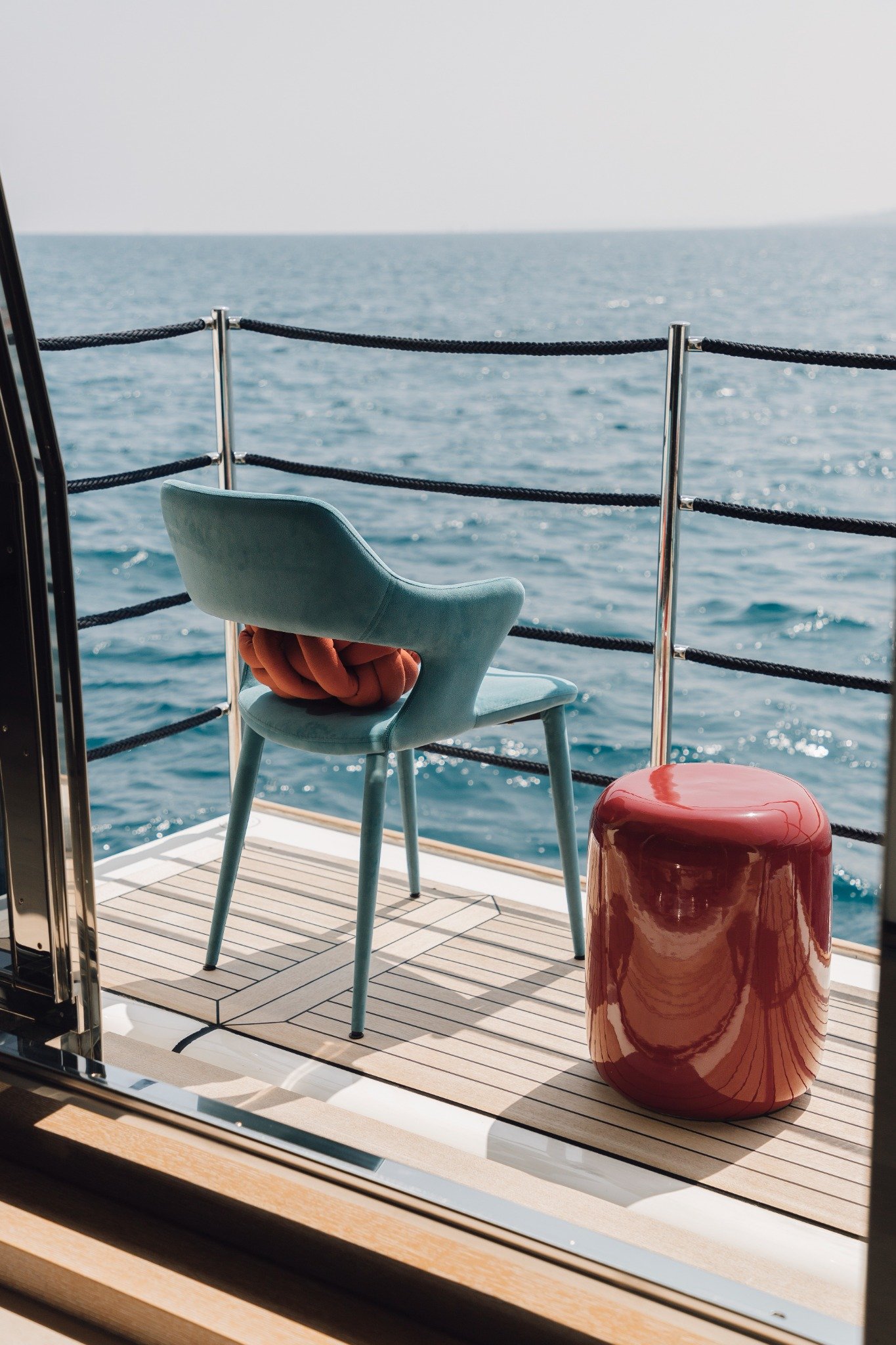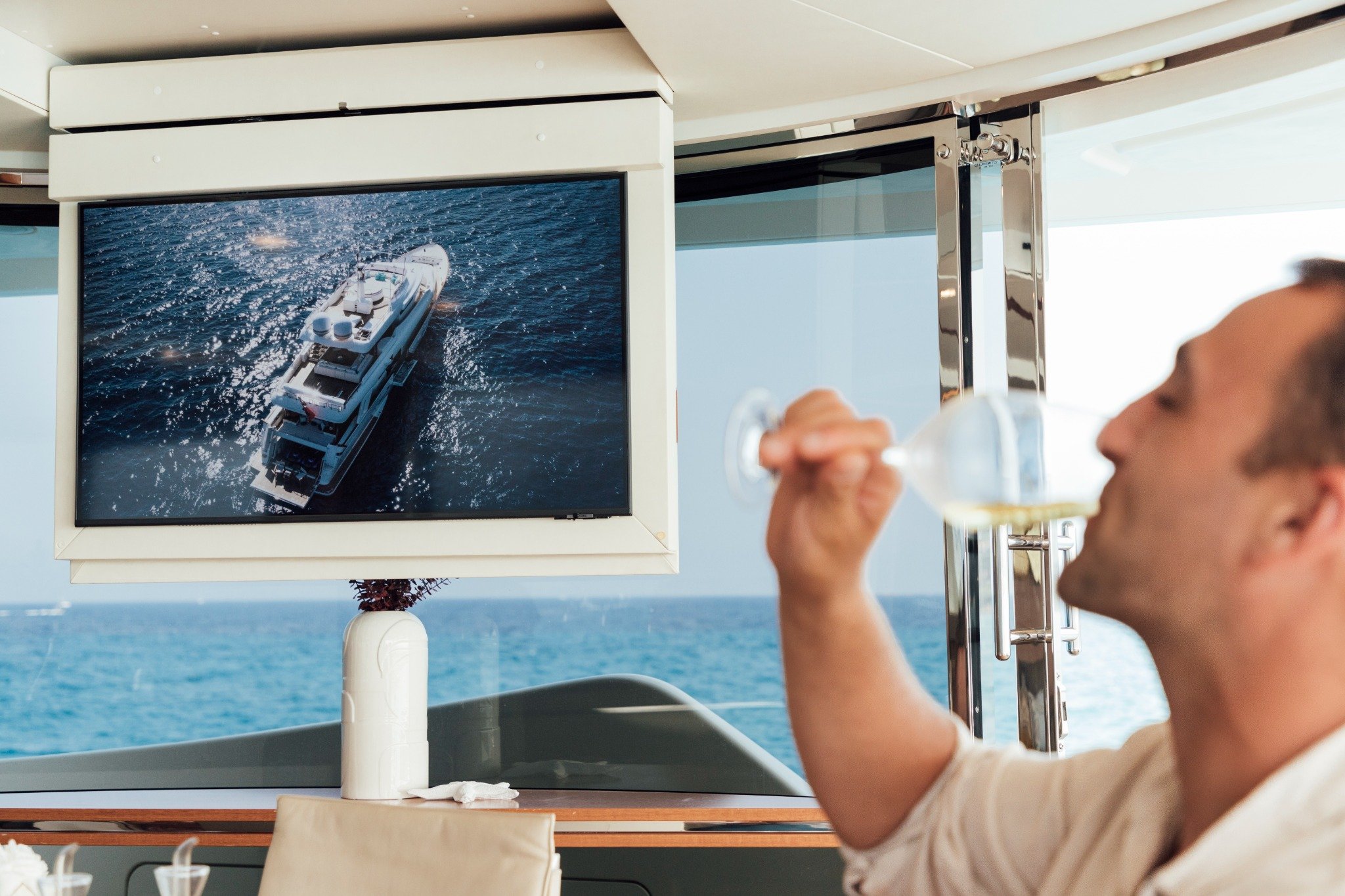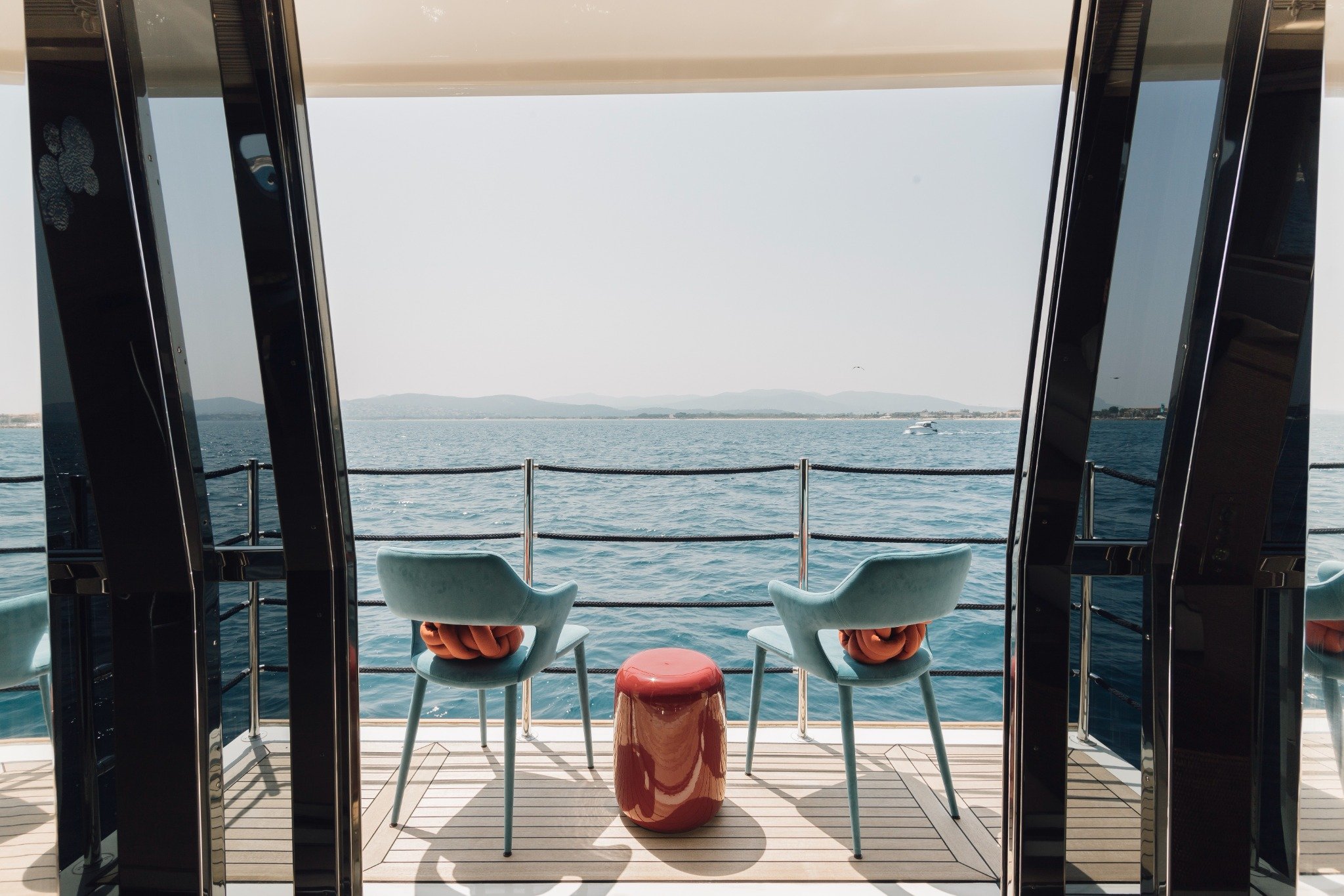 The main deck features spacious seating areas, floor-to-ceiling windows that flood the interior with natural light, as well as folding side balcony, offering a truly immersive and inviting atmosphere for all who come onboard. There is a smaller dining table which can be used as an office as well as a day head.