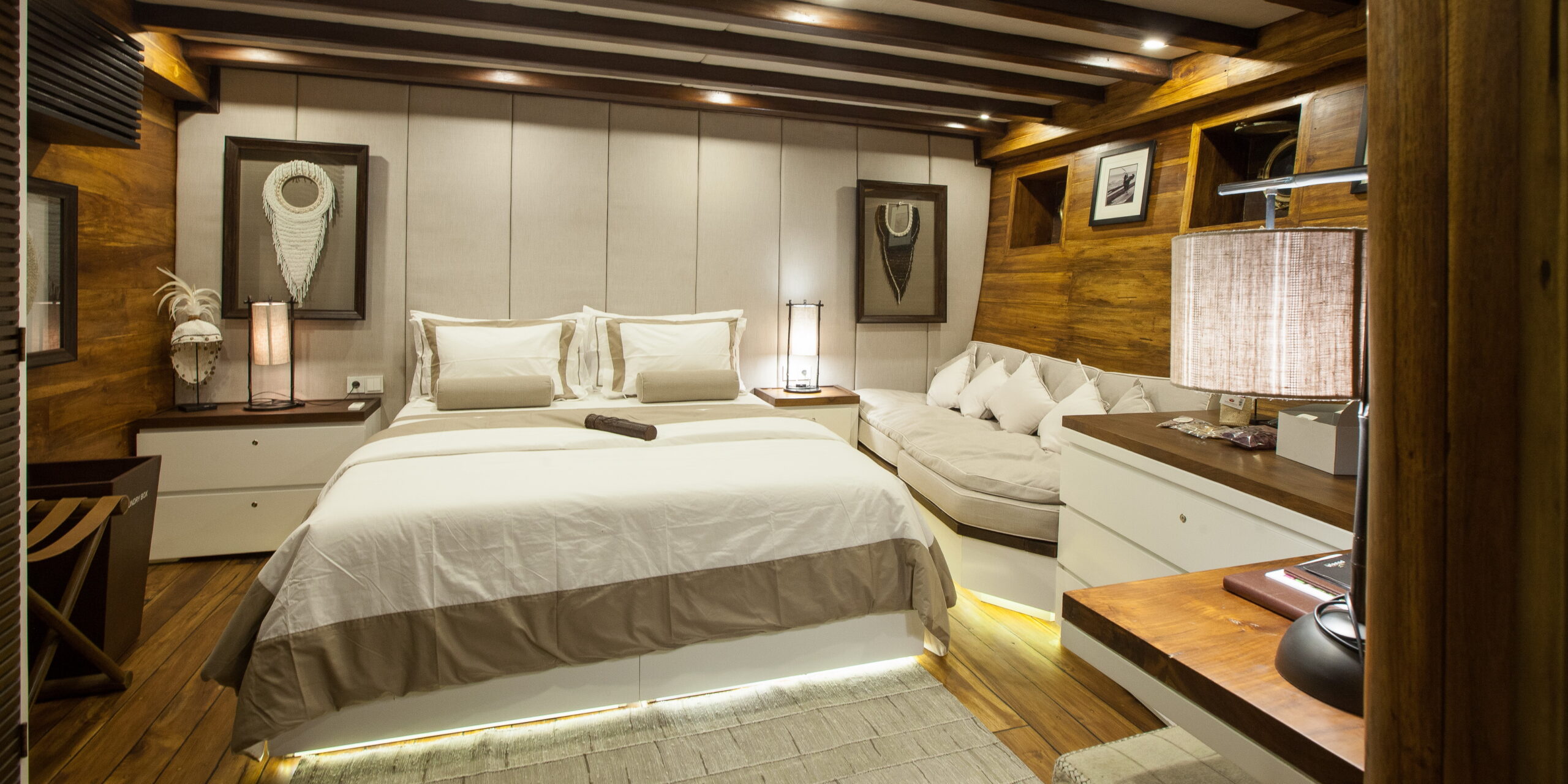 PRANA’s stunning interior is characterised by a feel inspired by serenity, simplicity and style providing guests with every contemporary luxury, not often found on similar Phinisi builds. Soft linens in taupe and cream, paired with authentic colonial woods lend the interior an all-round plush and intimate sensation, impressively achieved in spite of the vessel’s generous size.