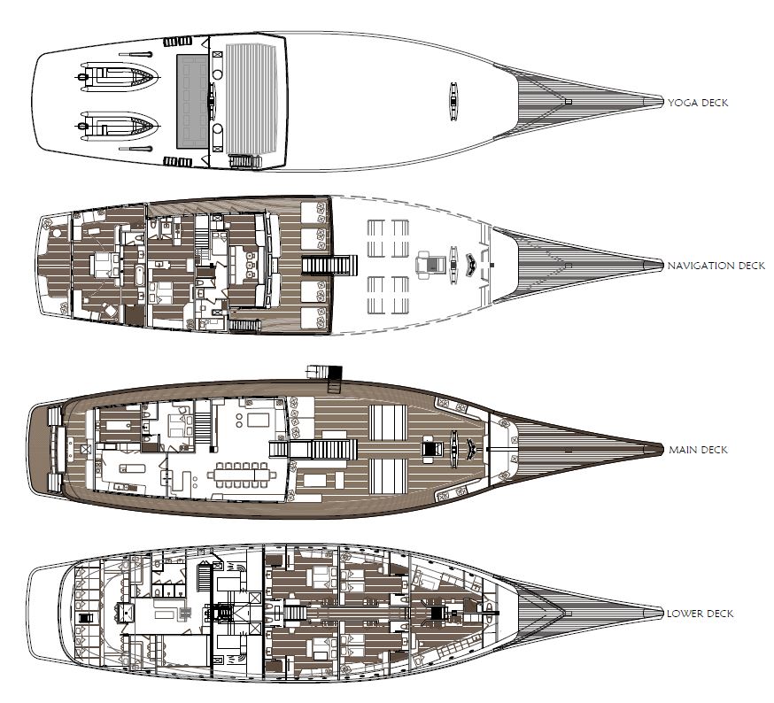 Most notably, her 77m2 elegant master cabin, located on the upper deck, offers full 180 degree views, offering an outlook like no other and access to a spacious 20sqm private terrace facing aft. A  generous ensuite completes this cabin, offering twin vanities and a double rain shower.