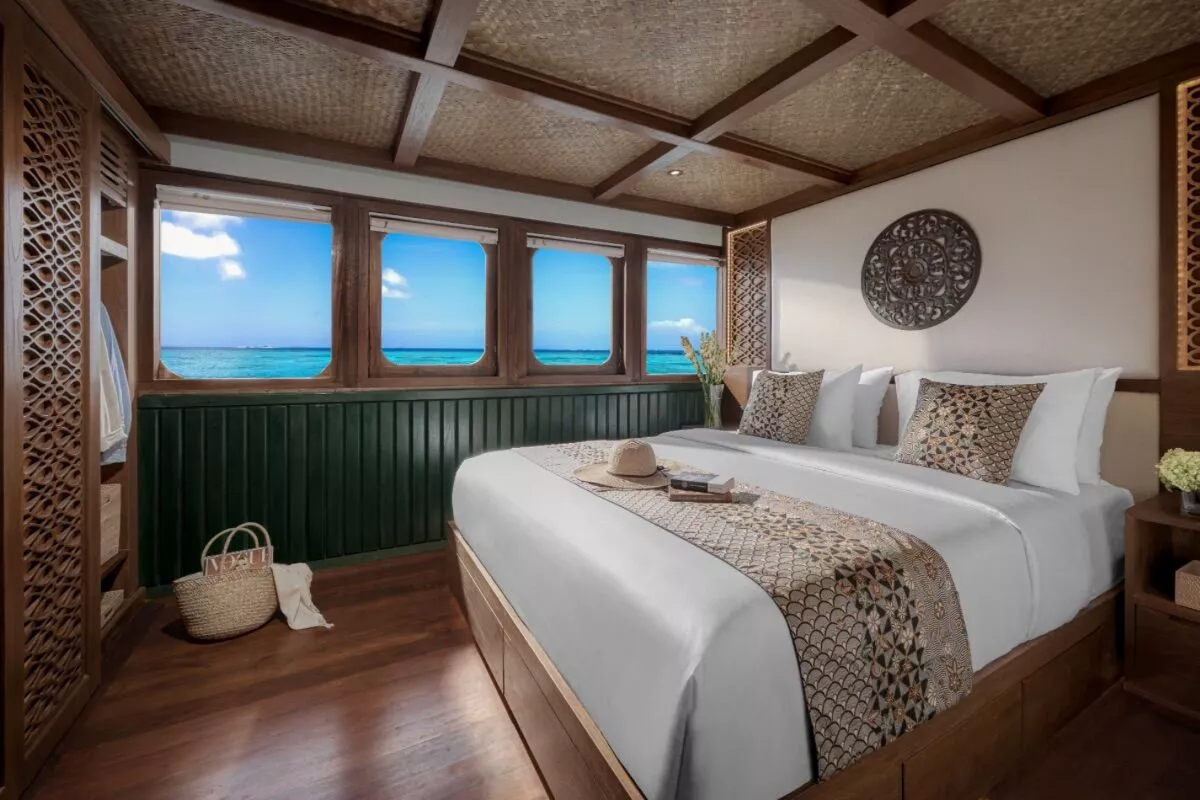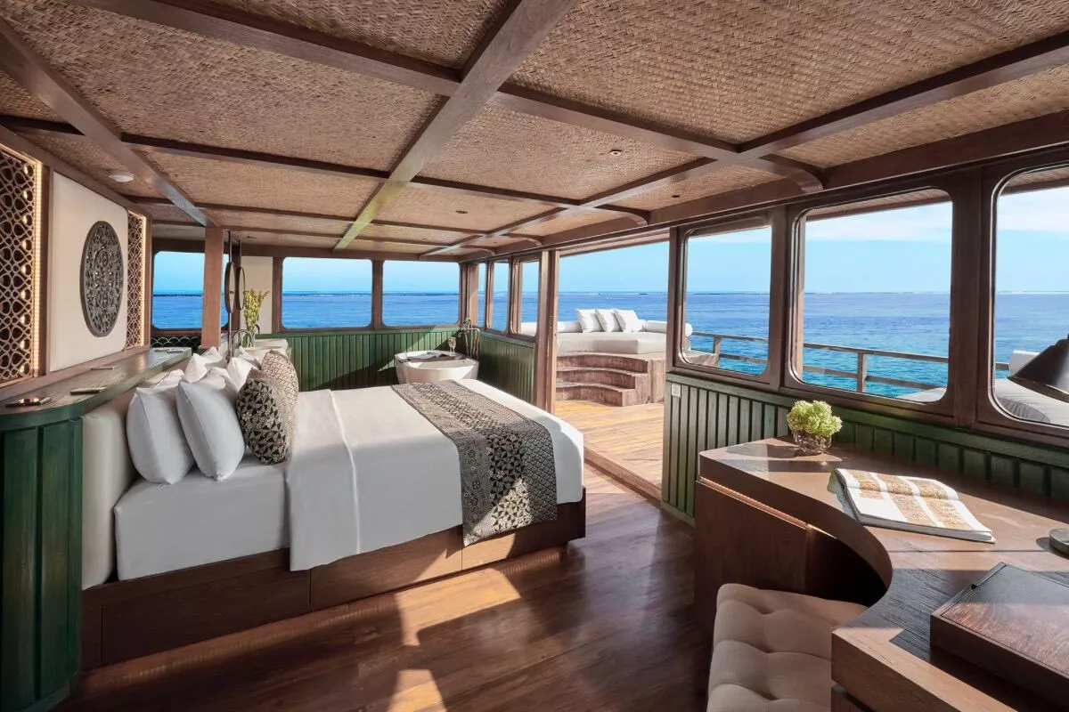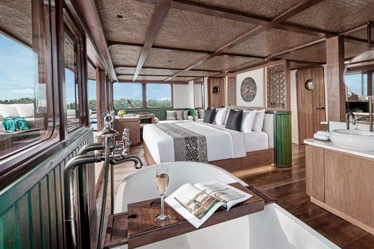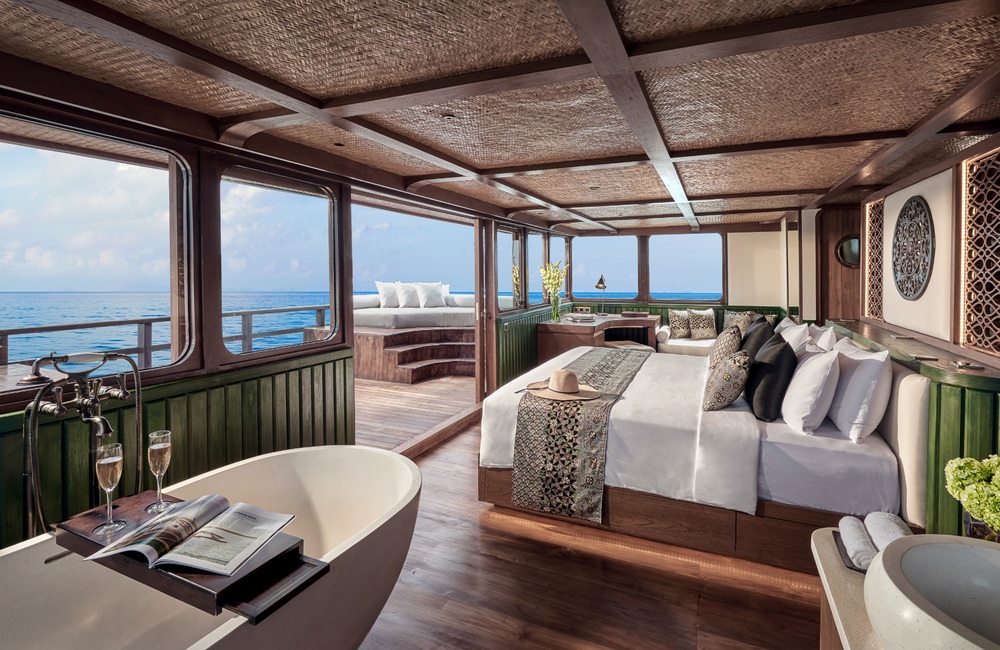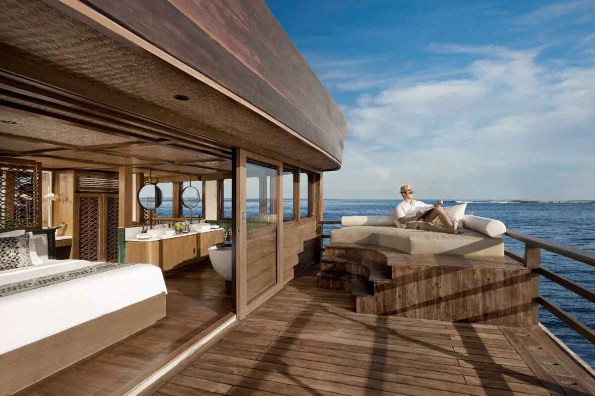 Situated on the upper deck, SAMSARA SAMUDRA’s superb master suite is a bright and open space finished in chic cream with exposed beams and carved fretwork on the walls. Opening onto a delightful private terrace with raised sunpads overlooking the ocean, the master stateroom also features a lounge area and an open-concept bathroom with a free-standing bathtub.