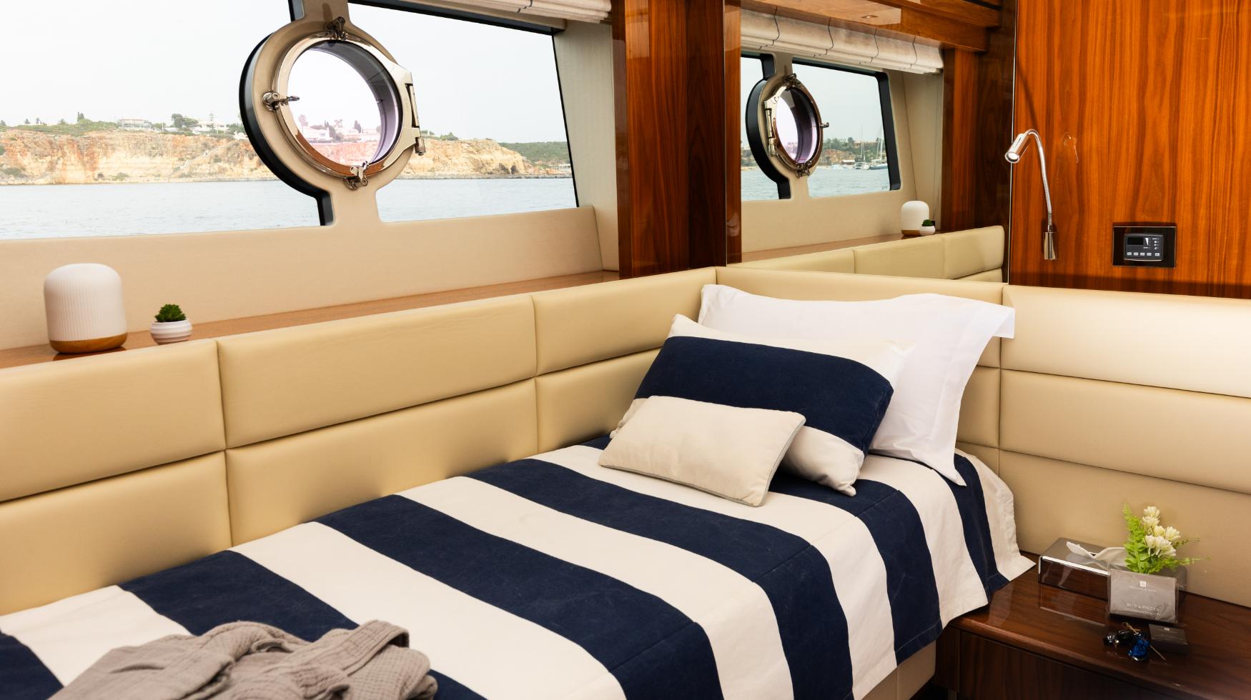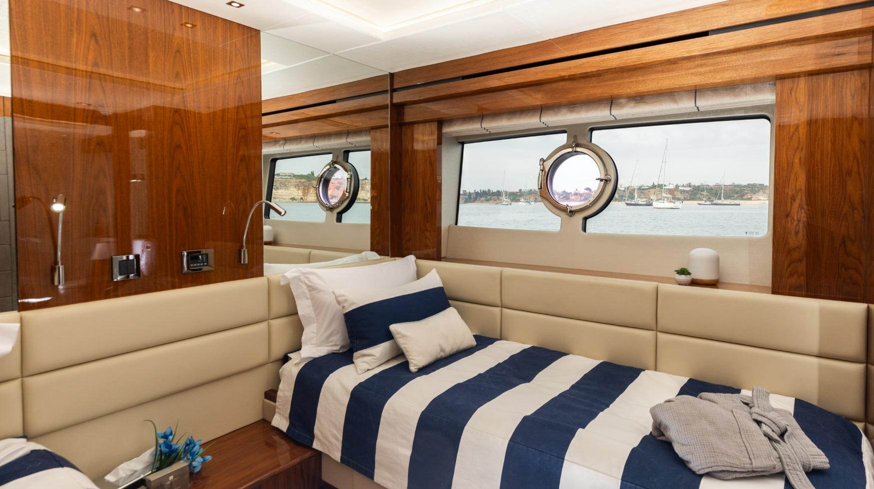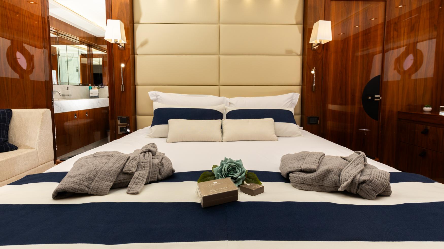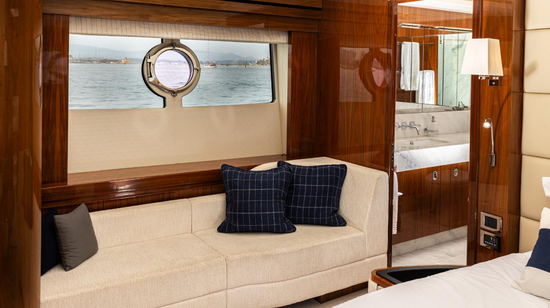 Styled by the in-house team at Sunseeker, STARDUST OF MARY’s contemporary interior is warm and welcoming, the perfect blend of style and comfort. Polished walnut panelling is paired with cream leather for a sophisticated feel while oversized windows throughout the main deck fill the living space with natural light. Sliding glass doors lead from the main deck aft into STARDUST OF MARY’s large open-plan salon. Featuring a comfortable seating area centred around two glossy wood coffee tables, the salon is equipped with a full entertainment system with Apple TV plus the very latest Fusion audio system. Forward of the lounge you’ll find an elegant formal dining area with seating for up to eight guests. Full-length windows connect the dining area with the exterior living space while doors lead through to the galley which features a cosy breakfast bar and an informal dining area which offers sweeping views of your destination.