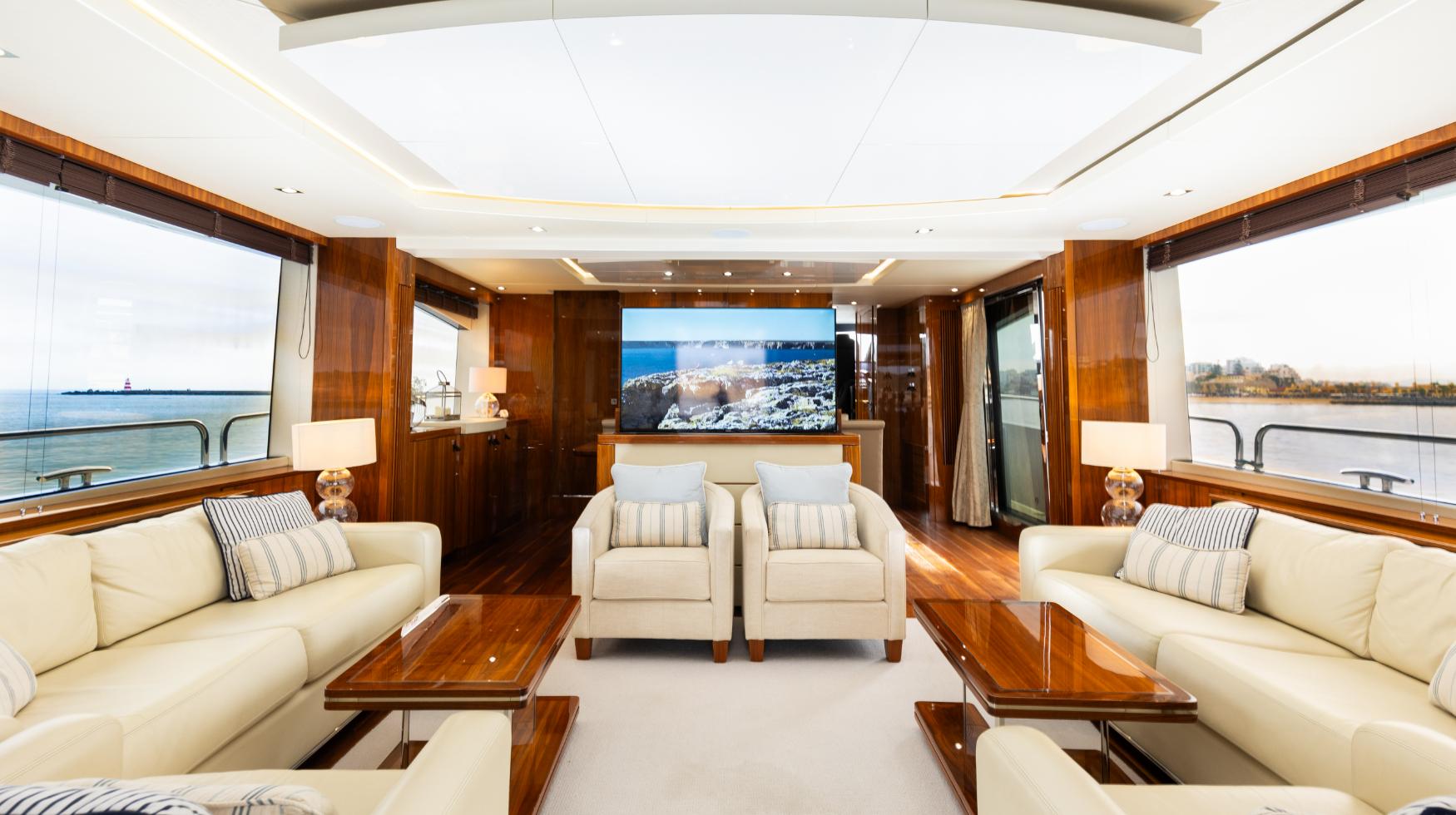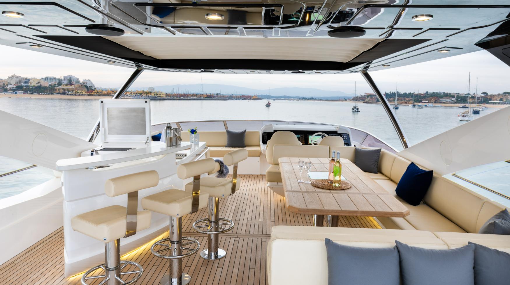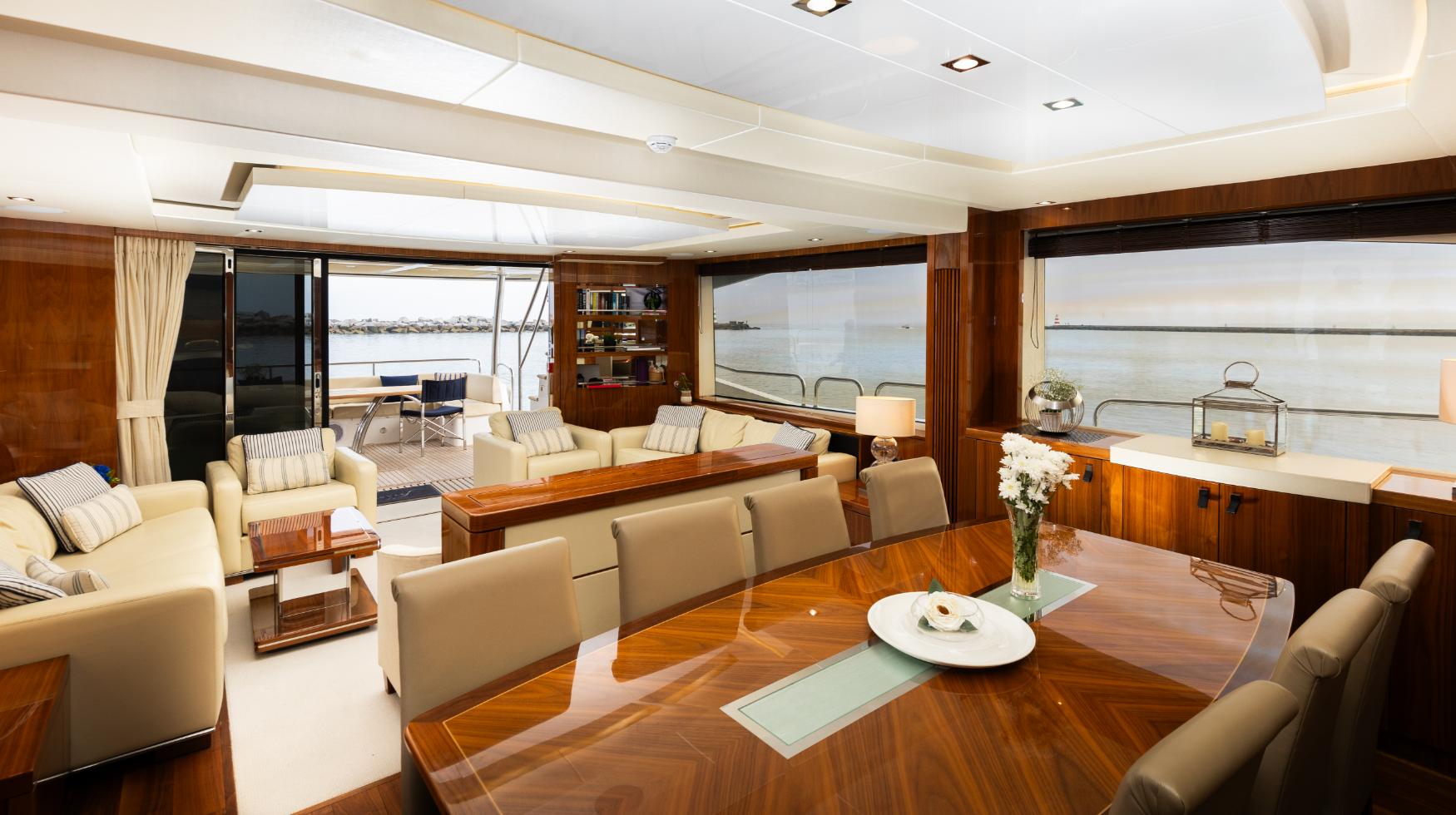 Styled by the in-house team at Sunseeker, STARDUST OF MARY’s contemporary interior is warm and welcoming, the perfect blend of style and comfort. Polished walnut panelling is paired with cream leather for a sophisticated feel while oversized windows throughout the main deck fill the living space with natural light. Sliding glass doors lead from the main deck aft into STARDUST OF MARY’s large open-plan salon. Featuring a comfortable seating area centred around two glossy wood coffee tables, the salon is equipped with a full entertainment system with Apple TV plus the very latest Fusion audio system. Forward of the lounge you’ll find an elegant formal dining area with seating for up to eight guests. Full-length windows connect the dining area with the exterior living space while doors lead through to the galley which features a cosy breakfast bar and an informal dining area which offers sweeping views of your destination.