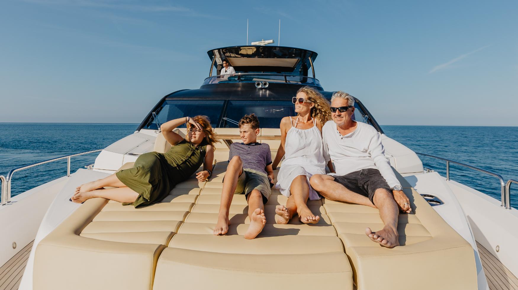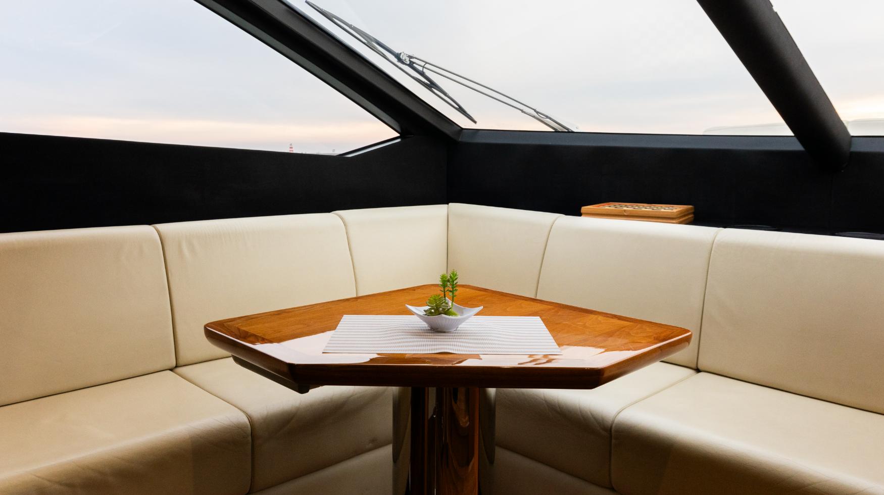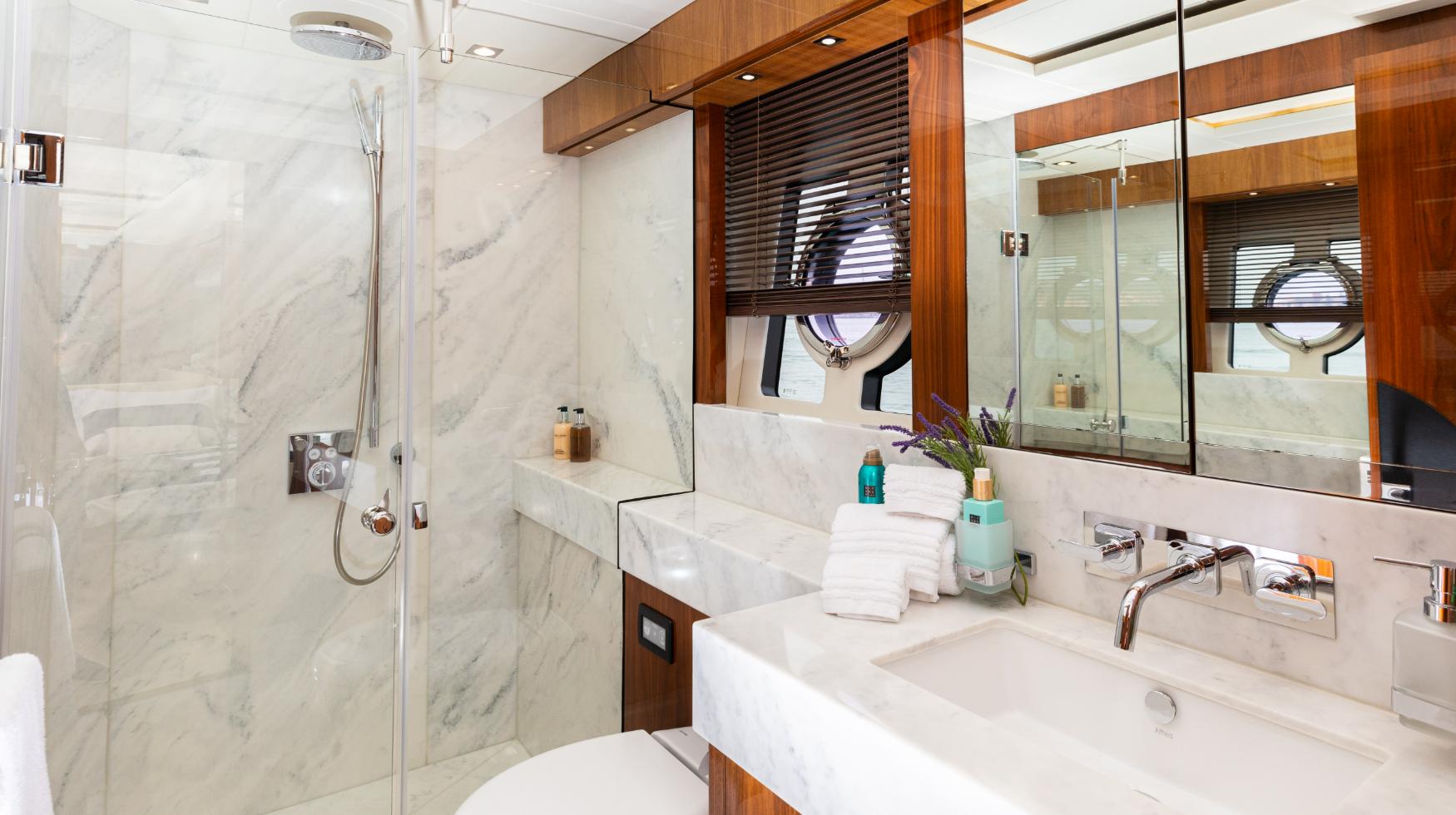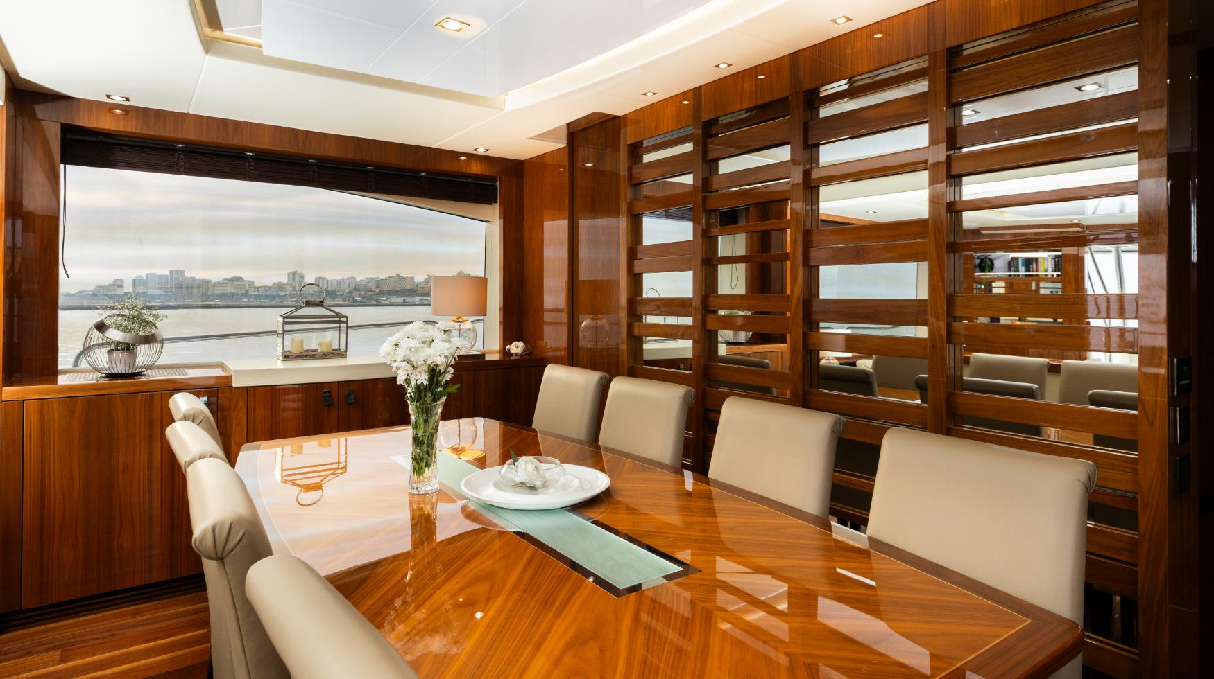 Styled by the in-house team at Sunseeker, STARDUST OF MARY’s contemporary interior is warm and welcoming, the perfect blend of style and comfort. Polished walnut panelling is paired with cream leather for a sophisticated feel while oversized windows throughout the main deck fill the living space with natural light. Sliding glass doors lead from the main deck aft into STARDUST OF MARY’s large open-plan salon. Featuring a comfortable seating area centred around two glossy wood coffee tables, the salon is equipped with a full entertainment system with Apple TV plus the very latest Fusion audio system. Forward of the lounge you’ll find an elegant formal dining area with seating for up to eight guests. Full-length windows connect the dining area with the exterior living space while doors lead through to the galley which features a cosy breakfast bar and an informal dining area which offers sweeping views of your destination.