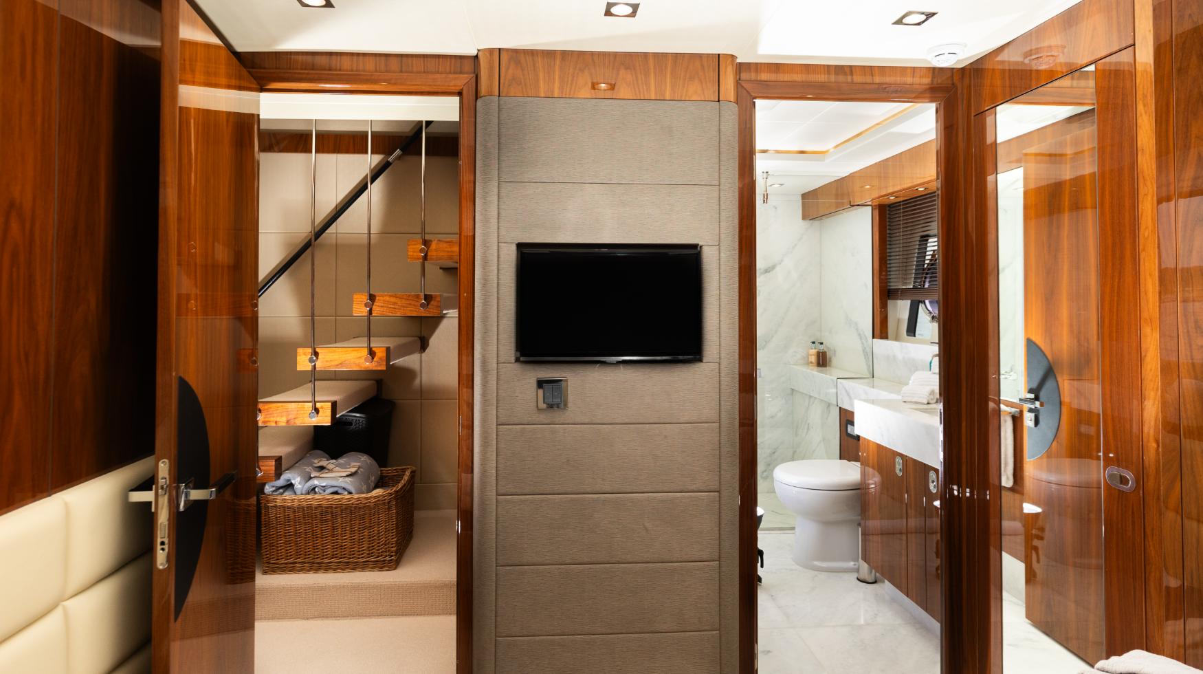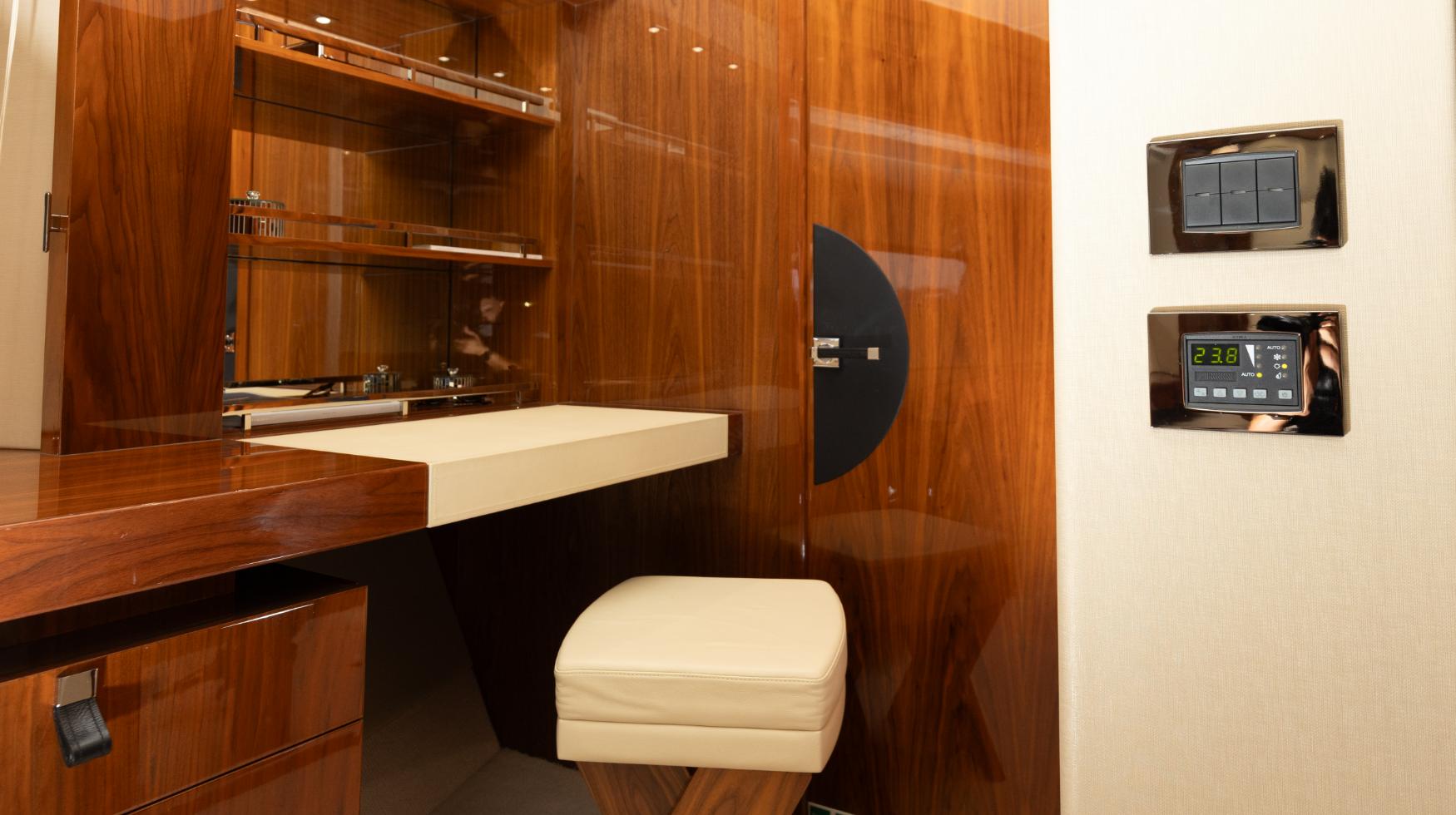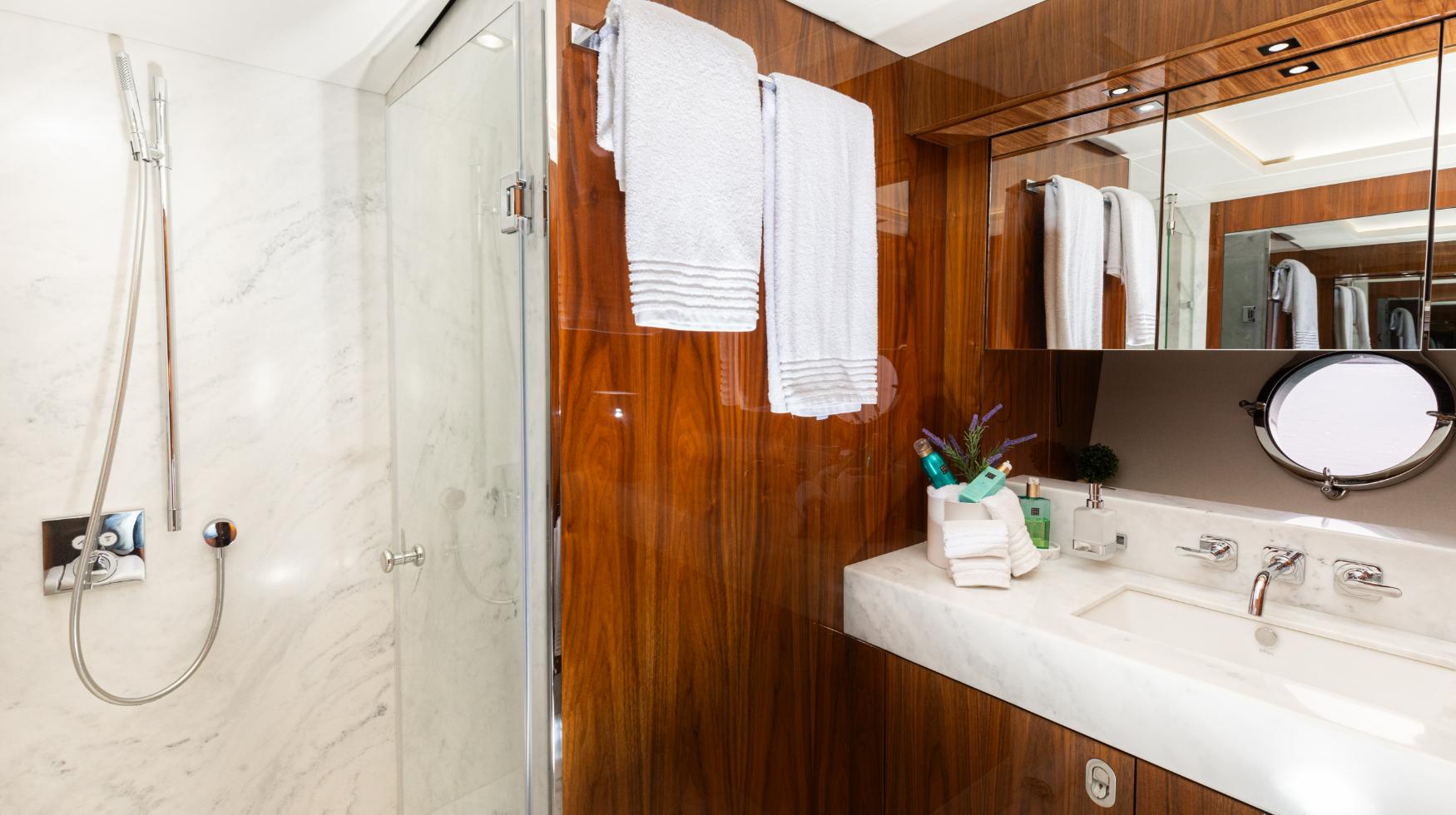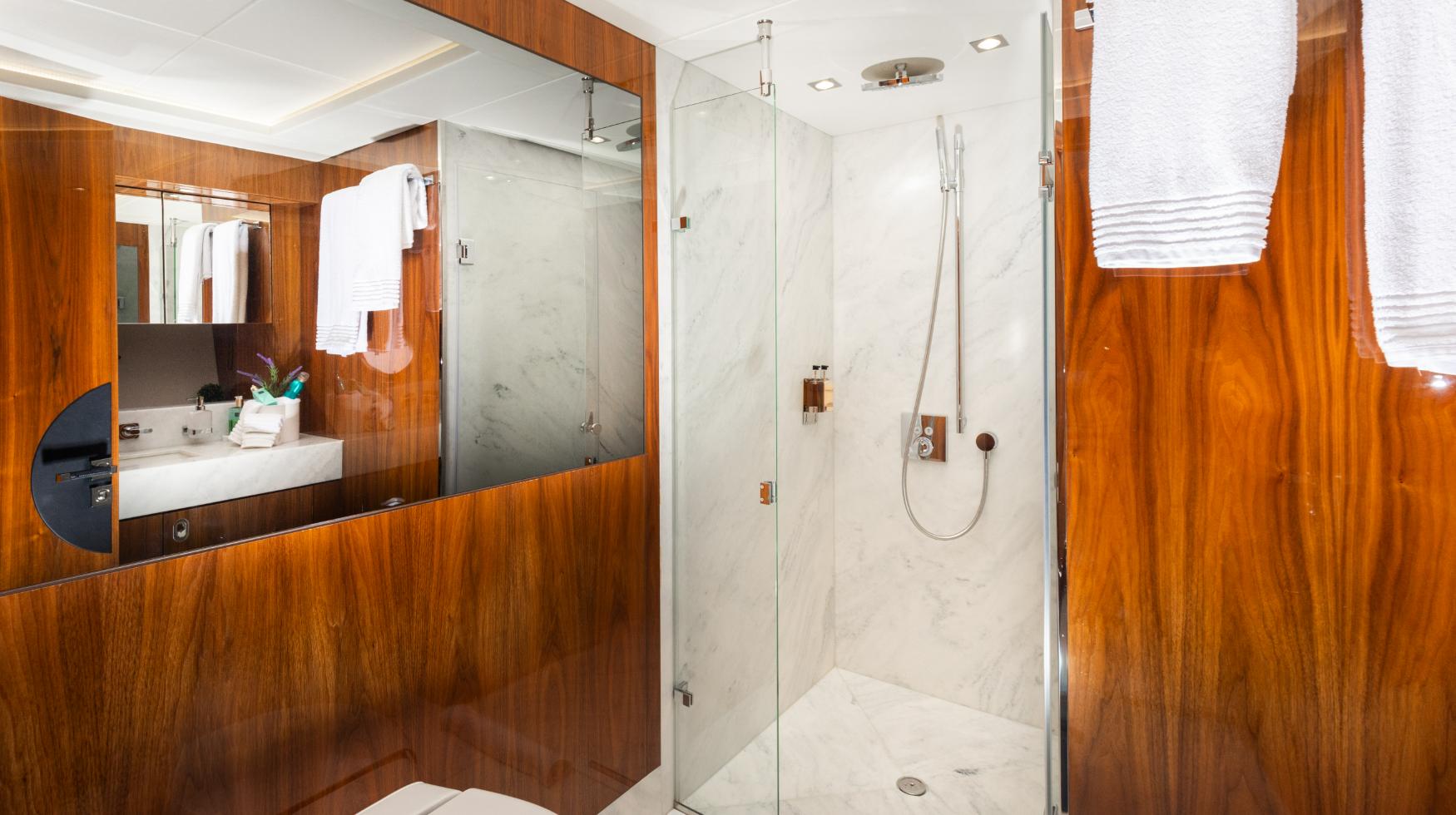 With the generous interior volume of a much larger yacht, STARDUST OF MARY can welcome up to eight guests onboard overnight and ten guests aboard when cruising. She also has accommodation for her full-time professional four-person crew on the lower deck. Situated amidships on the lower deck, STARDUST OF MARY’s master stateroom is a sophisticated space for relaxing after hours. Finished in glossy wood panelling with cream leather accents, the master stateroom features a lounge area overlooking the ocean and opens into a spa-inspired bathroom with a large walk-in shower. STARDUST OF MARY’s guest accommodation includes a VIP cabin forward plus two twin cabins aft which can be converted to doubles as required. Finished with the same glossy panelling as the master stateroom, each of the guest cabins is equipped with a full entertainment system and enjoys ensuite bathroom facilities.