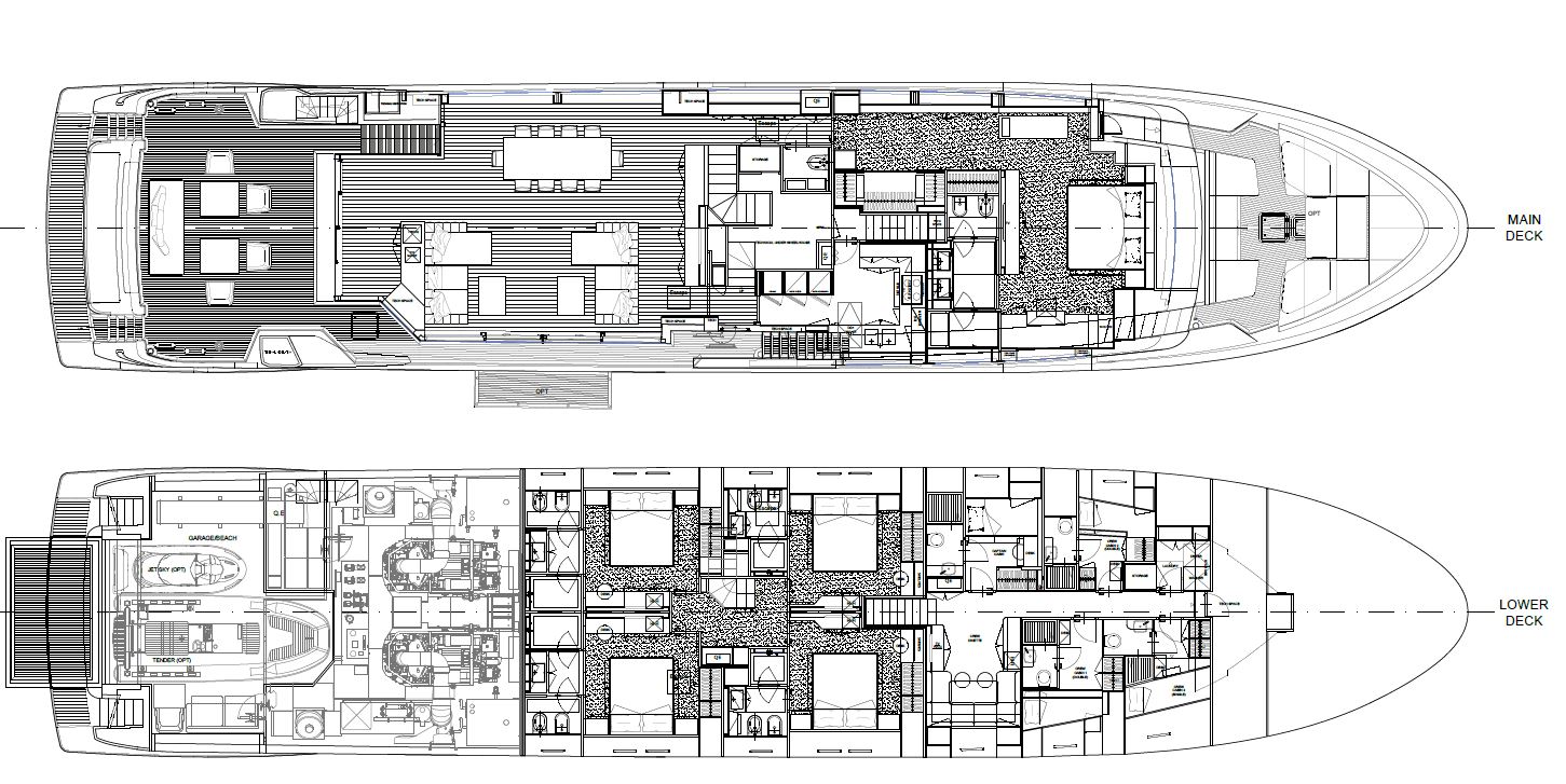 Delivering outstanding performance at sea with a top speed of 26.0 kn and a cruising speed of 15.0 kn, VAUBAN is ready for adventure. A Williams Jet 565 Tender, wakeboard, underwater scooters, an SUP inflatable, an inflatable towable sofa, waterskis and snorkeling gear are available to deliver a jolt of adrenaline when needed, or if guests want to explore hidden coves.