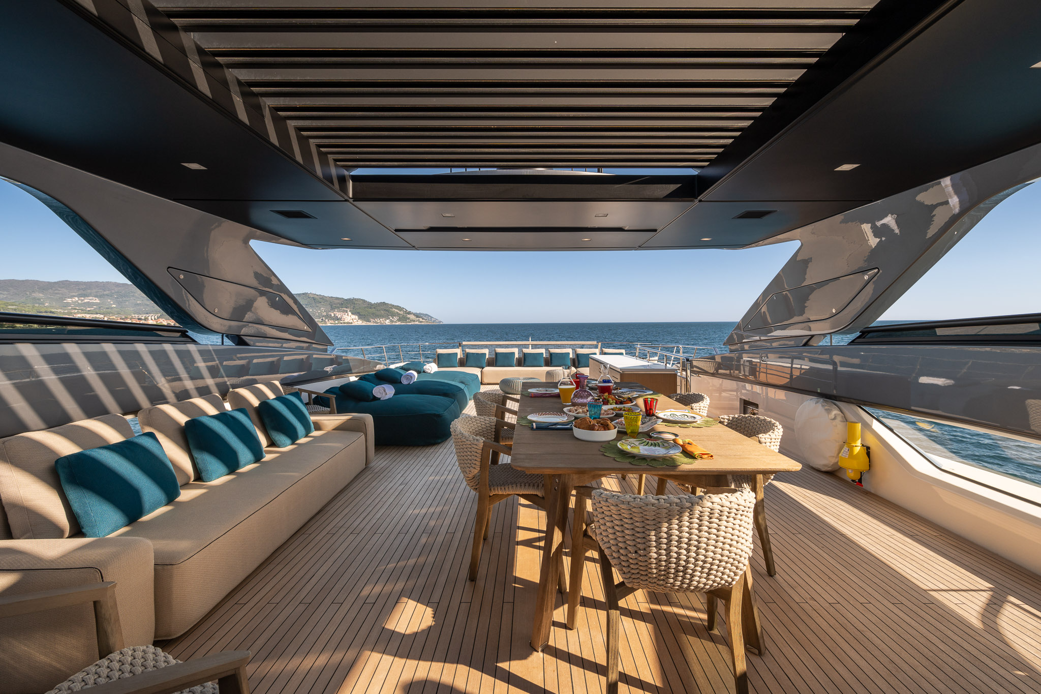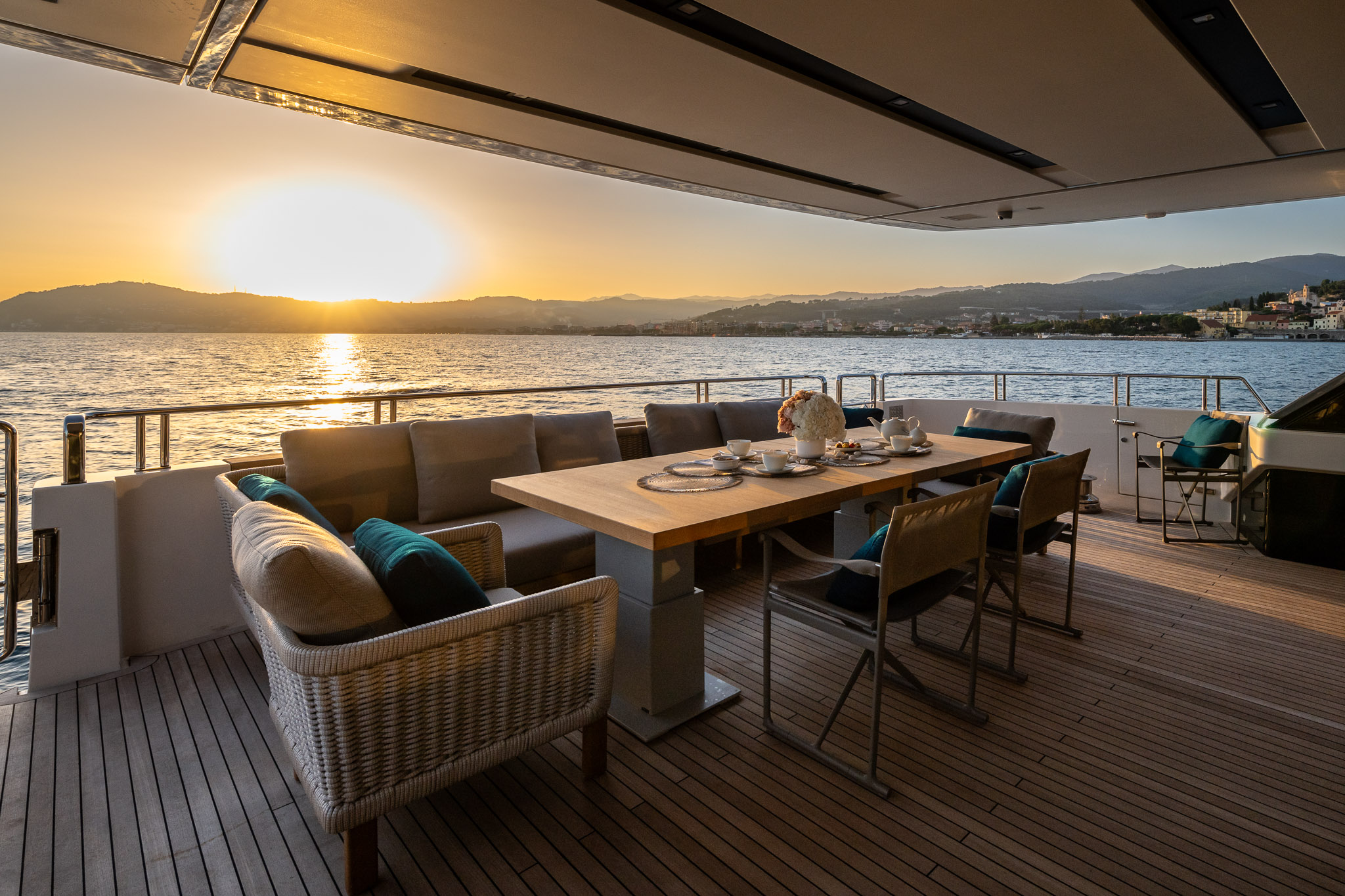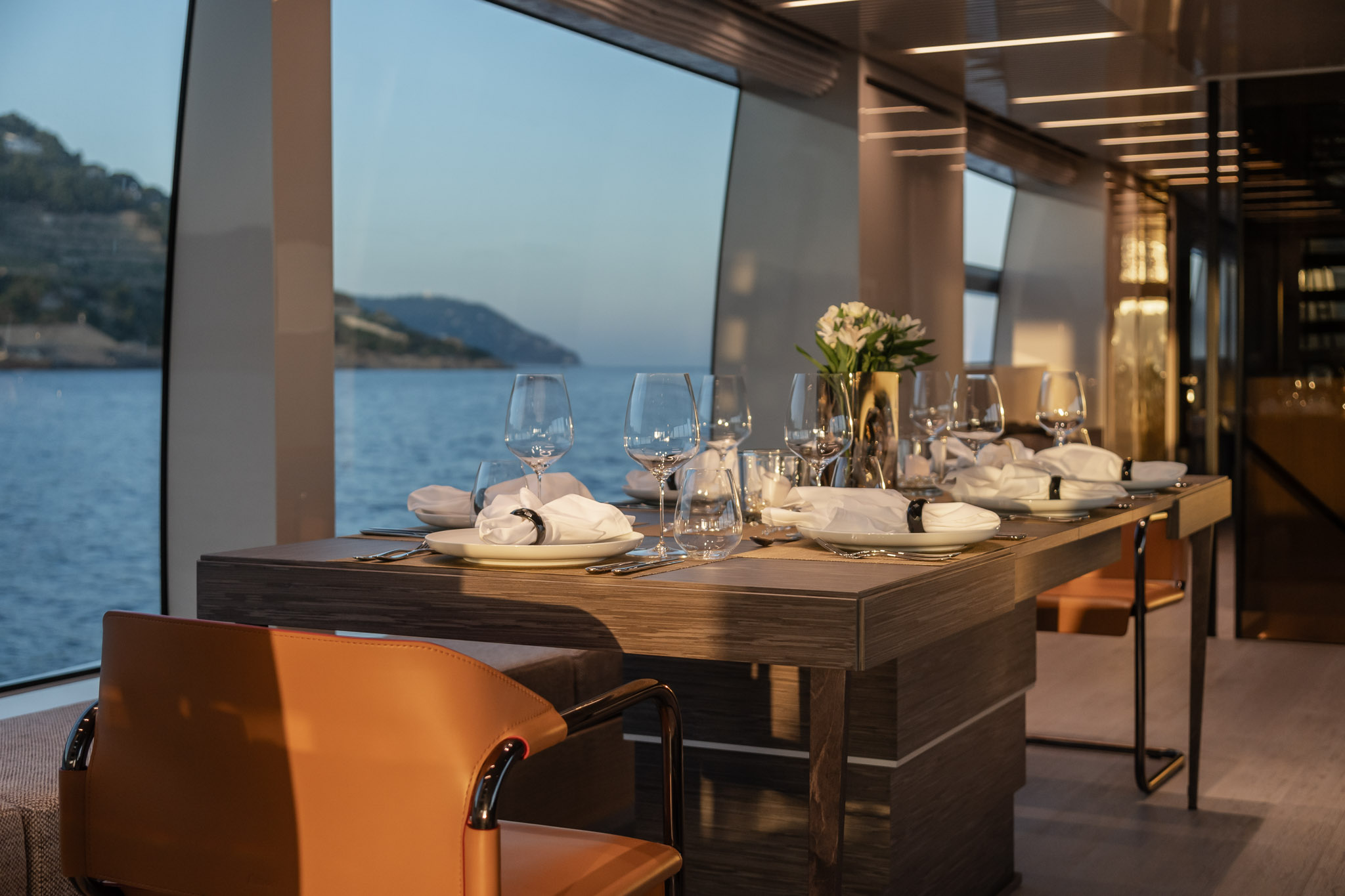 Before dining outside as the sun sets, spend some time unwinding on the flybridge or aft deck. If you prefer the comfort of the luxurious interiors, VAUBAN provides onboard WIFI, complete audiovisual equipment, and a TV outside on the flybridge, guaranteeing a wide range of entertainment options.
