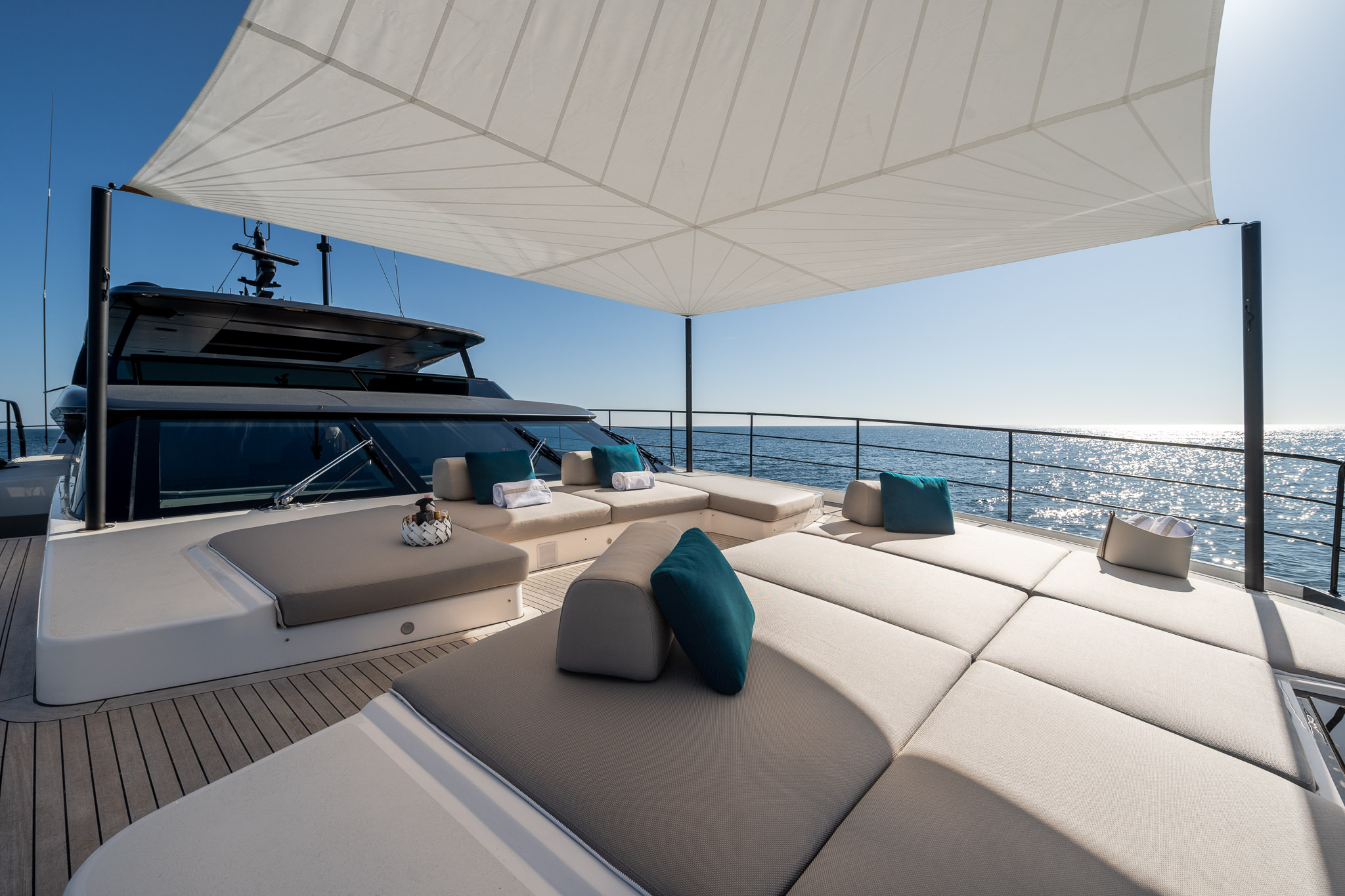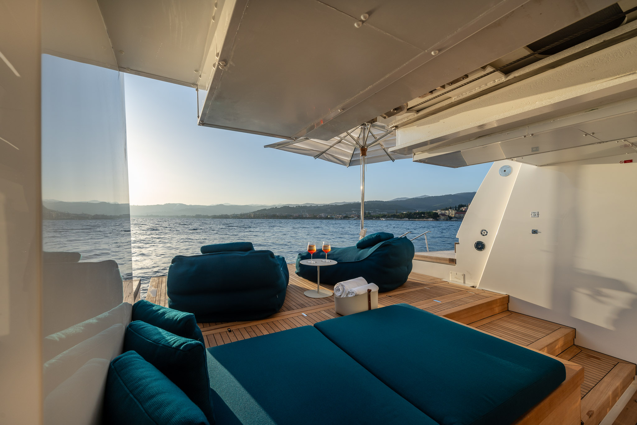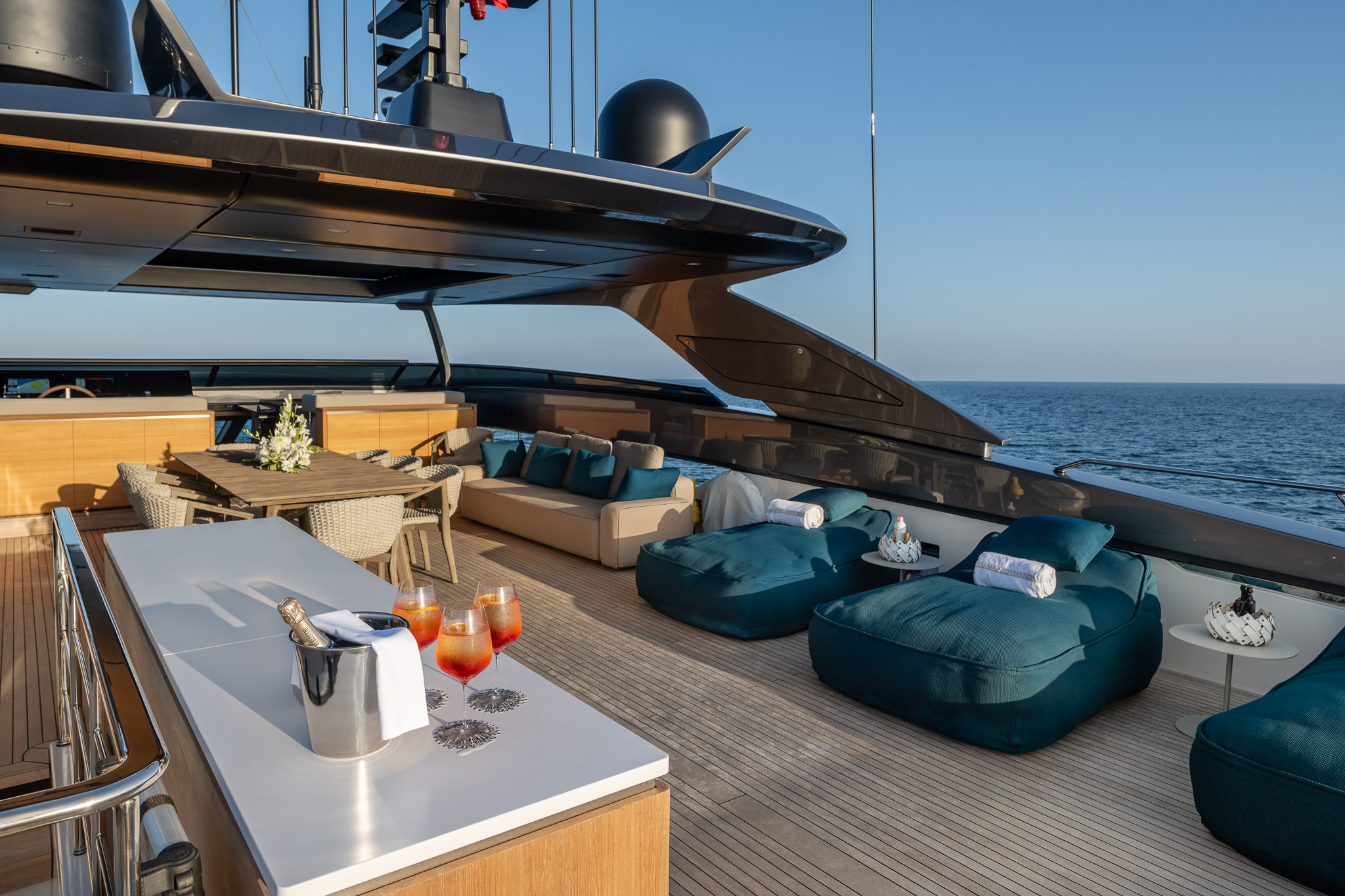 Before dining outside as the sun sets, spend some time unwinding on the flybridge or aft deck. If you prefer the comfort of the luxurious interiors, VAUBAN provides onboard WIFI, complete audiovisual equipment, and a TV outside on the flybridge, guaranteeing a wide range of entertainment options.