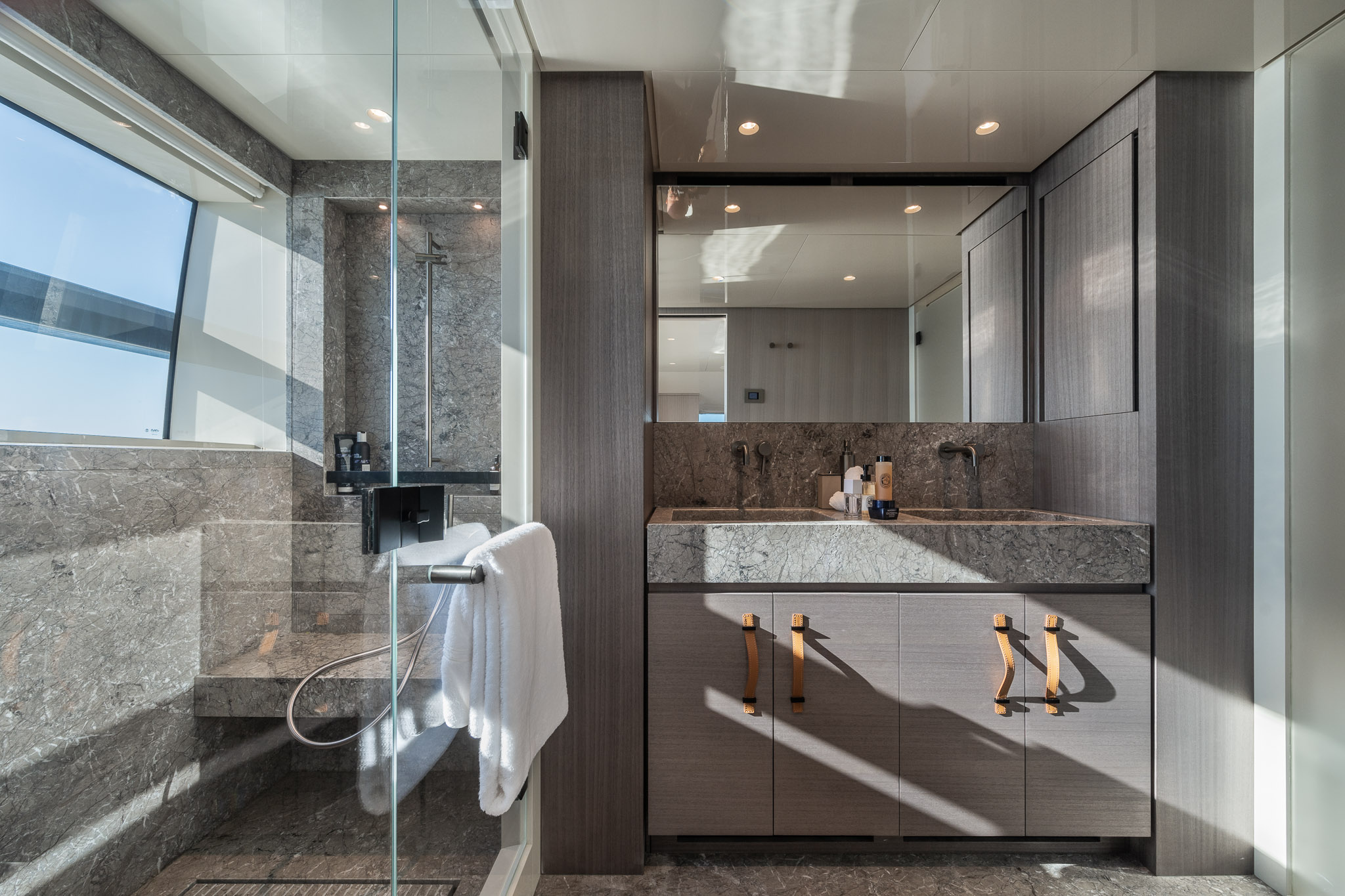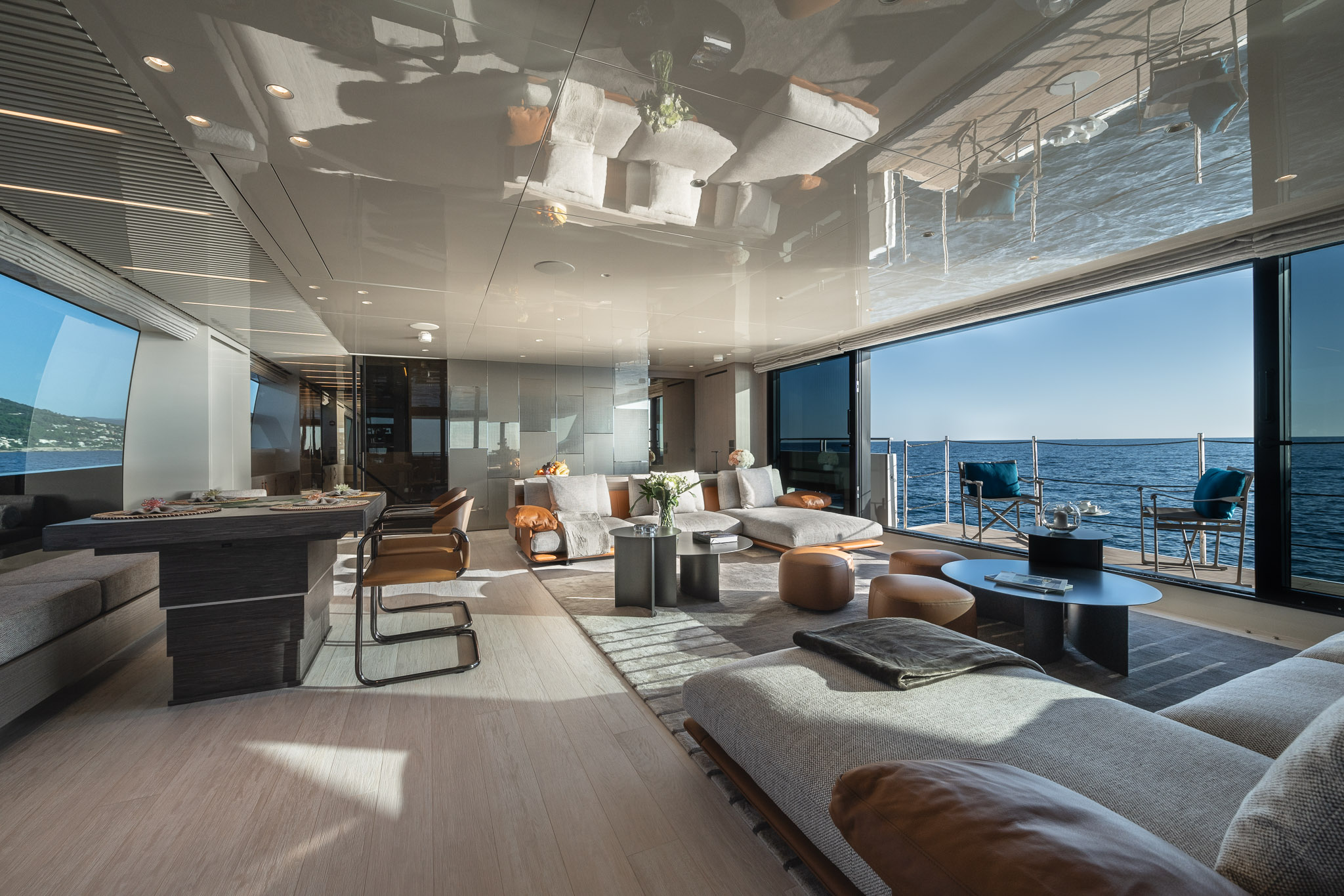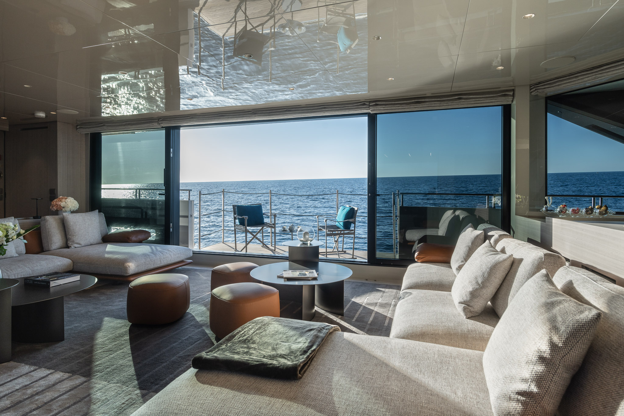 The salon’s large windows and sliding doors let in plenty of natural light, which highlights the yacht’s connection with the sea. Stained wood and lacquered storage cabinetry, accent pieces, and carefully chosen textiles all contribute to the well-considered design.