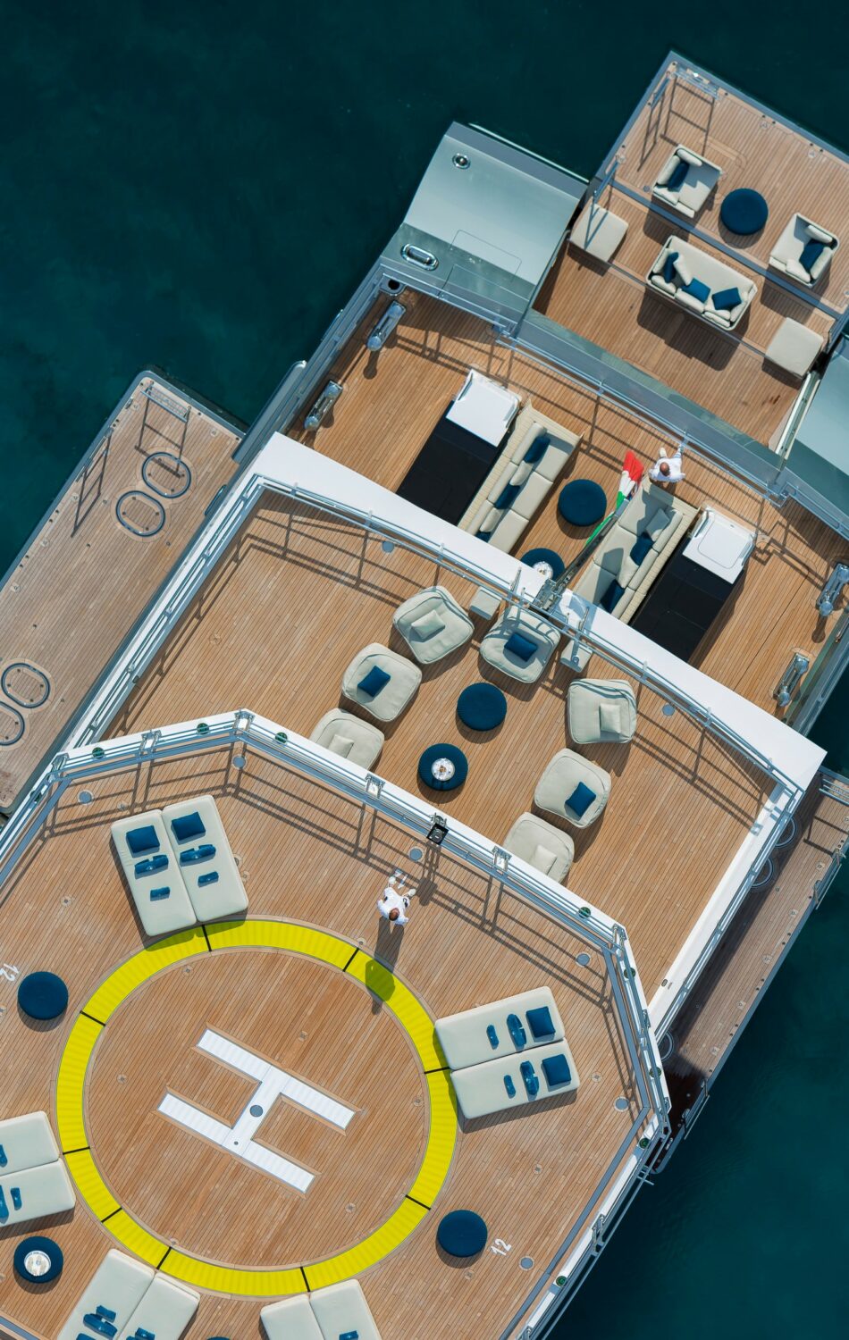 Exterior space is also an incredible selling point for this innovative yacht. There is a certified helideck, built in full respect of the restrictions posed by the competent authorities, allowing access to every part of the world, whether that be for heliskiing or luscious beach exploration. This was carefully thought out in the design to ensure that guests could reach the yacht as fast as possible.