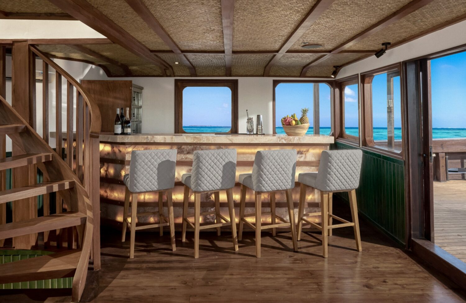 The exterior spaces on SAMSARA SAMUDRA have been maximised to prioritise use, with a large informal dining table sitting right on her bow. Guests can dine under the sun, moon and stars, still from the comfort of the luxury yacht.