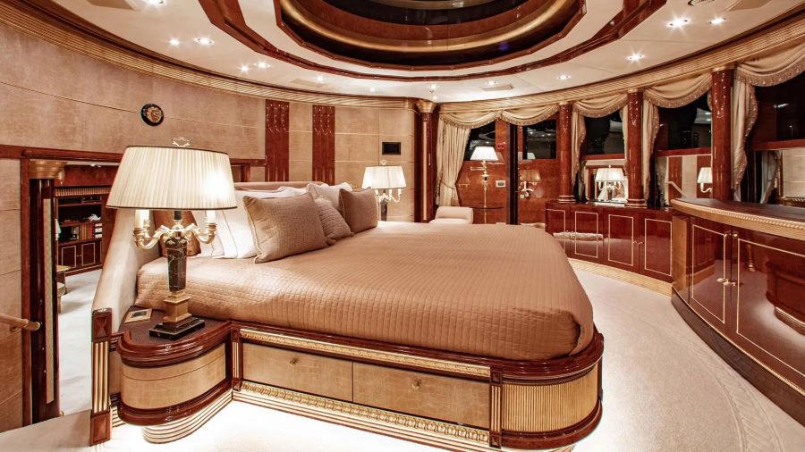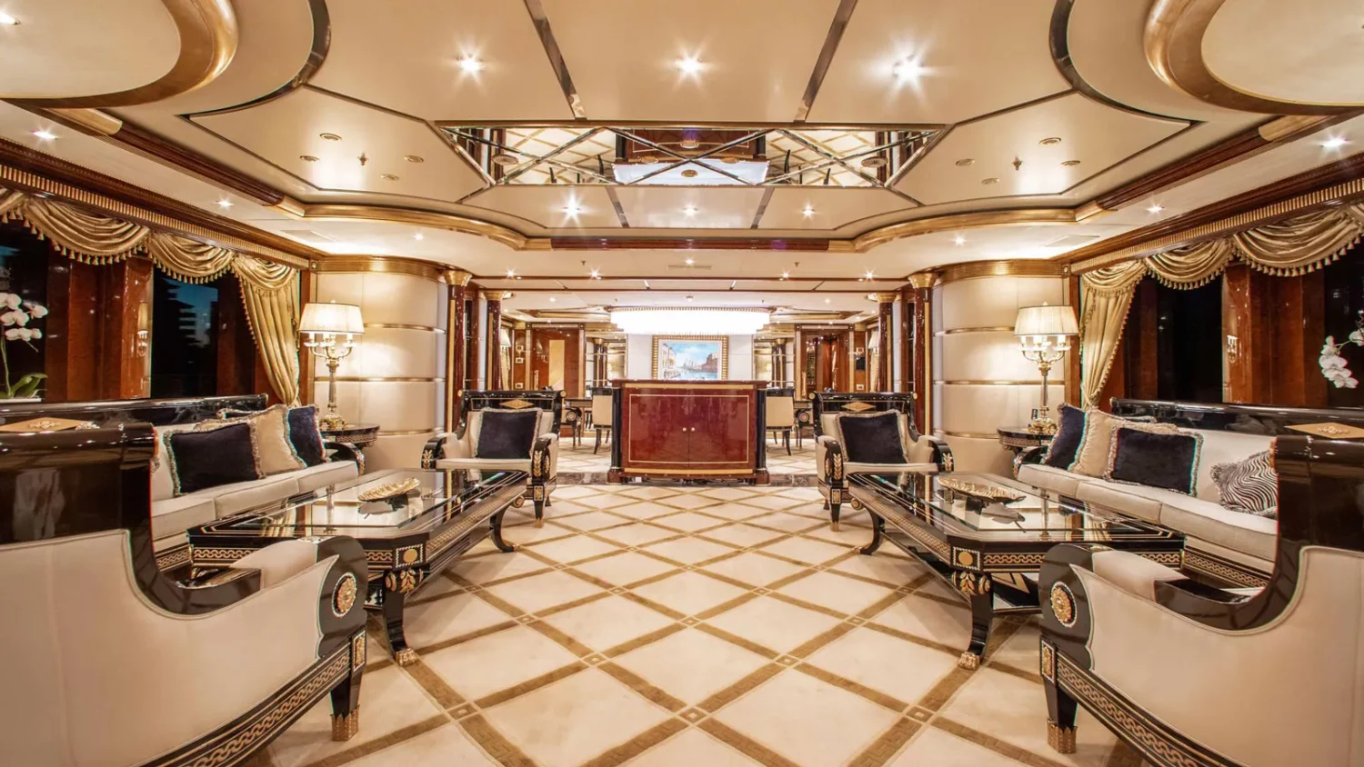 Her highlights include an elevator to all decks that ensures all guests can access every space on the yacht with ease, an on-deck master stateroom with a private salon, a beach club, an elegant Italian-styled interior, a Jacuzzi, a gym, and a helipad.