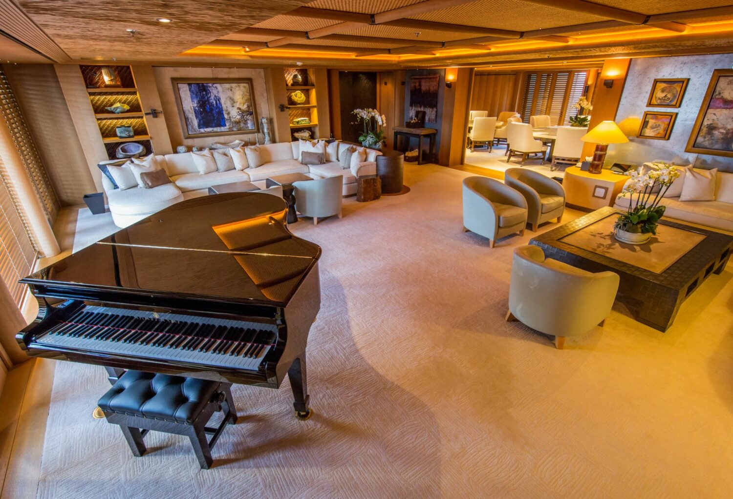 Pelorus’s exterior, designed by Tim Heywood, departed from the angular, tiered silhouettes of the 1990s. Instead of emphasising sheer size or overt grandeur, Heywood opted for a flowing, horizontal profile that gave the yacht a streamlined, almost sculptural elegance. Her long, low lines created a sense of constant motion, appearing graceful and commanding even while still. This aesthetic approach, now common in many contemporary superyachts and megayachts for sale, was highly unconventional at the time and set a new standard for visual sophistication.
