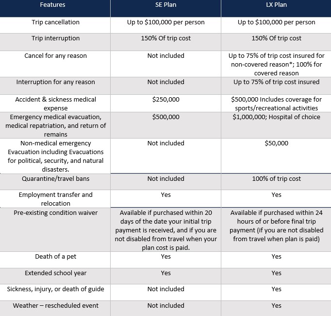 There are multiple plans to choose from that offer various levels of coverage for trip cancellation and interruption, including medical benefits and other travel-related events and expenses, ensuring you are protected if you are unable to go on the charter.