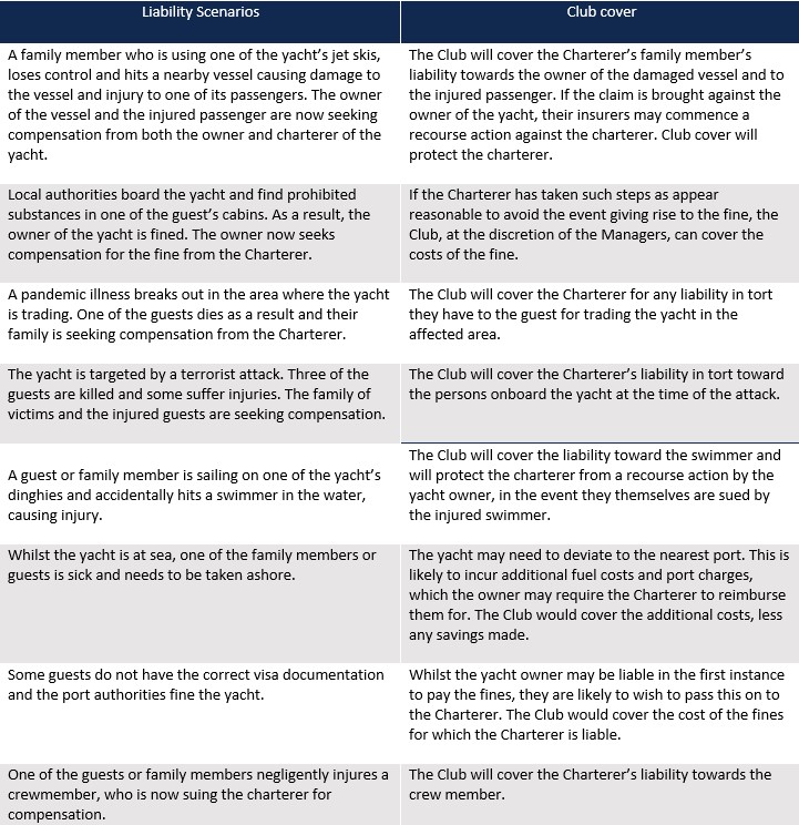 - The Yacht Owner’s P&I cover only covers the owner’s own liabilities and not those of the charterer or their guests