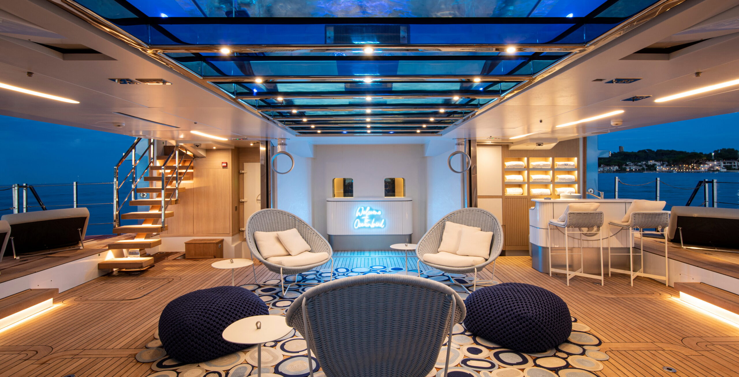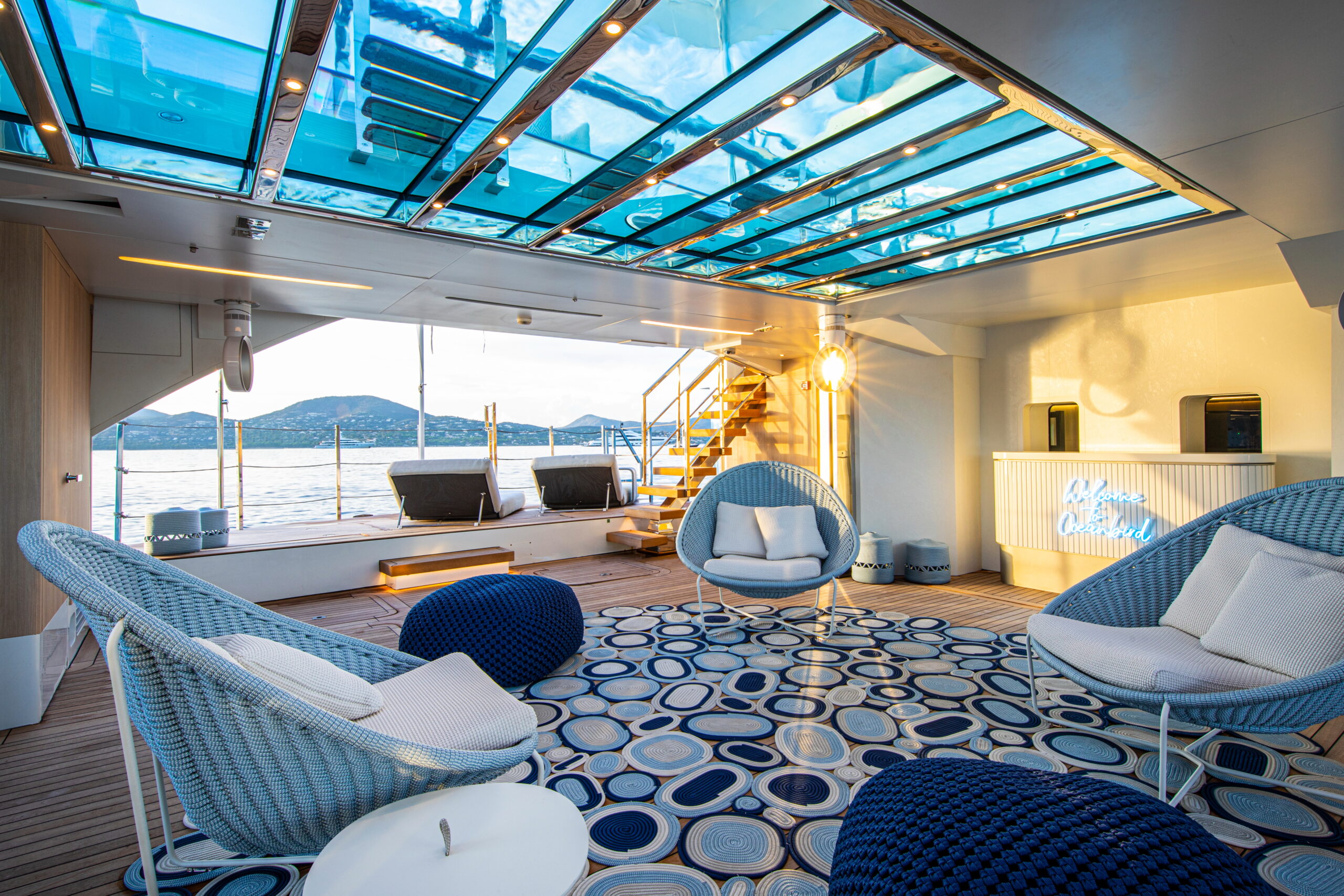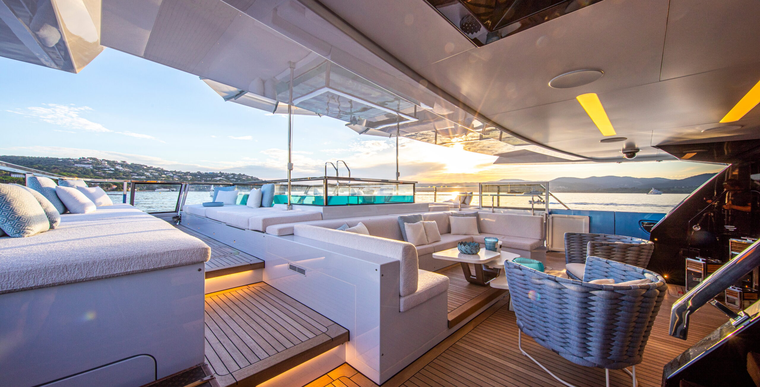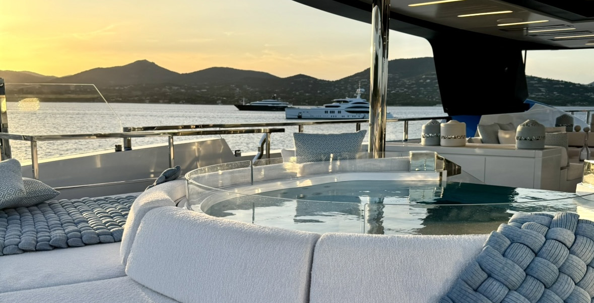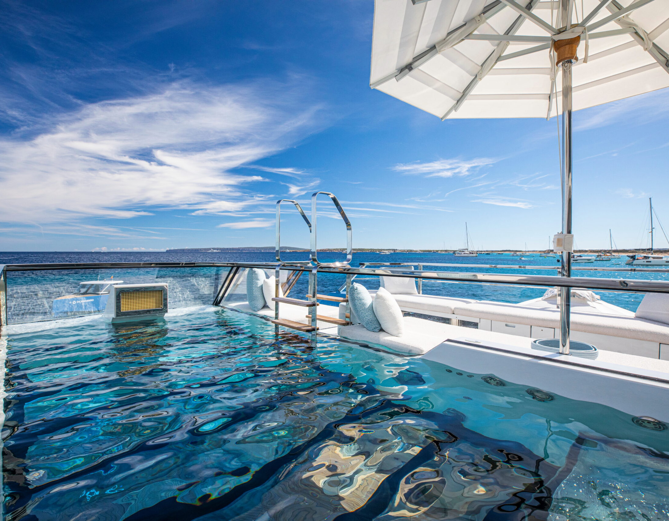 The exceptionally spacious beach club measures 90 m2, a size normally only found on 70 meter yachts, illuminated by the glass-bottom pool above casting a serene, underwater light. With nearly 270 degrees view from the two opening side door balconies and stern door providing a sense of calmness throughout the area.