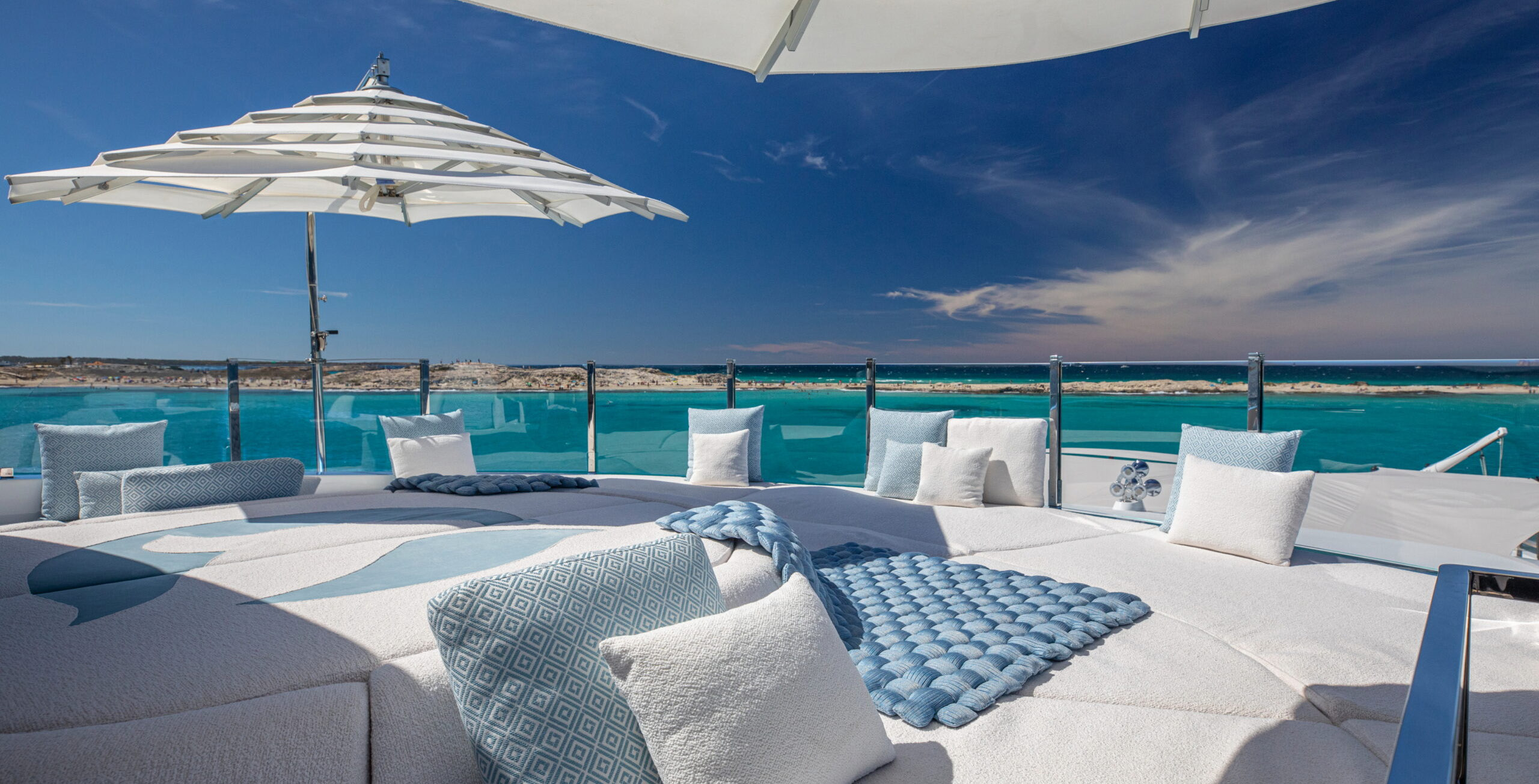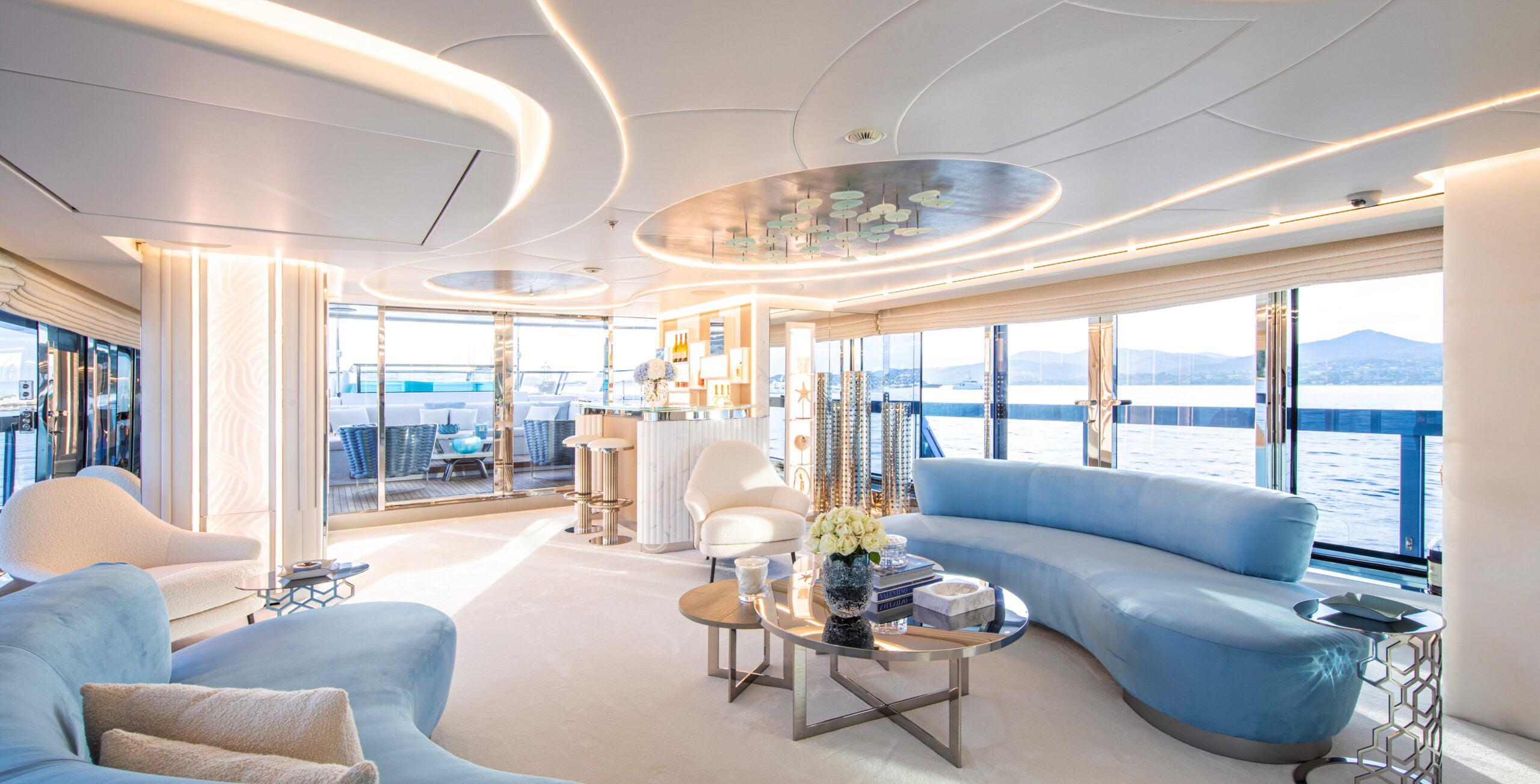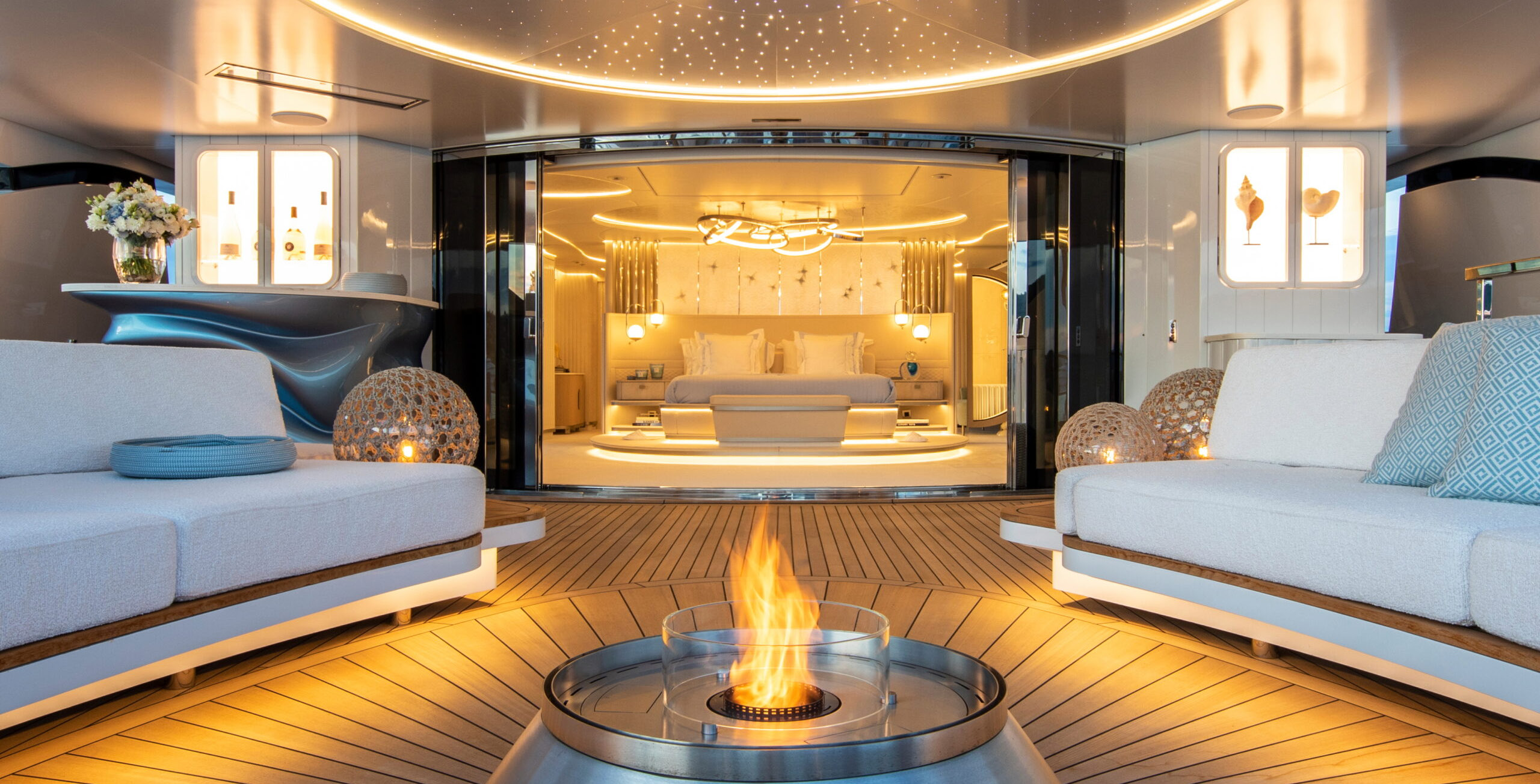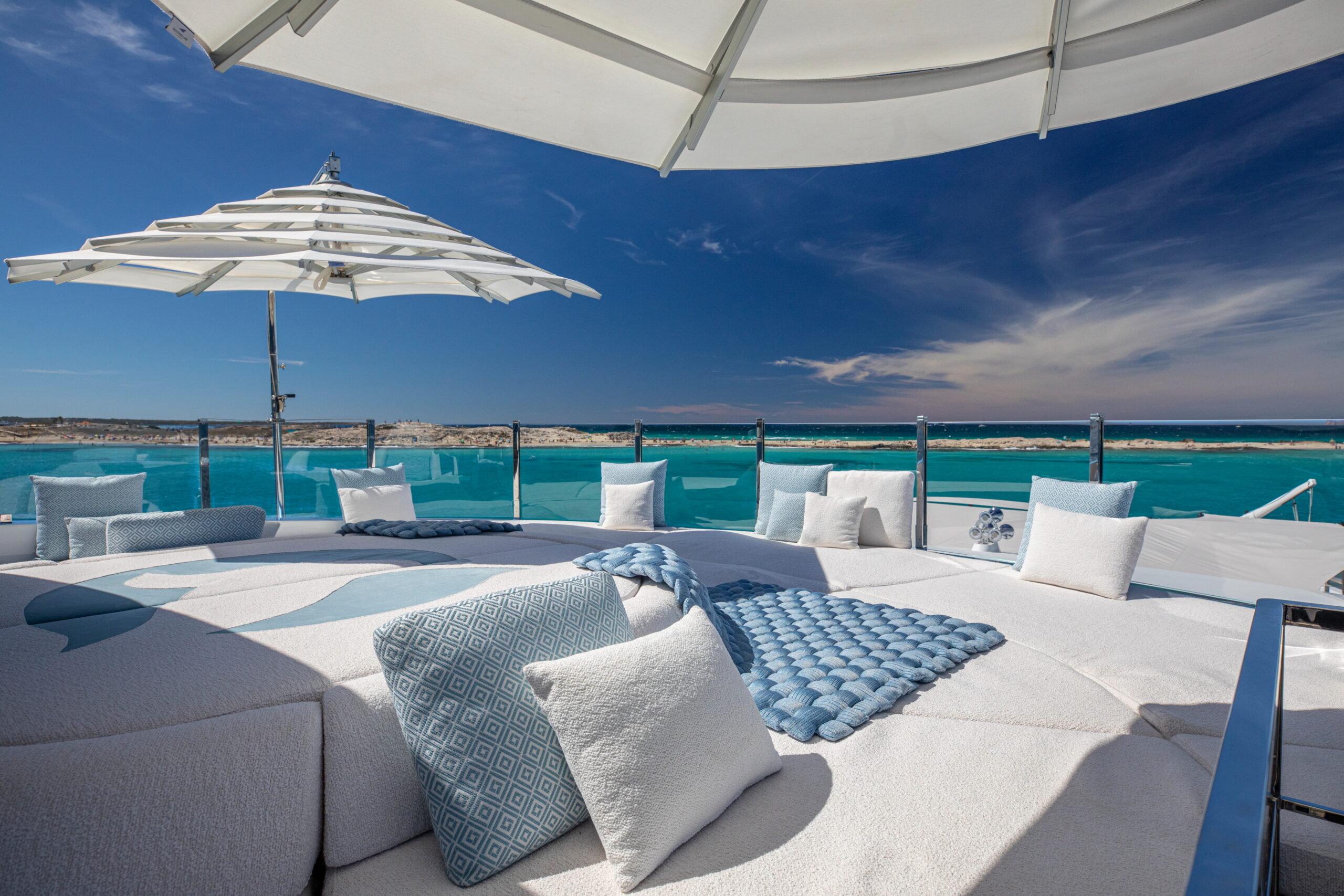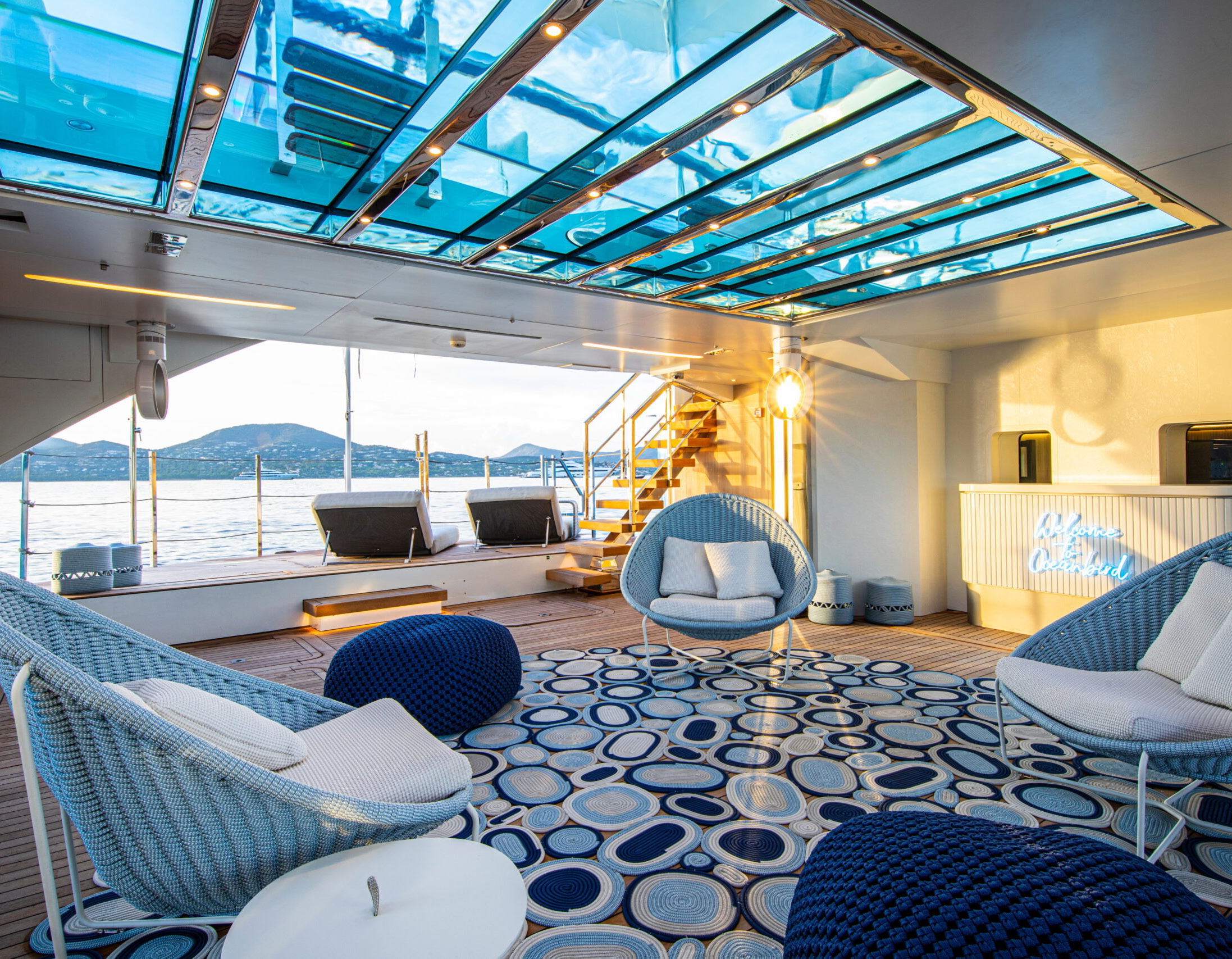 The exceptionally spacious beach club measures 90 m2, a size normally only found on 70 meter yachts, illuminated by the glass-bottom pool above casting a serene, underwater light. With nearly 270 degrees view from the two opening side door balconies and stern door providing a sense of calmness throughout the area.