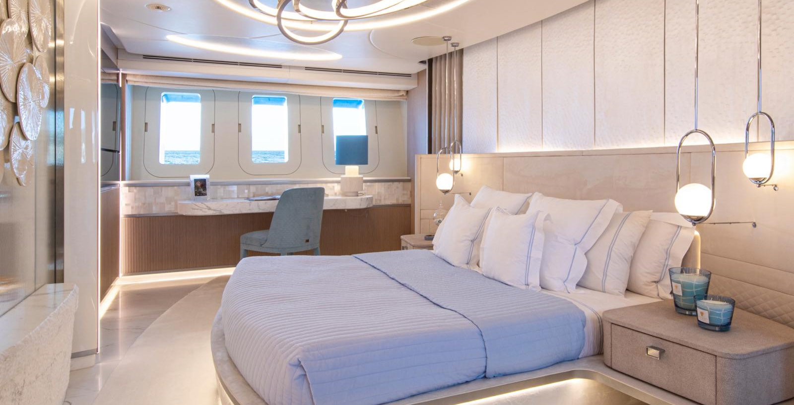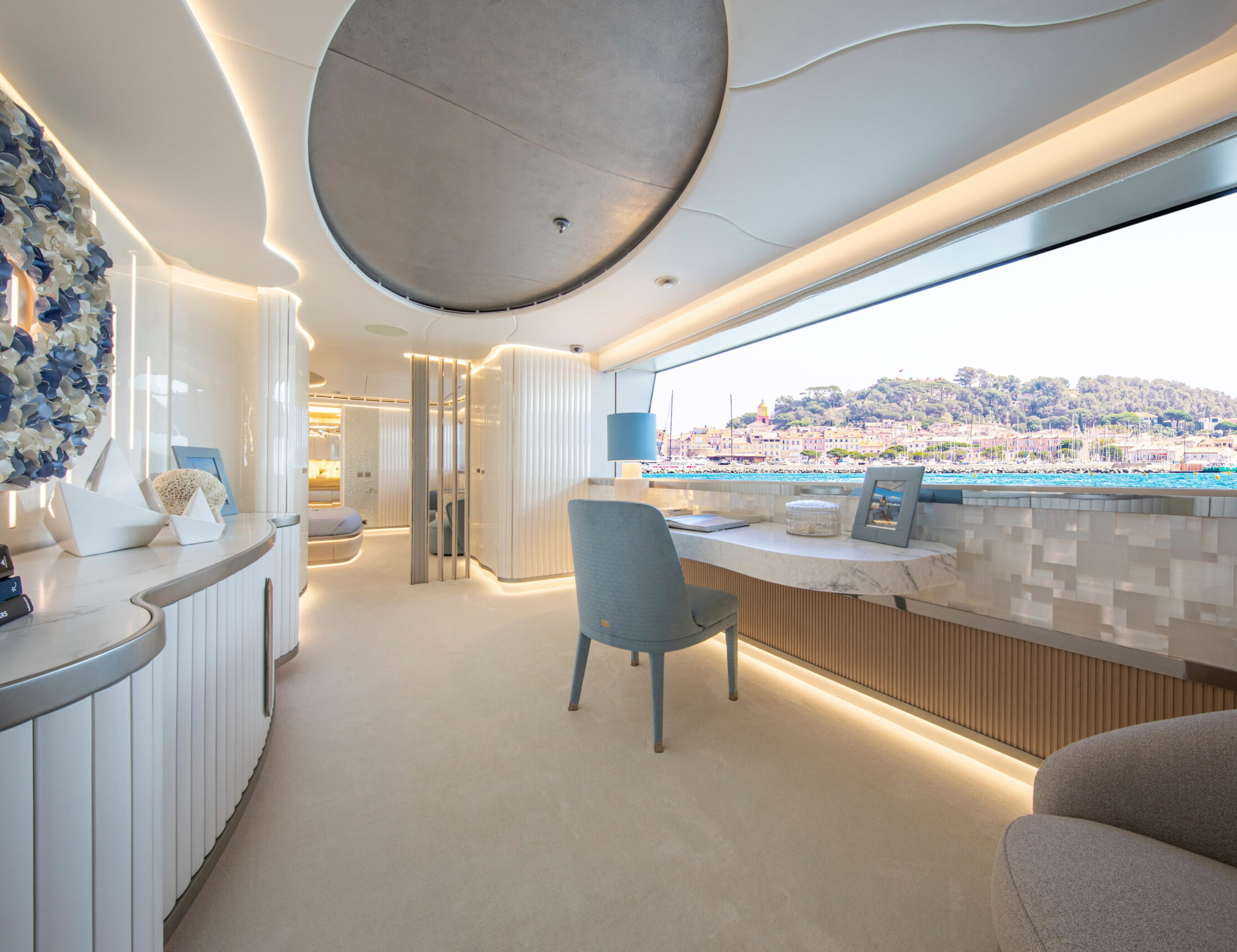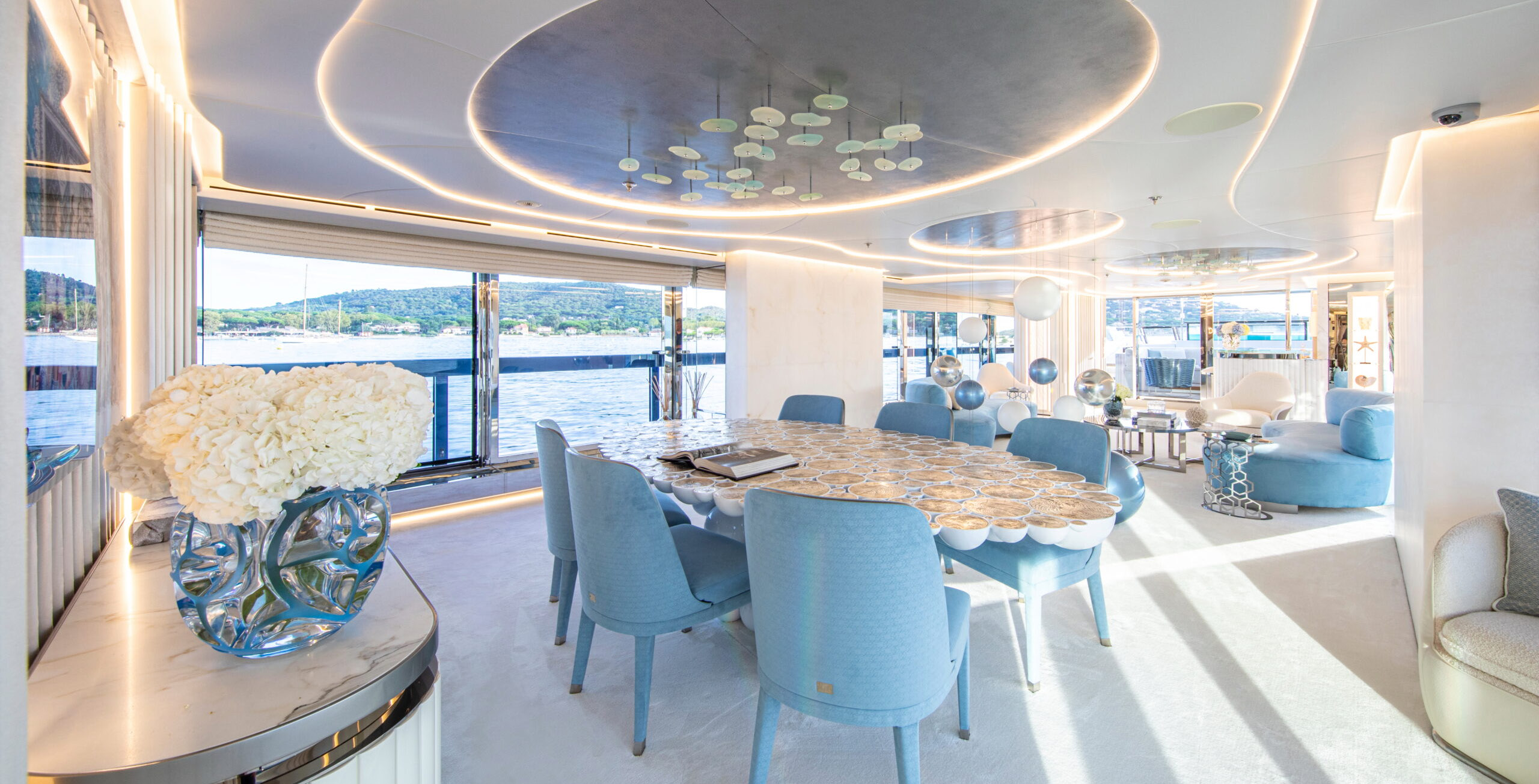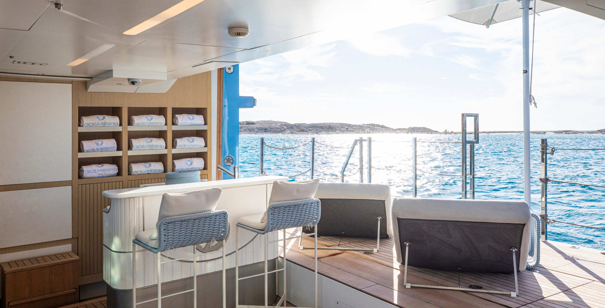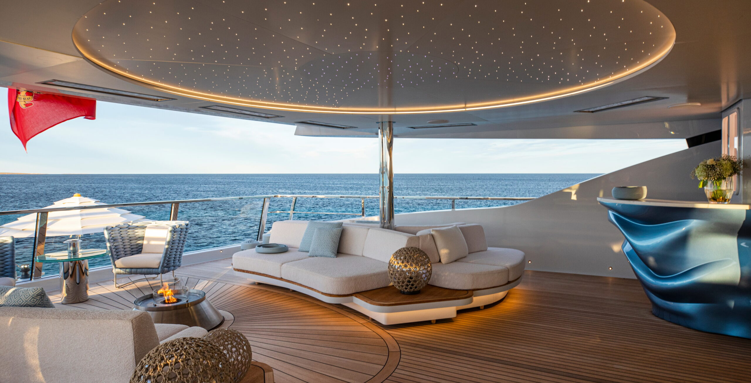 The exceptionally spacious beach club measures 90 m2, a size normally only found on 70 meter yachts, illuminated by the glass-bottom pool above casting a serene, underwater light. With nearly 270 degrees view from the two opening side door balconies and stern door providing a sense of calmness throughout the area.
