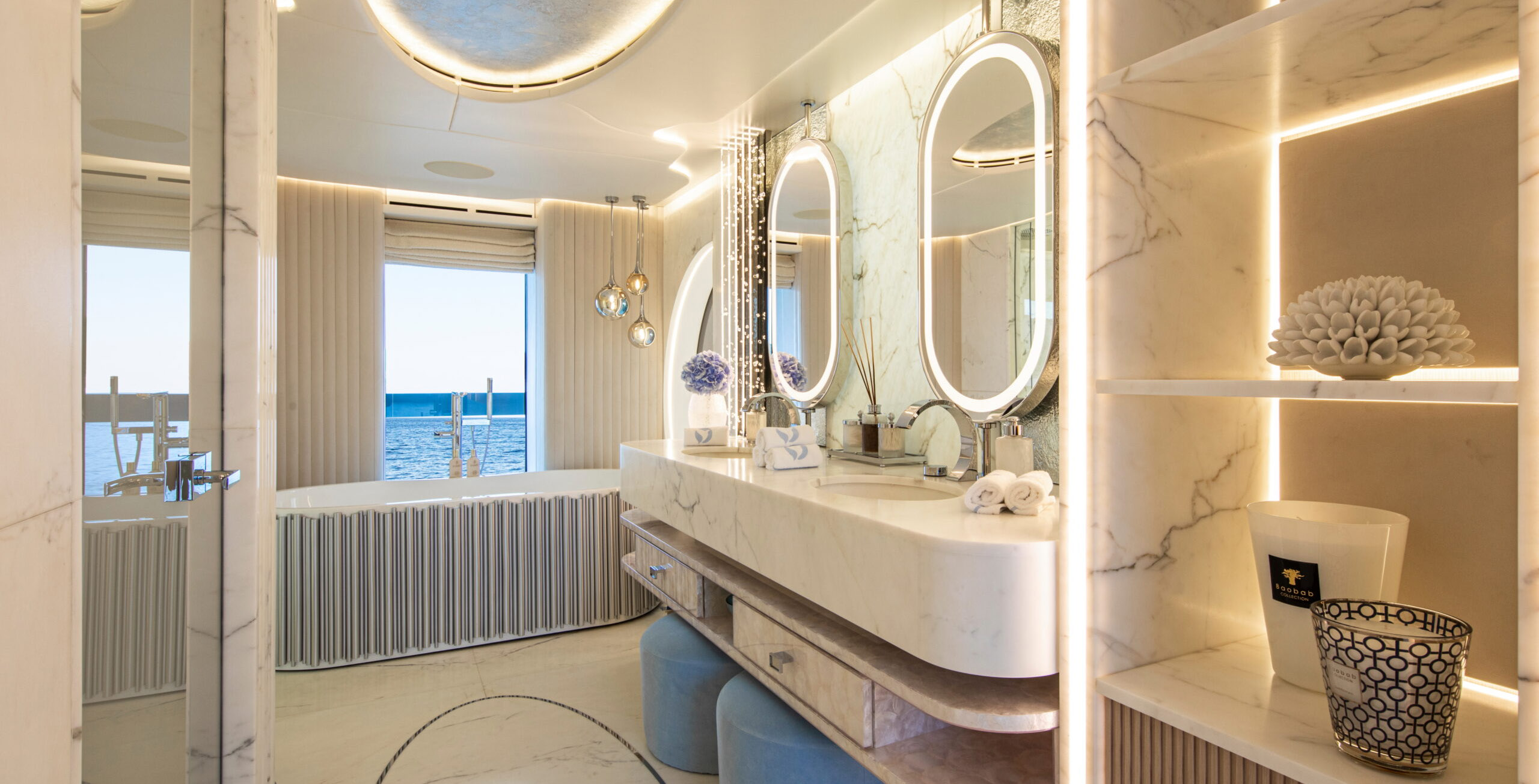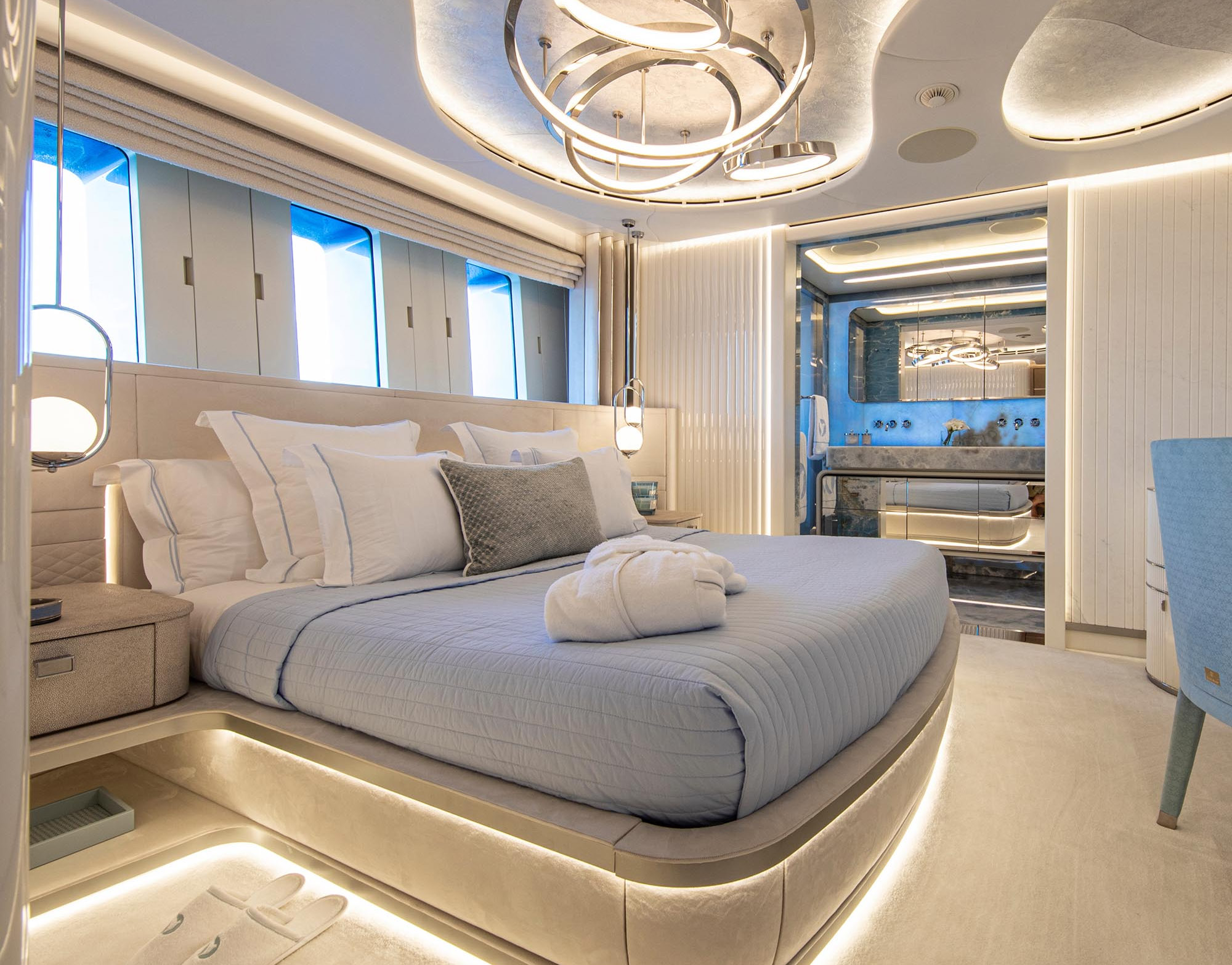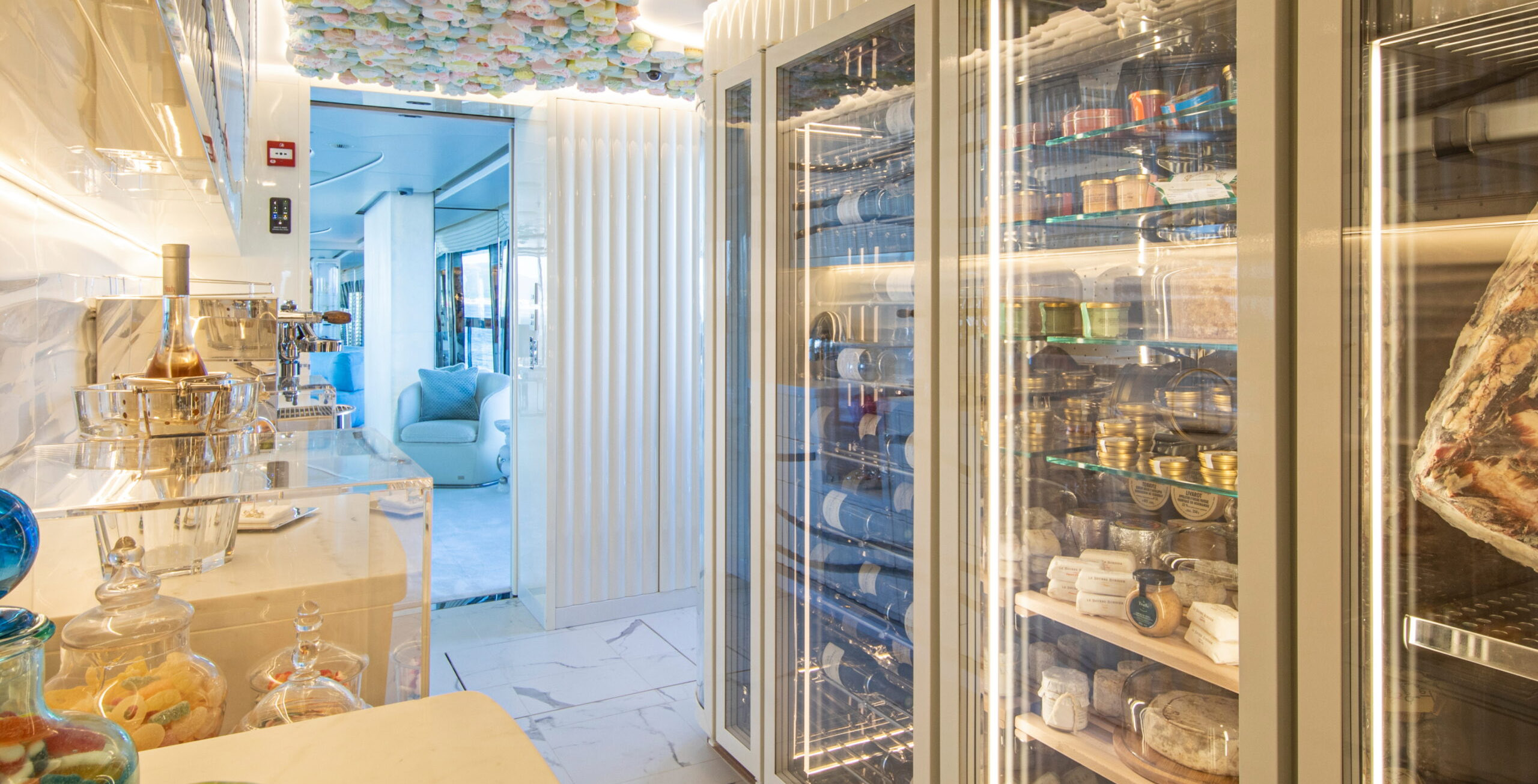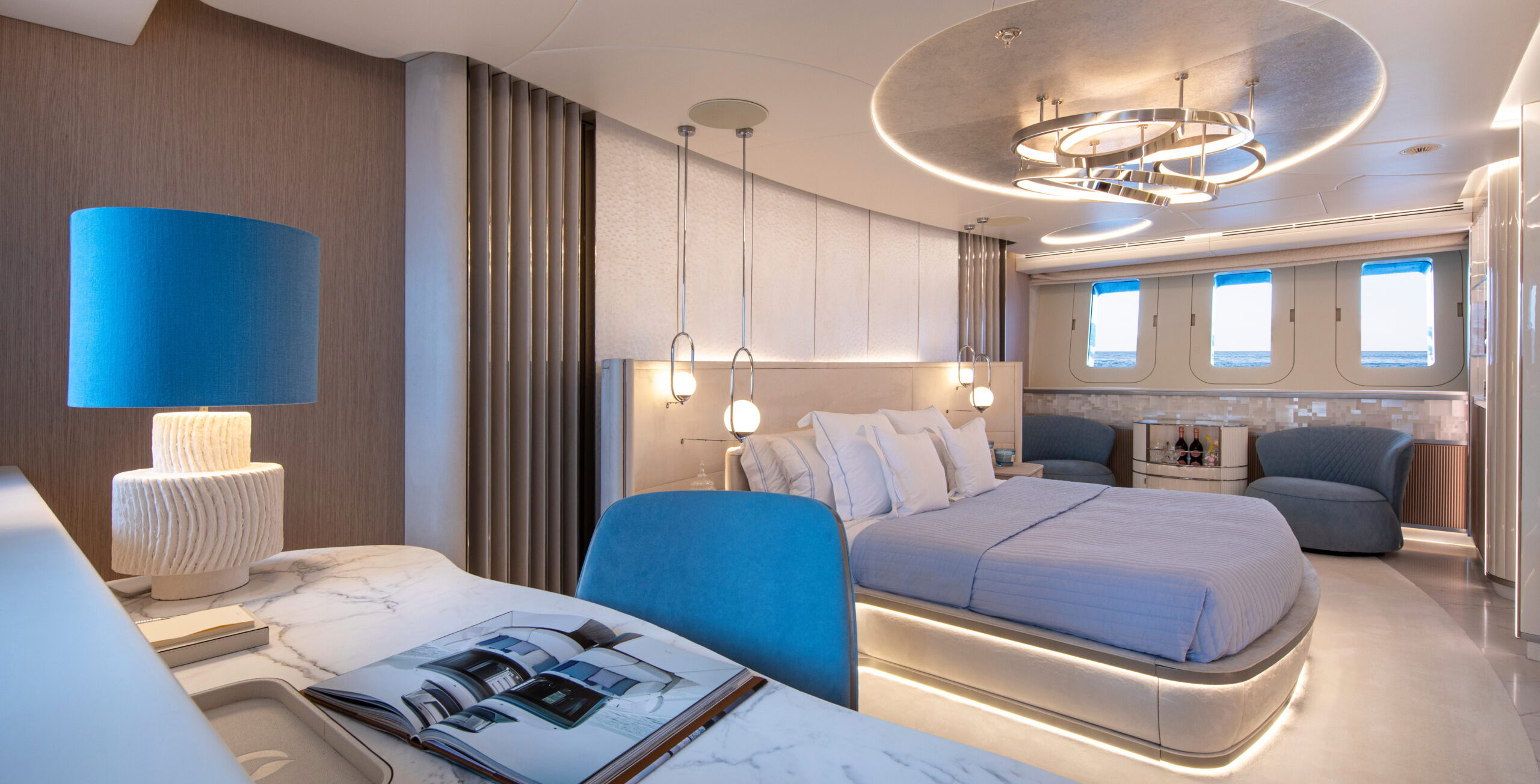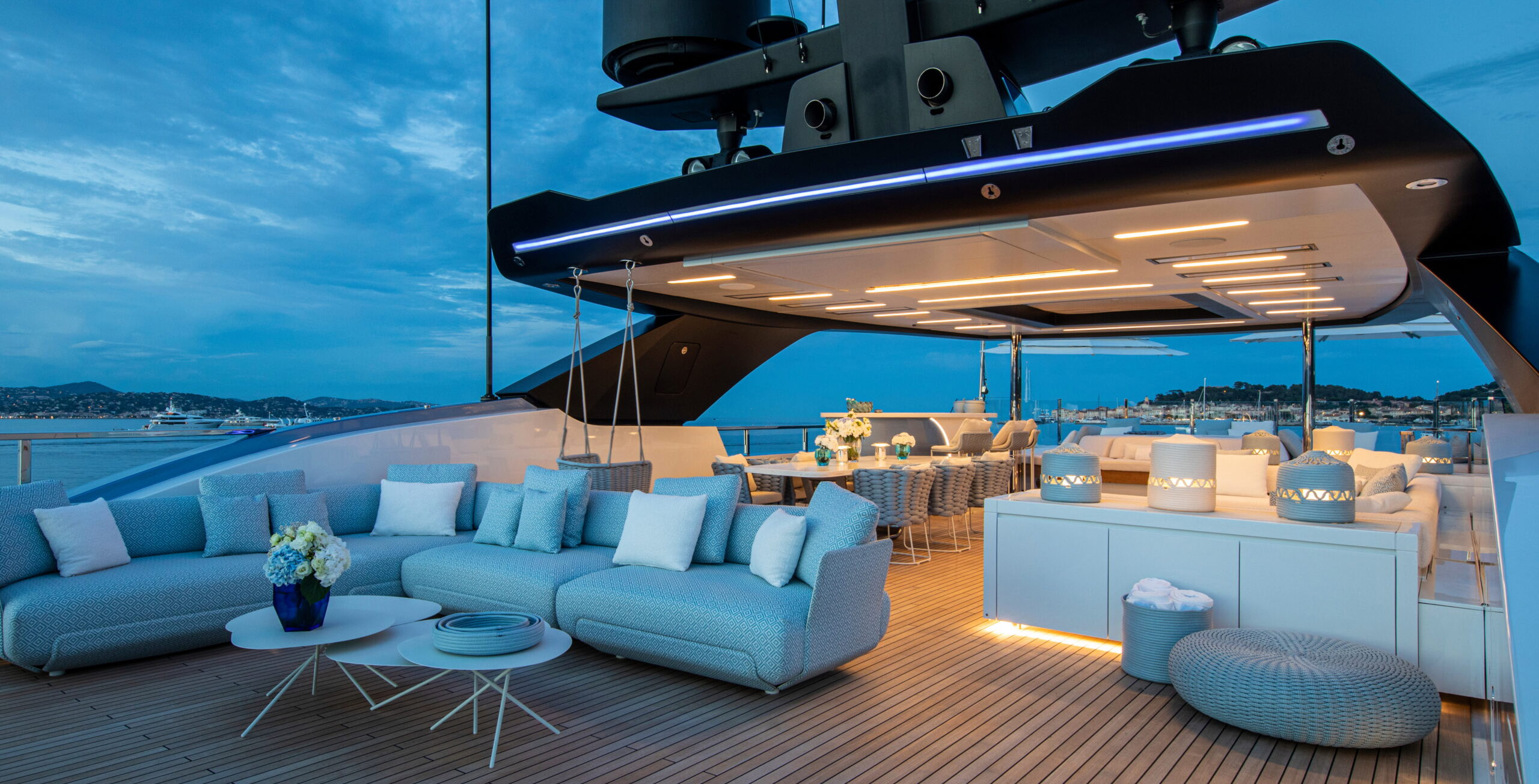 The exceptionally spacious beach club measures 90 m2, a size normally only found on 70 meter yachts, illuminated by the glass-bottom pool above casting a serene, underwater light. With nearly 270 degrees view from the two opening side door balconies and stern door providing a sense of calmness throughout the area.