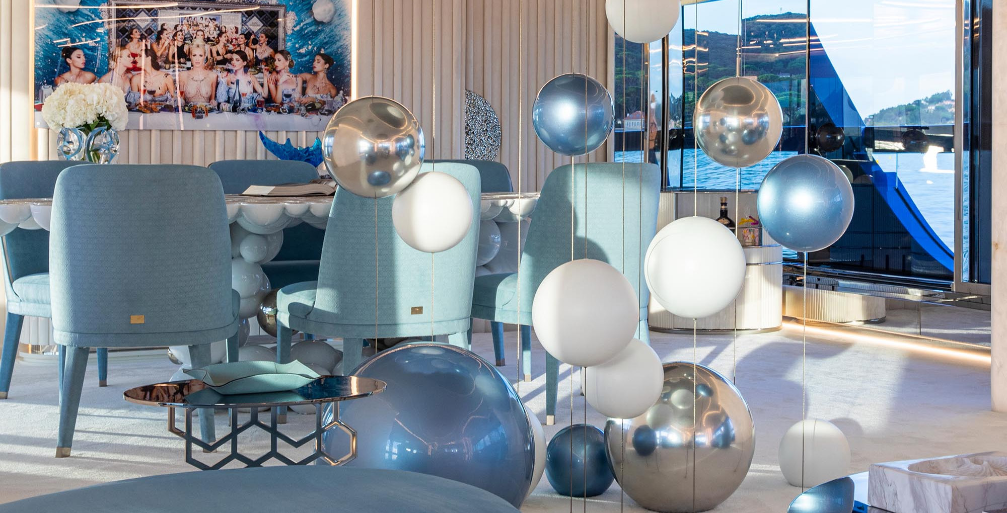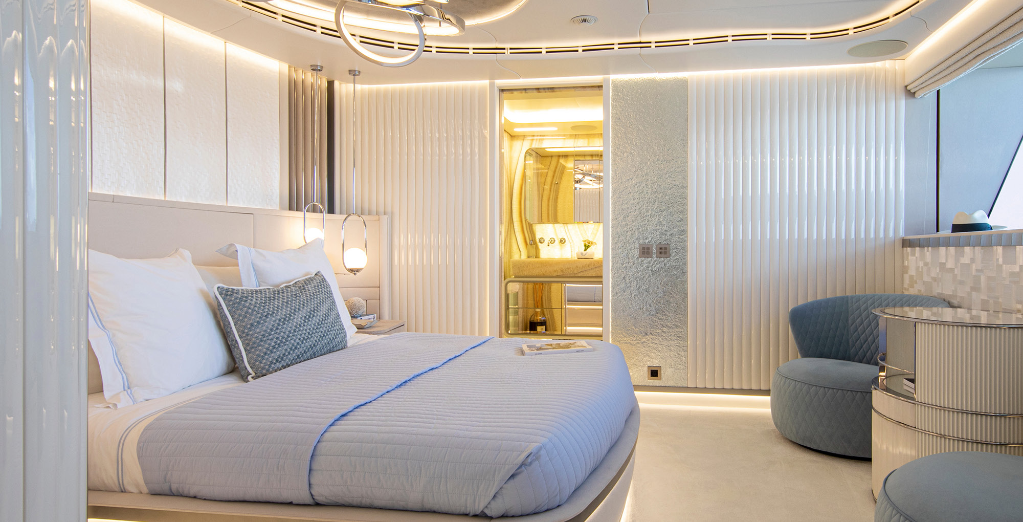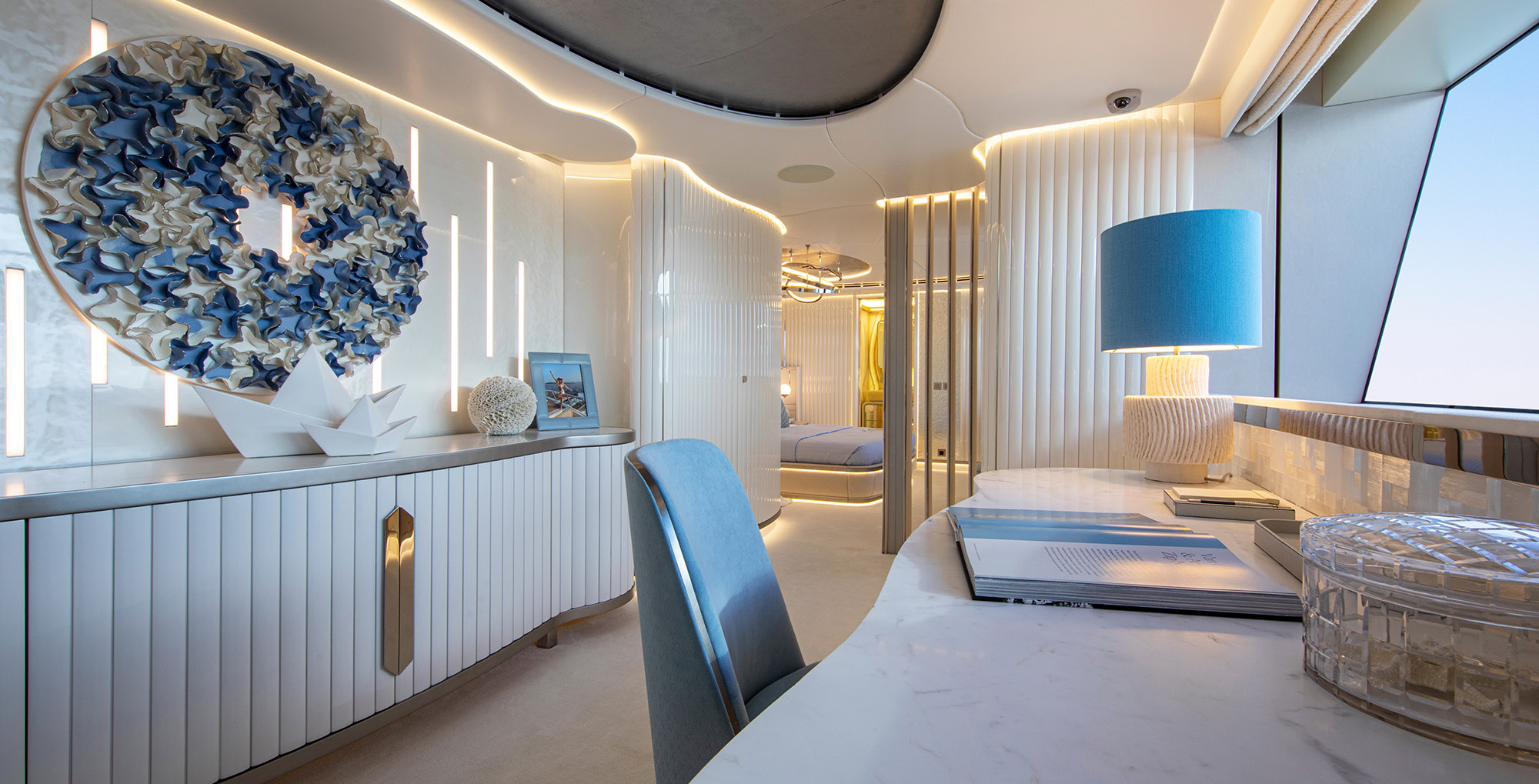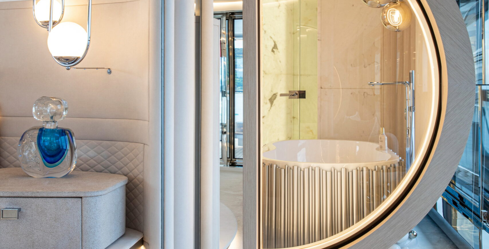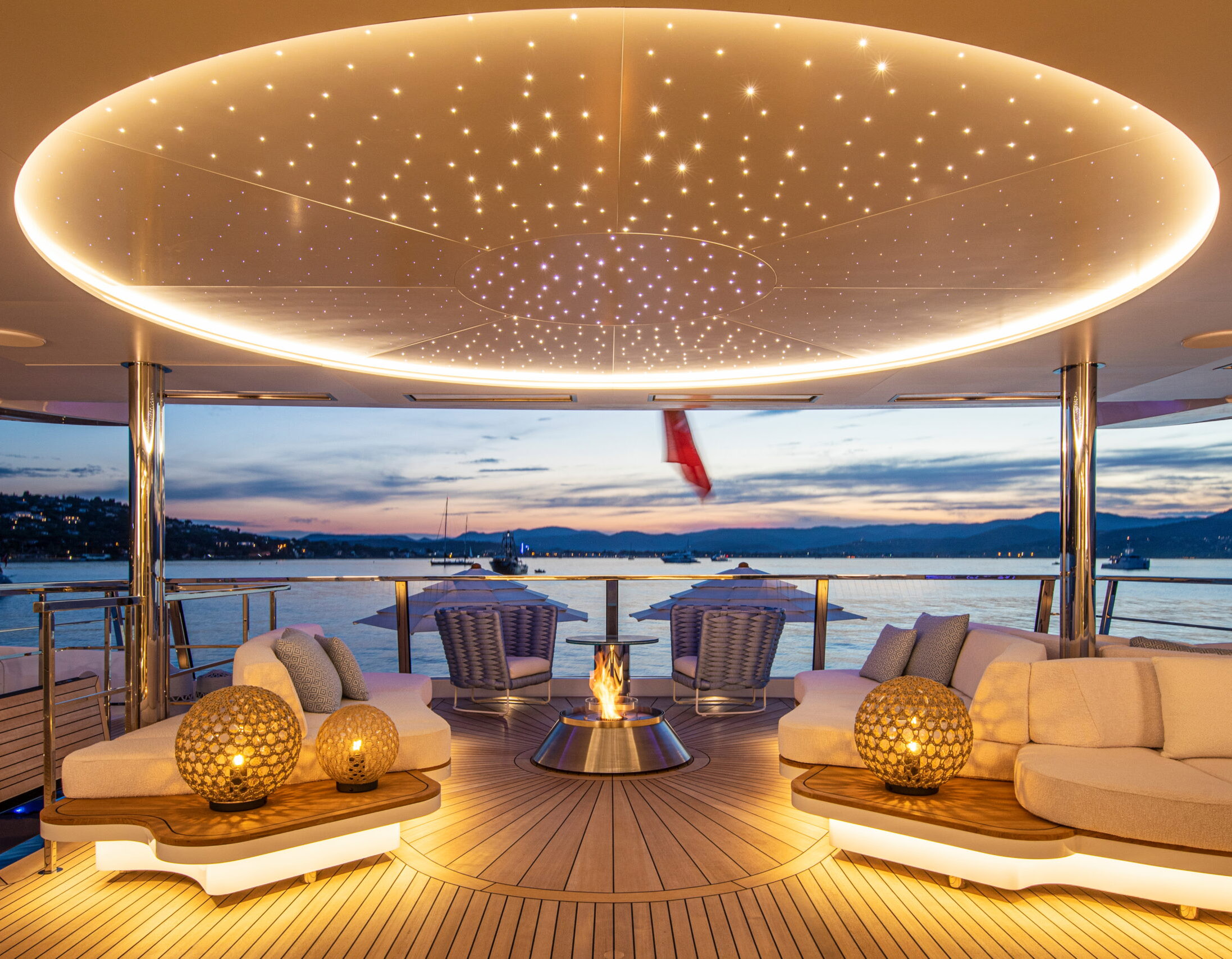 The exceptionally spacious beach club measures 90 m2, a size normally only found on 70 meter yachts, illuminated by the glass-bottom pool above casting a serene, underwater light. With nearly 270 degrees view from the two opening side door balconies and stern door providing a sense of calmness throughout the area.