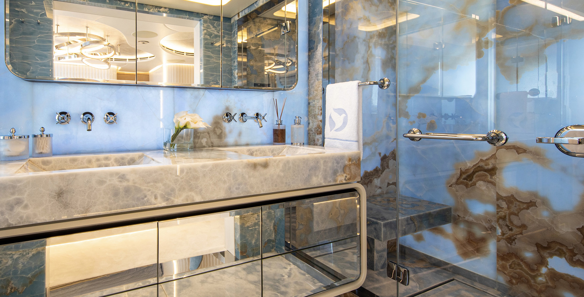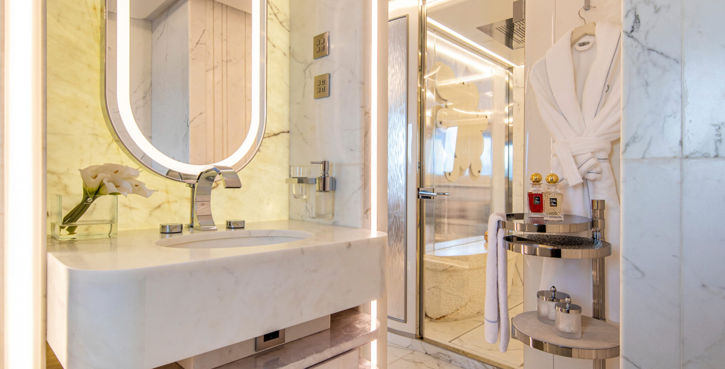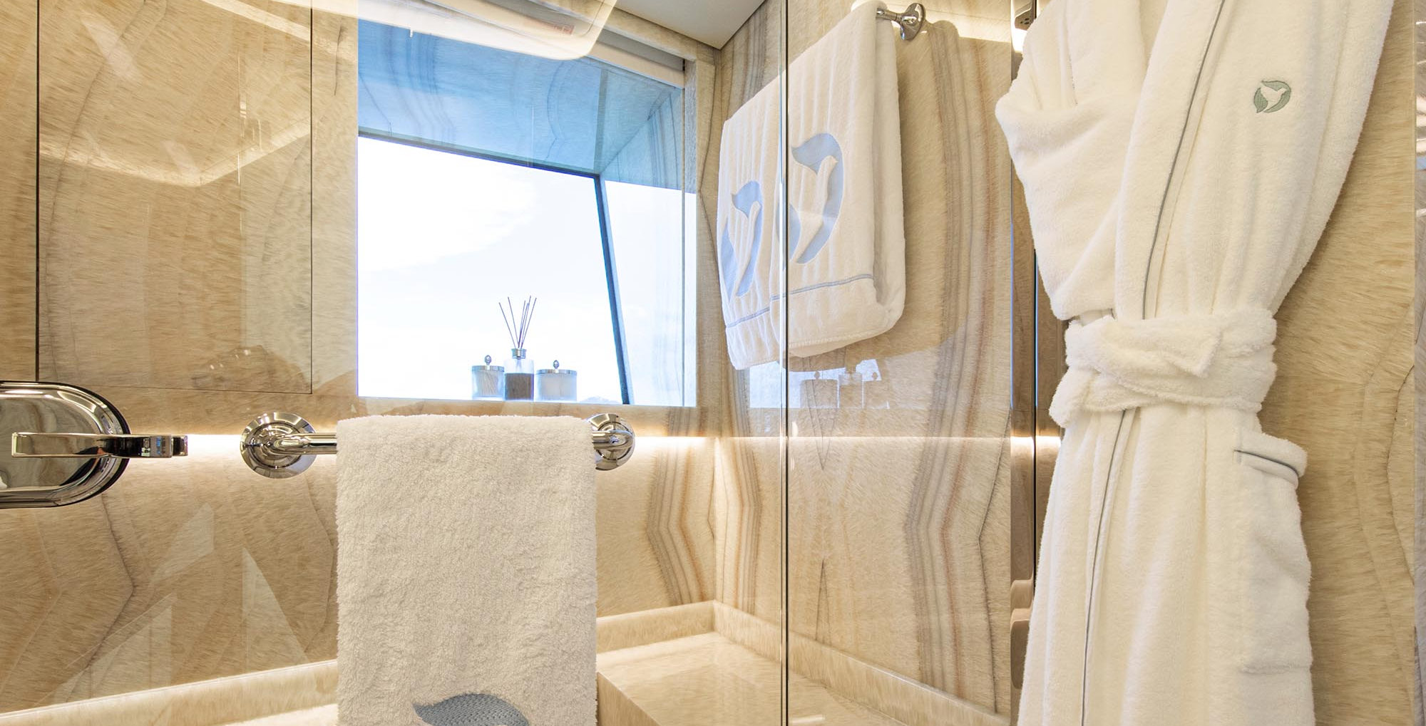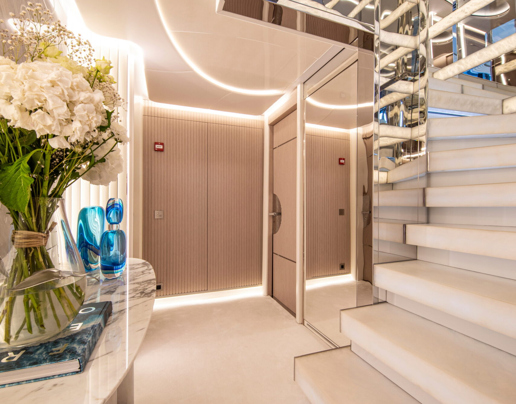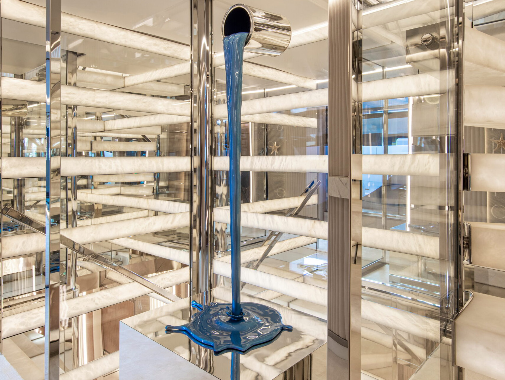 The exceptionally spacious beach club measures 90 m2, a size normally only found on 70 meter yachts, illuminated by the glass-bottom pool above casting a serene, underwater light. With nearly 270 degrees view from the two opening side door balconies and stern door providing a sense of calmness throughout the area.