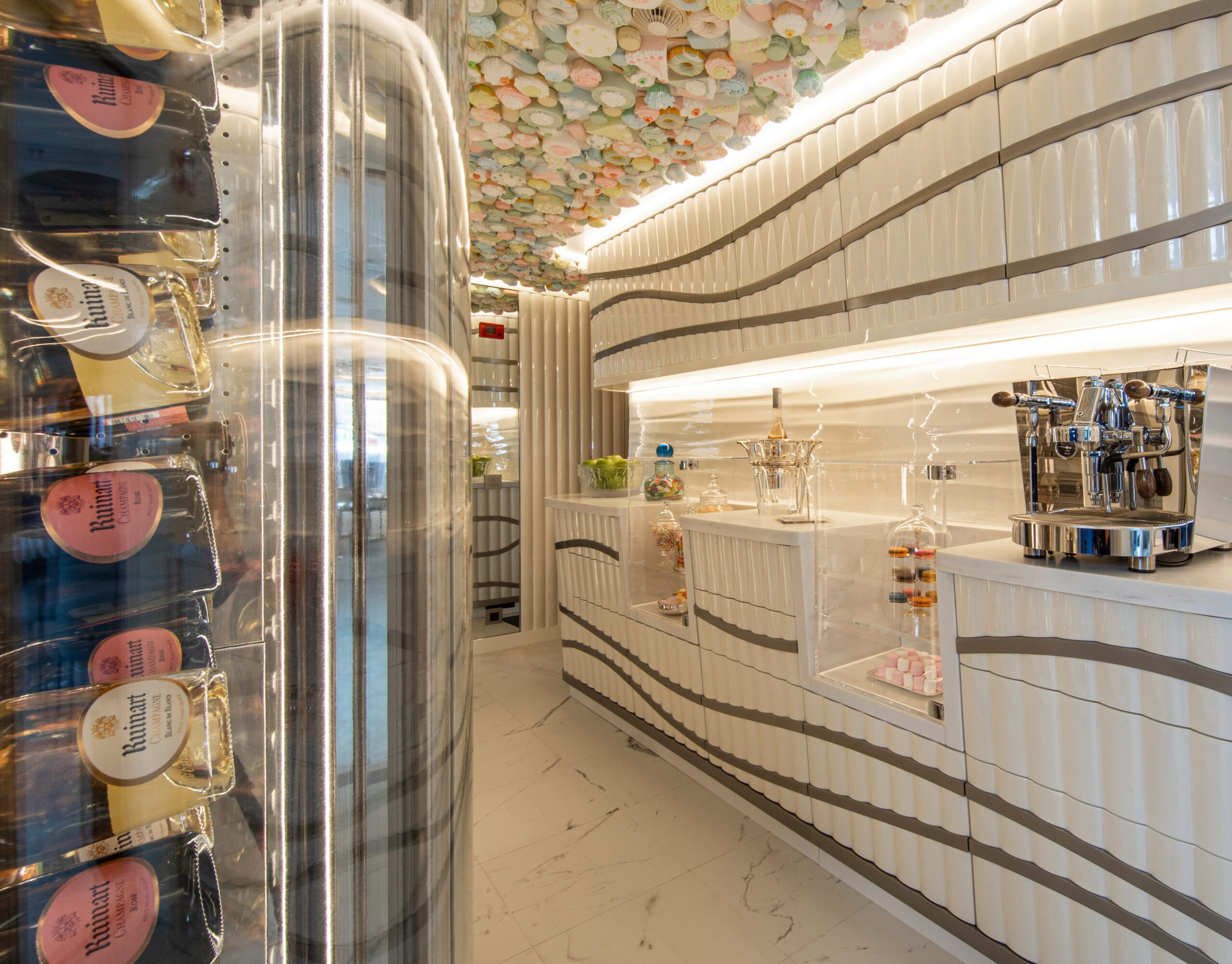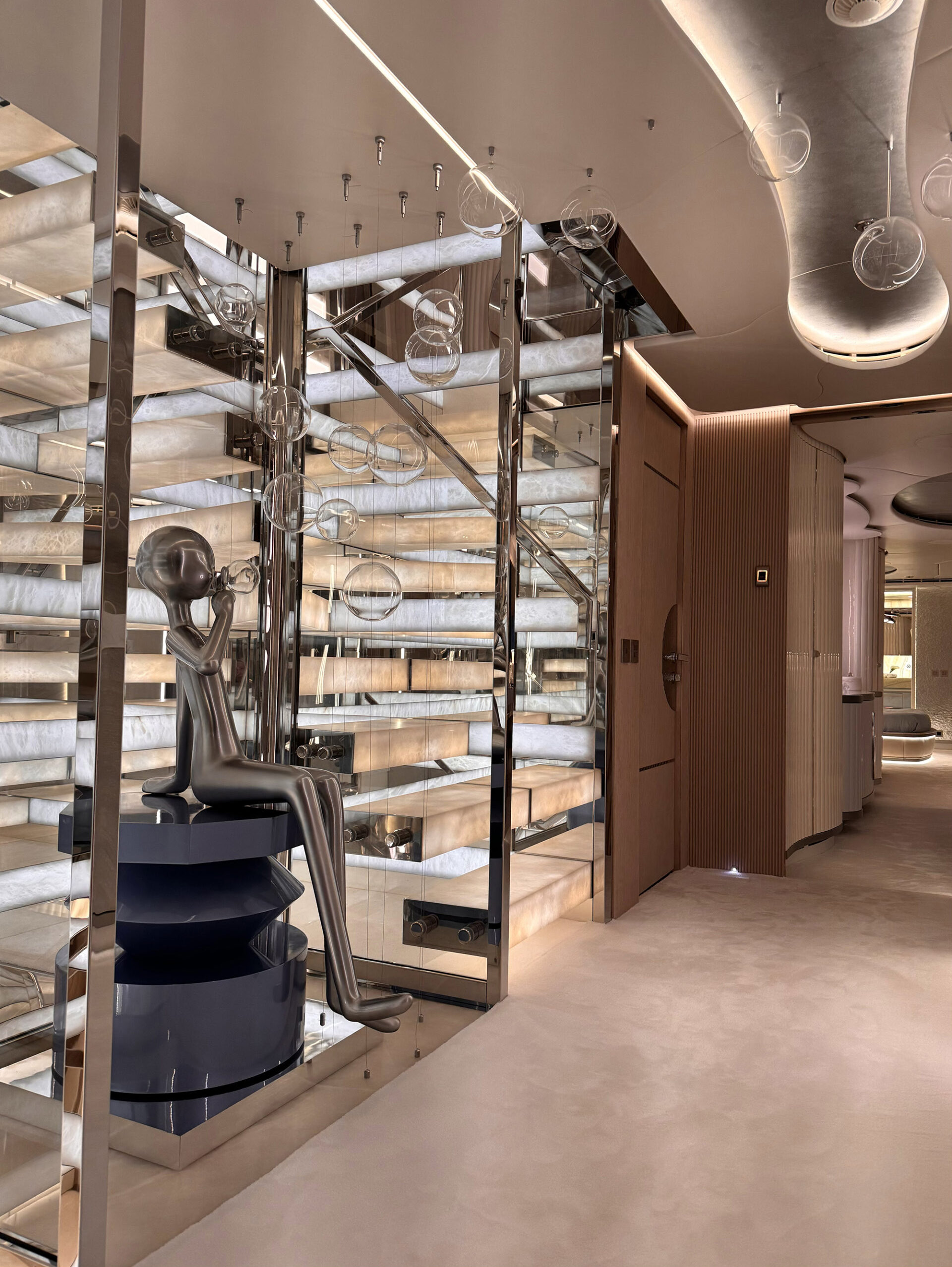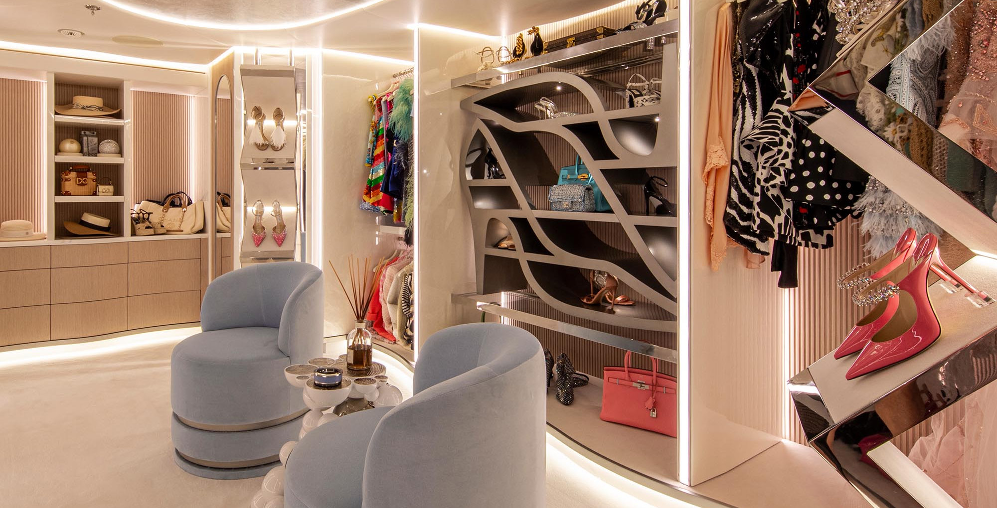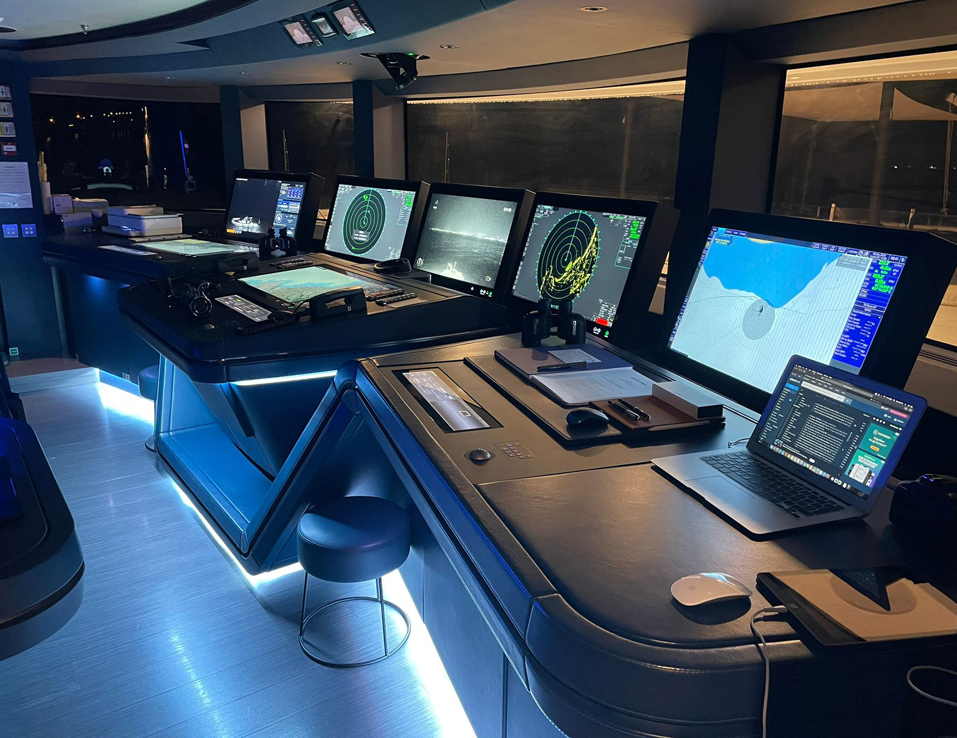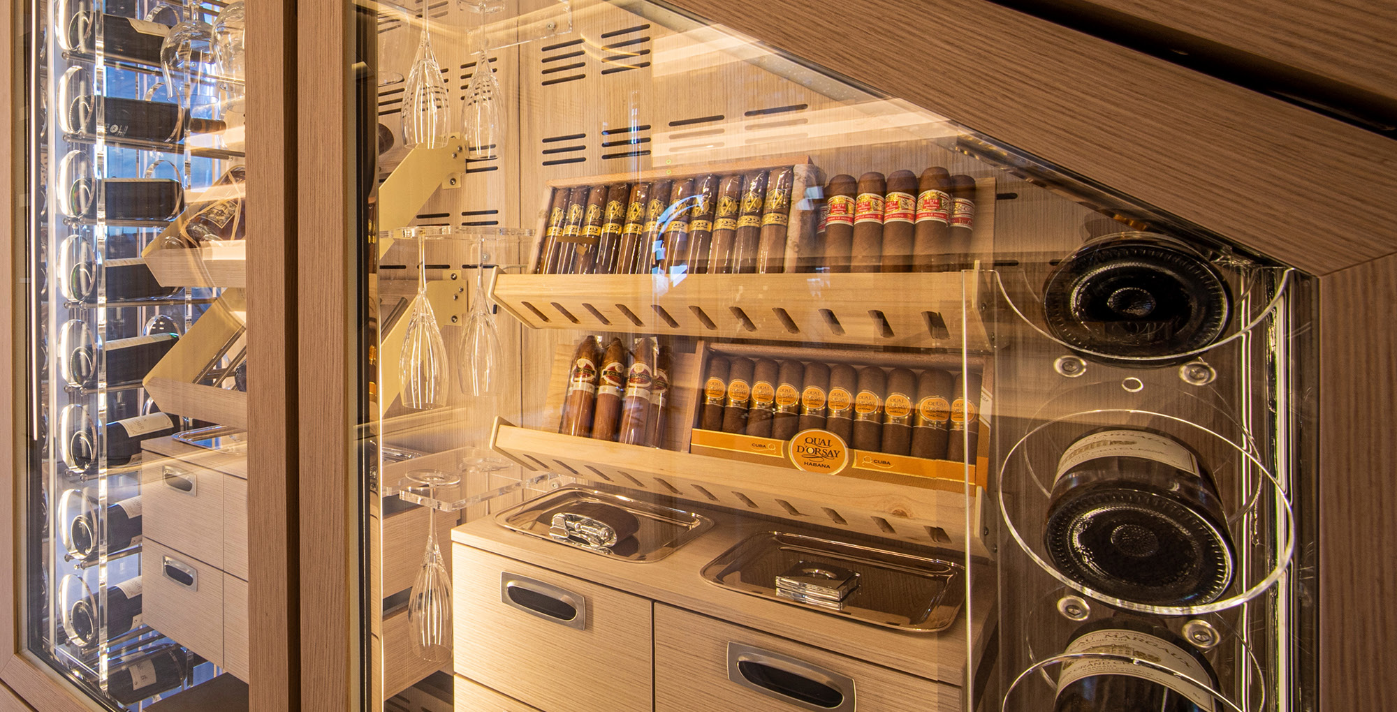 The exceptionally spacious beach club measures 90 m2, a size normally only found on 70 meter yachts, illuminated by the glass-bottom pool above casting a serene, underwater light. With nearly 270 degrees view from the two opening side door balconies and stern door providing a sense of calmness throughout the area.