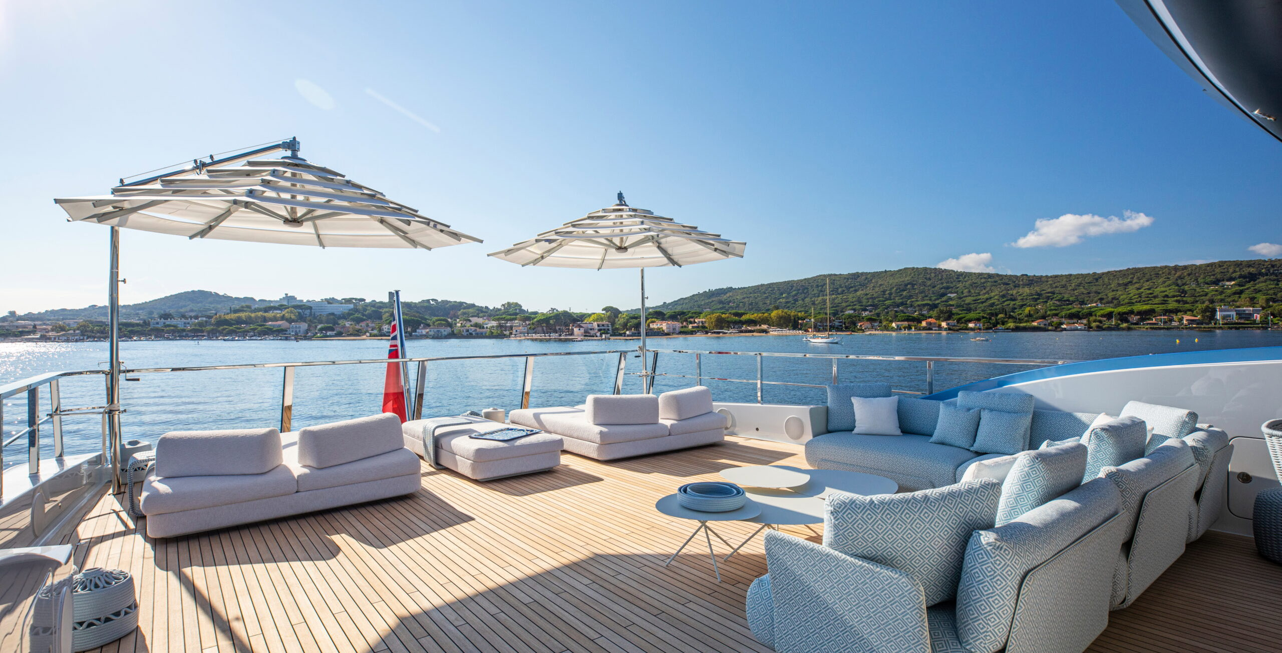 The 5-meter glass pool on the aft deck, fitted with a Swimstream and whirlpool, is unique among 53-meter yachts. This luxurious pool is perfectly complemented by a spacious sun lounge area and a private cocoon lounge forward, just outside the main saloon.