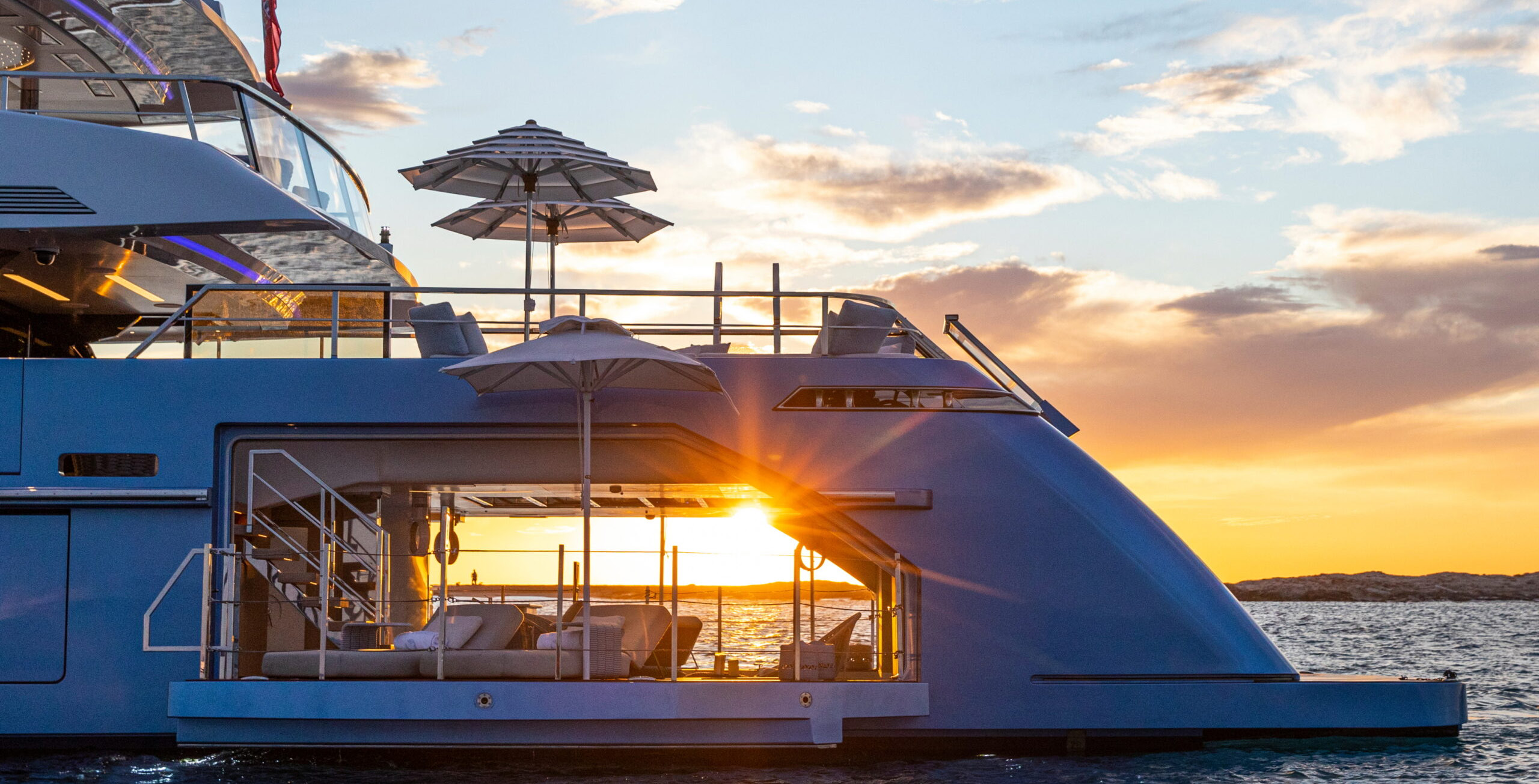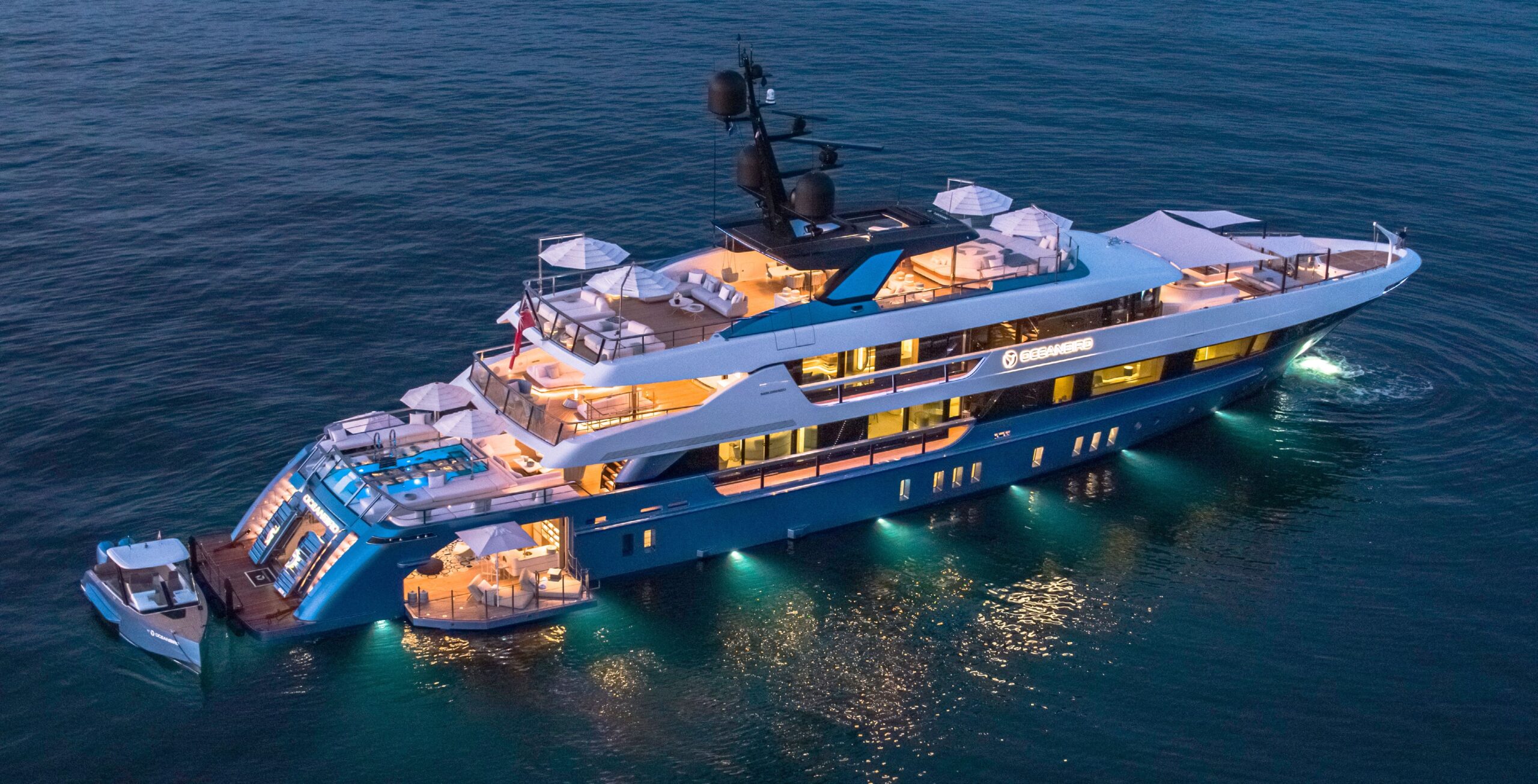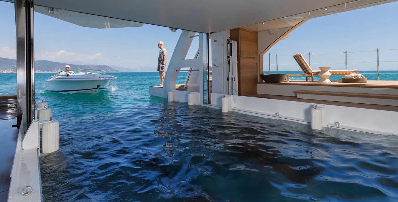 It also doubles as a float-in tender garage from the stern, allowing easy tender entry. When the tender is not in use, the floor lowers to create a full-beam beach club with fold-down balconies.