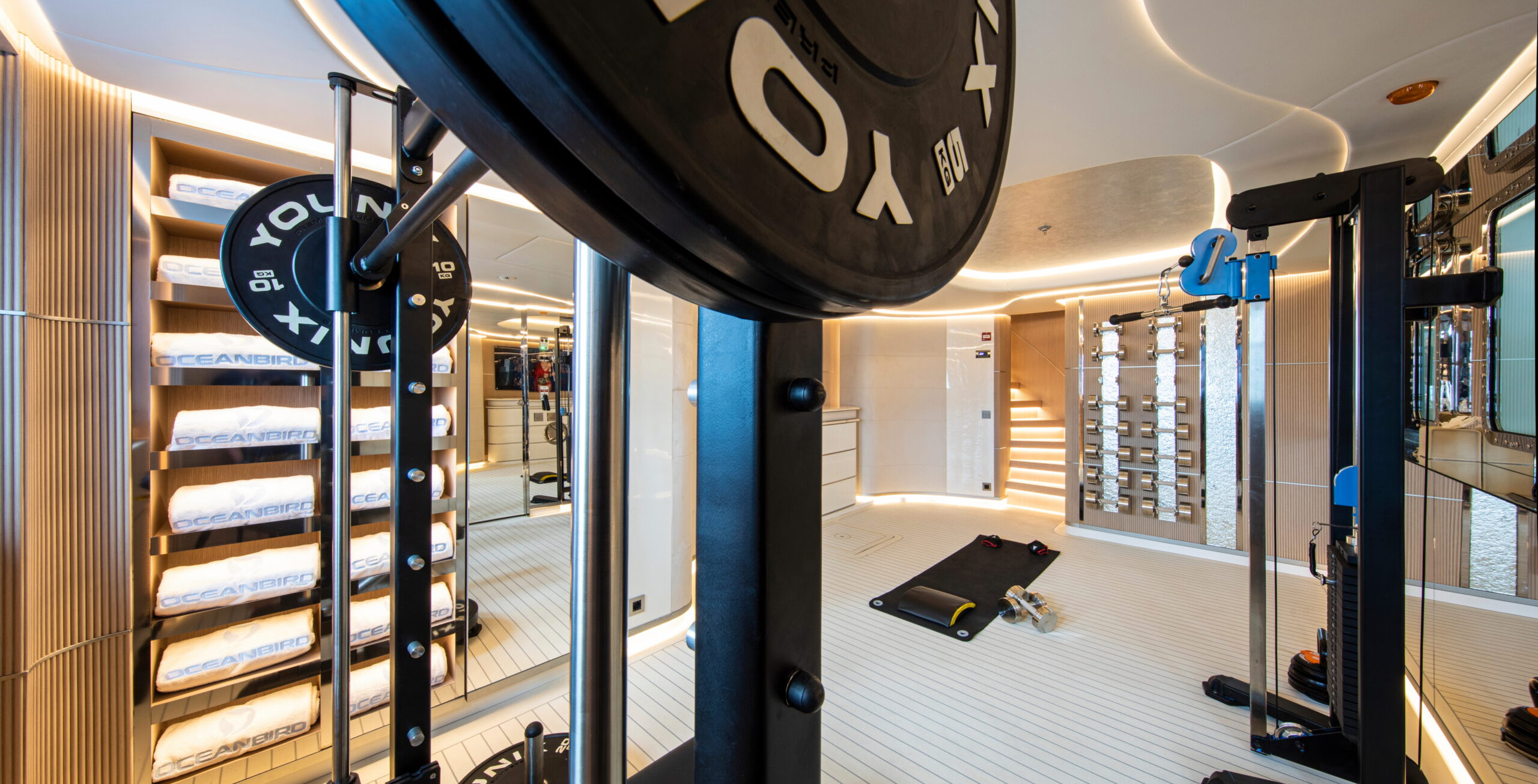 Direct access from the beach club leads to a well-equipped luxury gym, which includes an opening side door for alfresco workouts and features top-of-the-line Technogym equipment.
