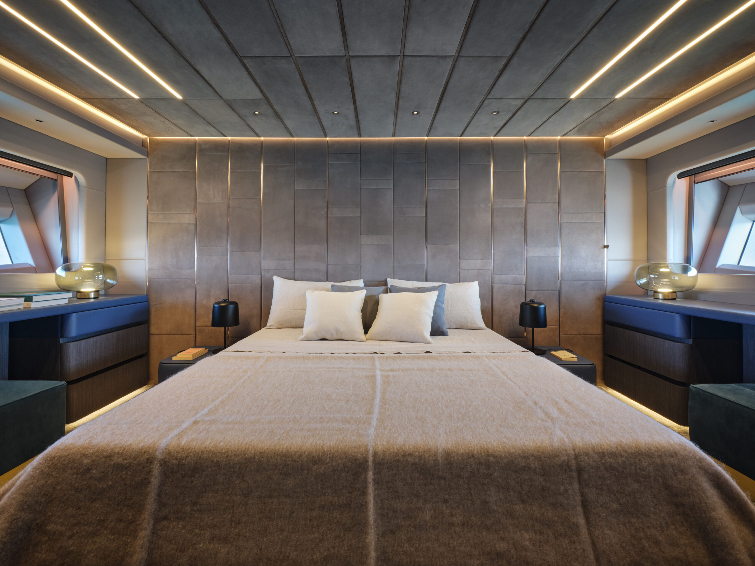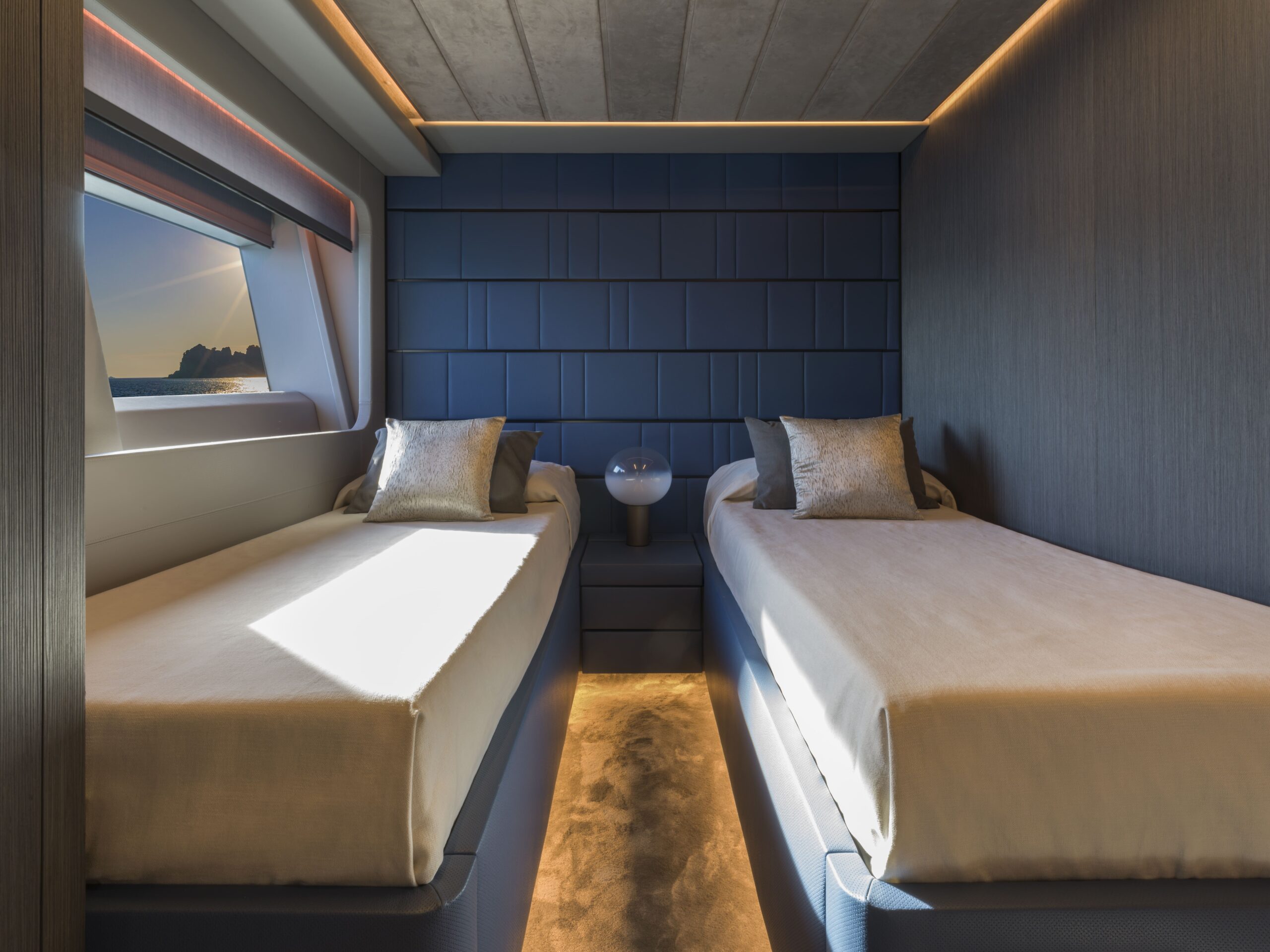 Remarkably spacious for her size, she accommodates up to 10 guests in 4 staterooms—including a full-beam Owner’s suite, VIP, two twin cabins with pullman beds and sliding beds—ideal for both family cruising and entertaining. Crew quarters for 4 ensure seamless service.