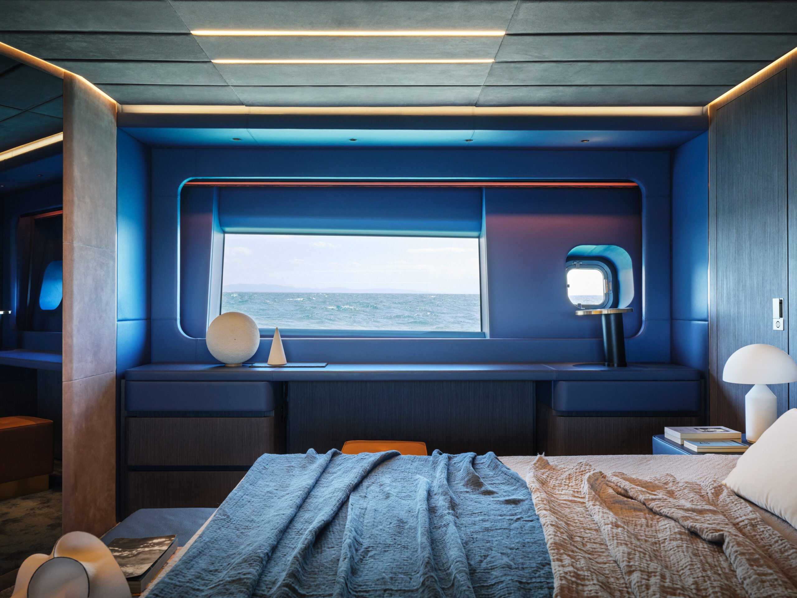 The AB 100's interiors are elevated by contemporary materials, ambient lighting, and electric blinds throughout, complemented by a seamless Crestron smart AV system with iPads in each cabin. The main salon features a 65” 4K Smart TV, a dedicated wine fridge, and an elegant dining area—blurring the lines between comfort, technology, and performance.