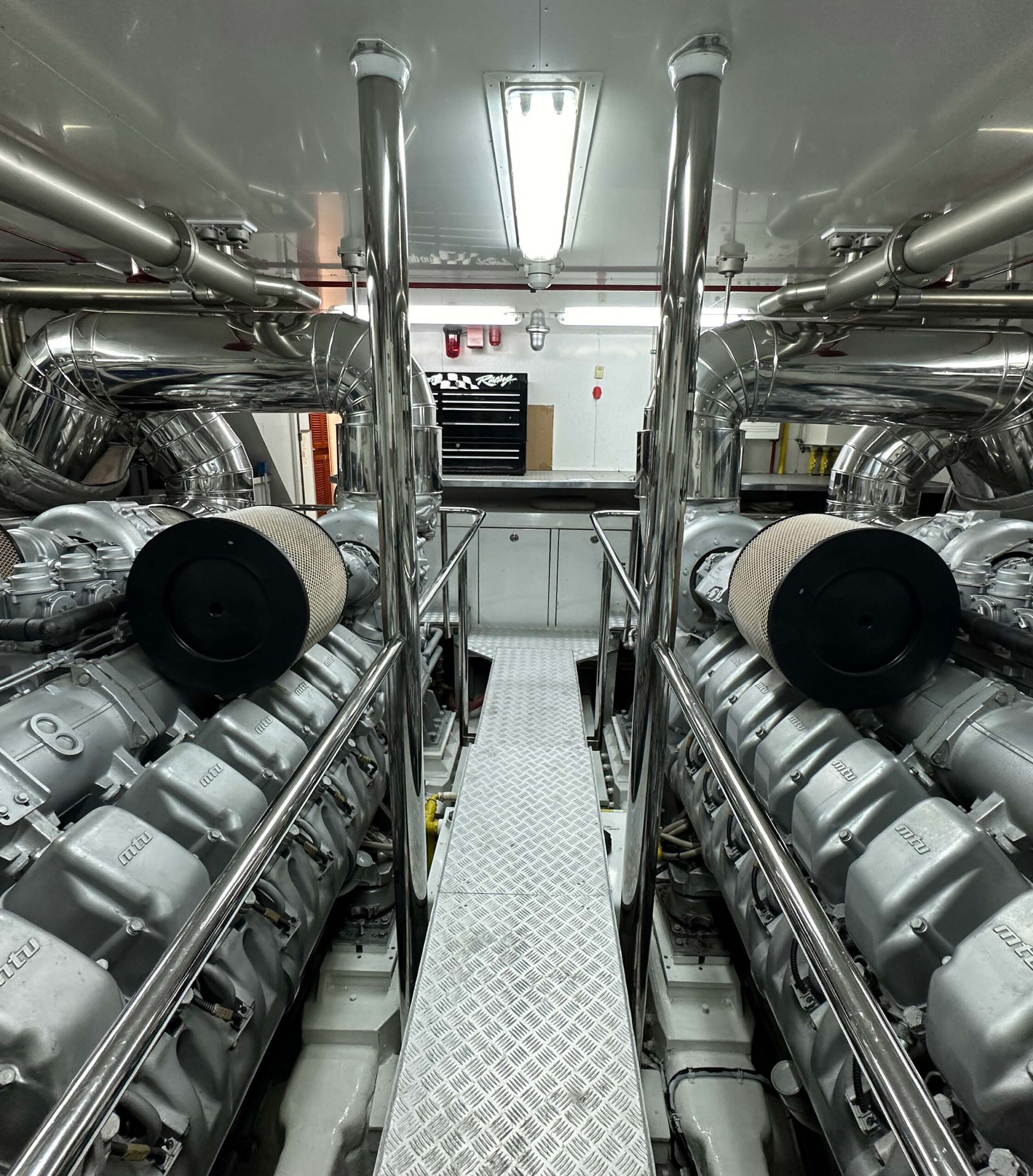 Powered by twin 3,648hp MTU engines, she reaches a top speed of 27 knots and cruises effortlessly at 22 knots, with a range of 1,100 nautical miles at her most efficient speed. Her interior, crafted by Cristiano Gatto, accommodates 11 guests in 5 luxurious cabins, including a full-beam master suite.