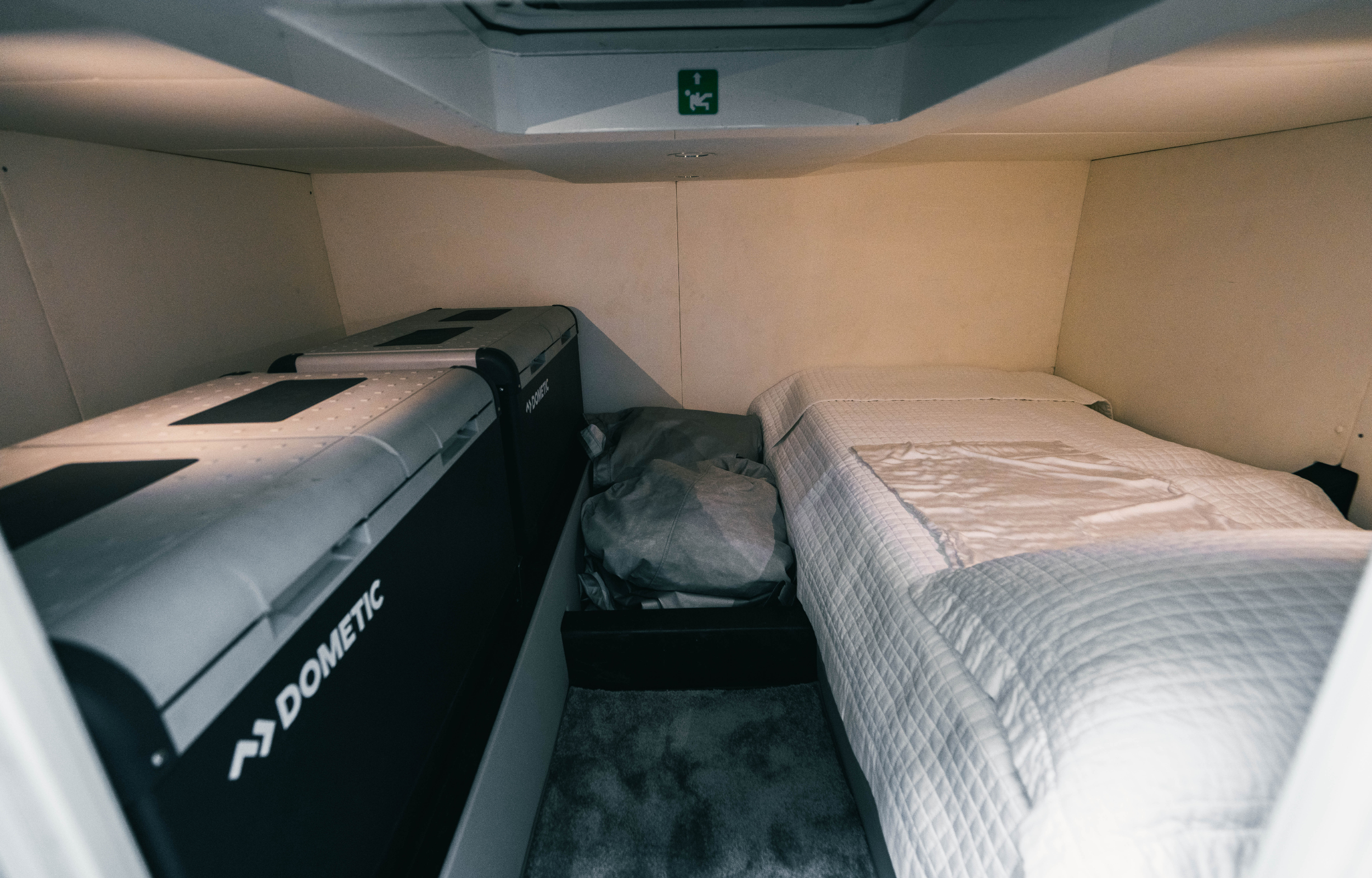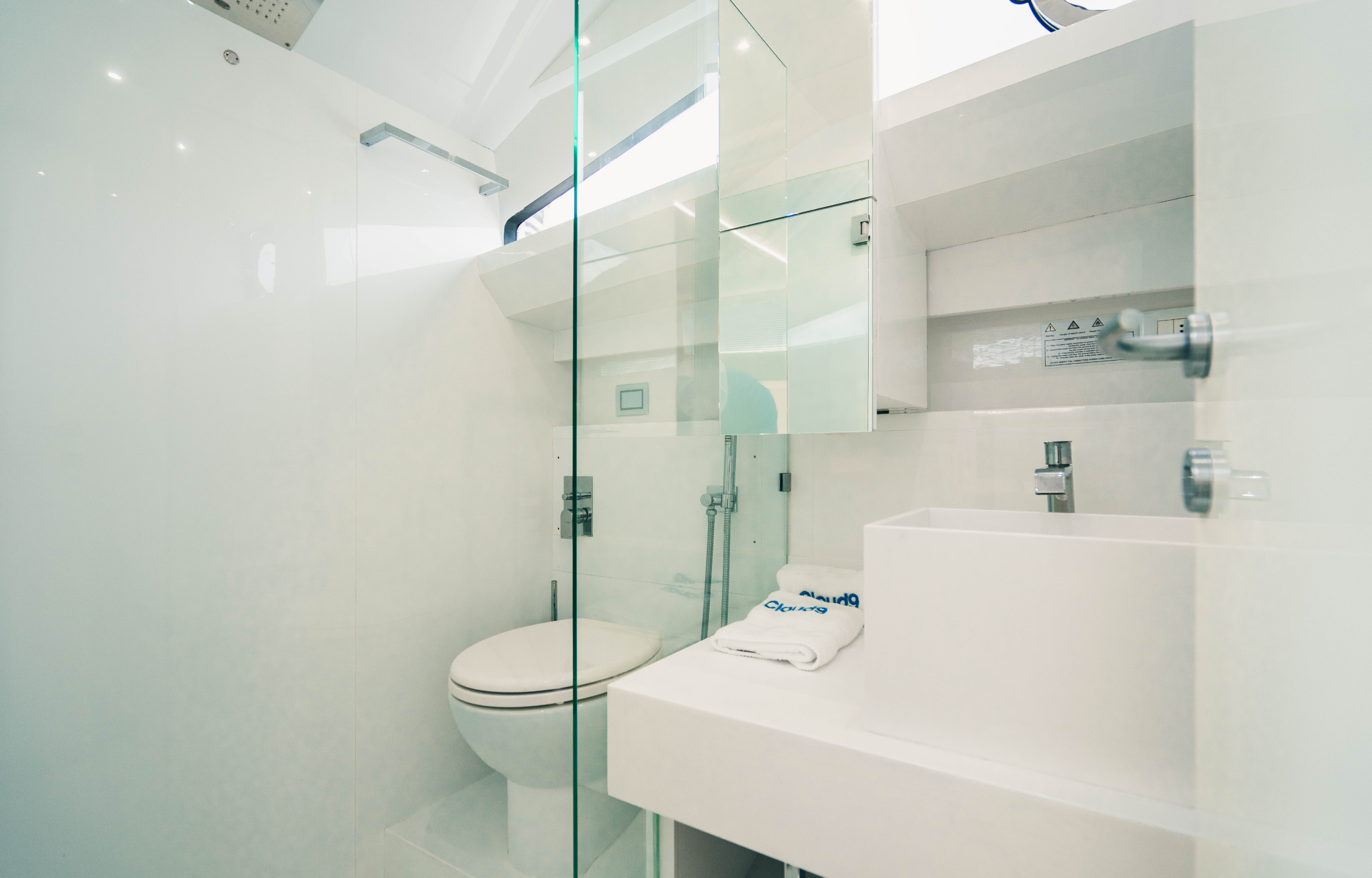The master cabin features an ensuite shower and toilet. Further crew accommodation includes twin bunks, though this is more often used for storage on day trips.