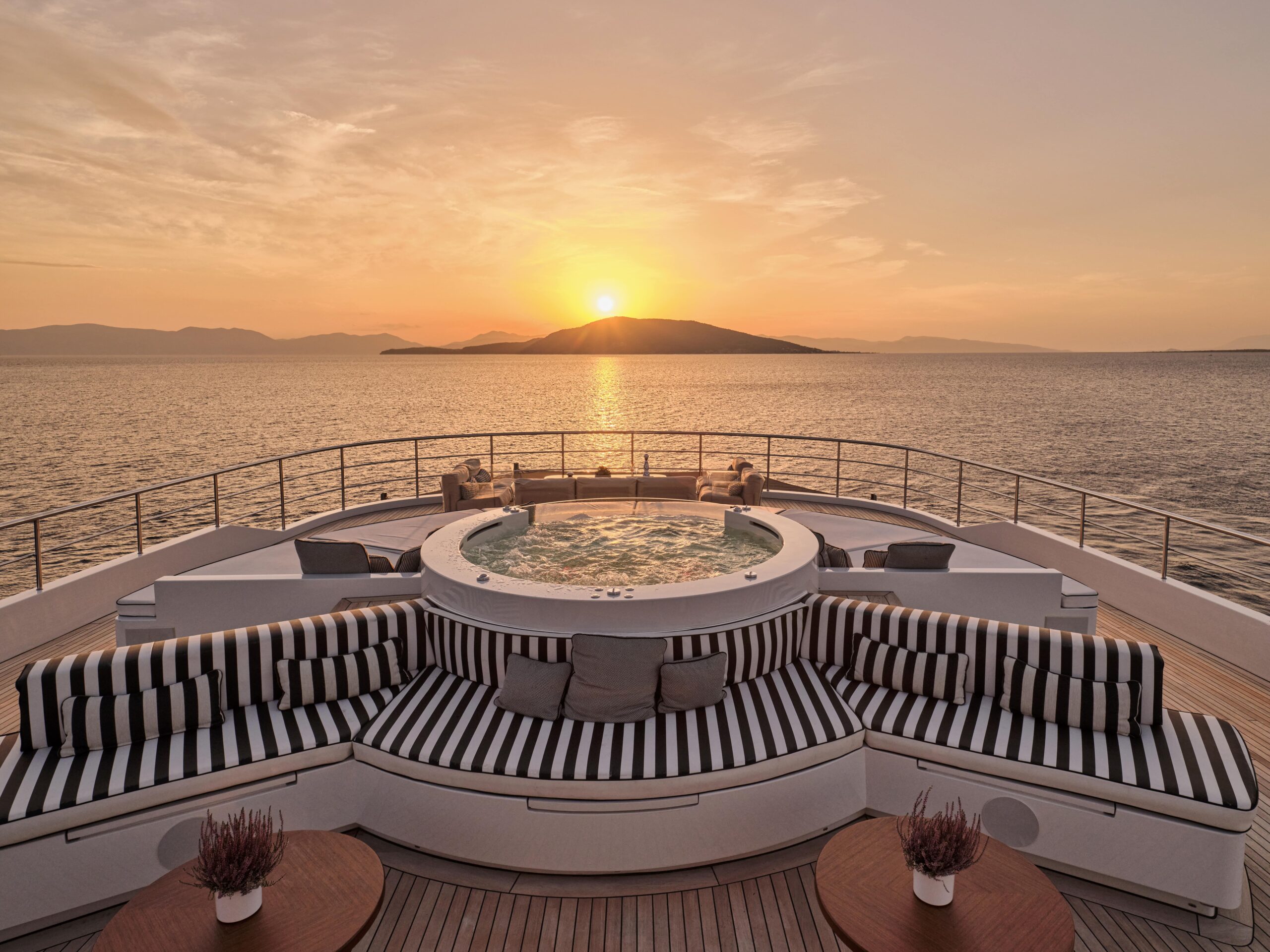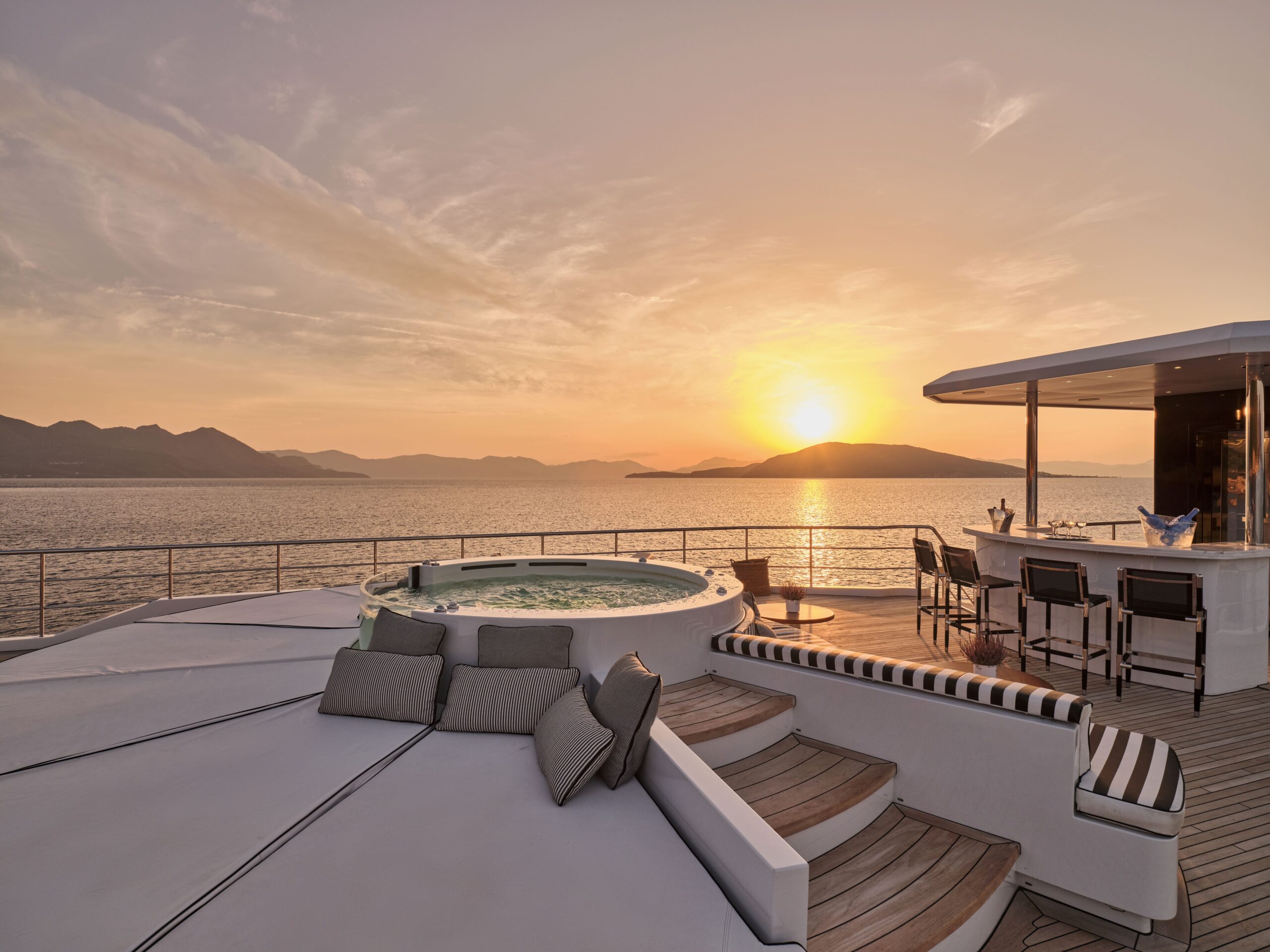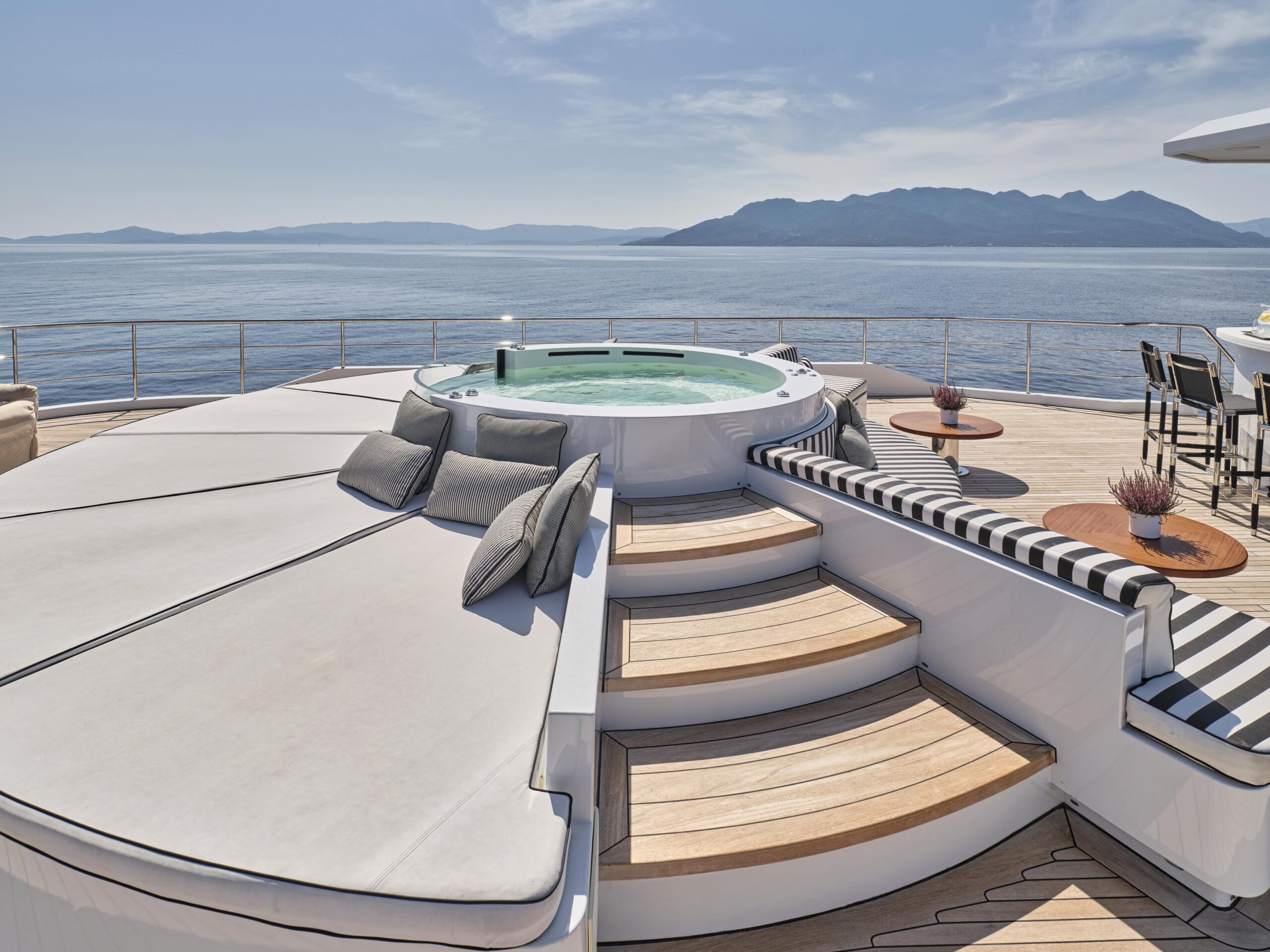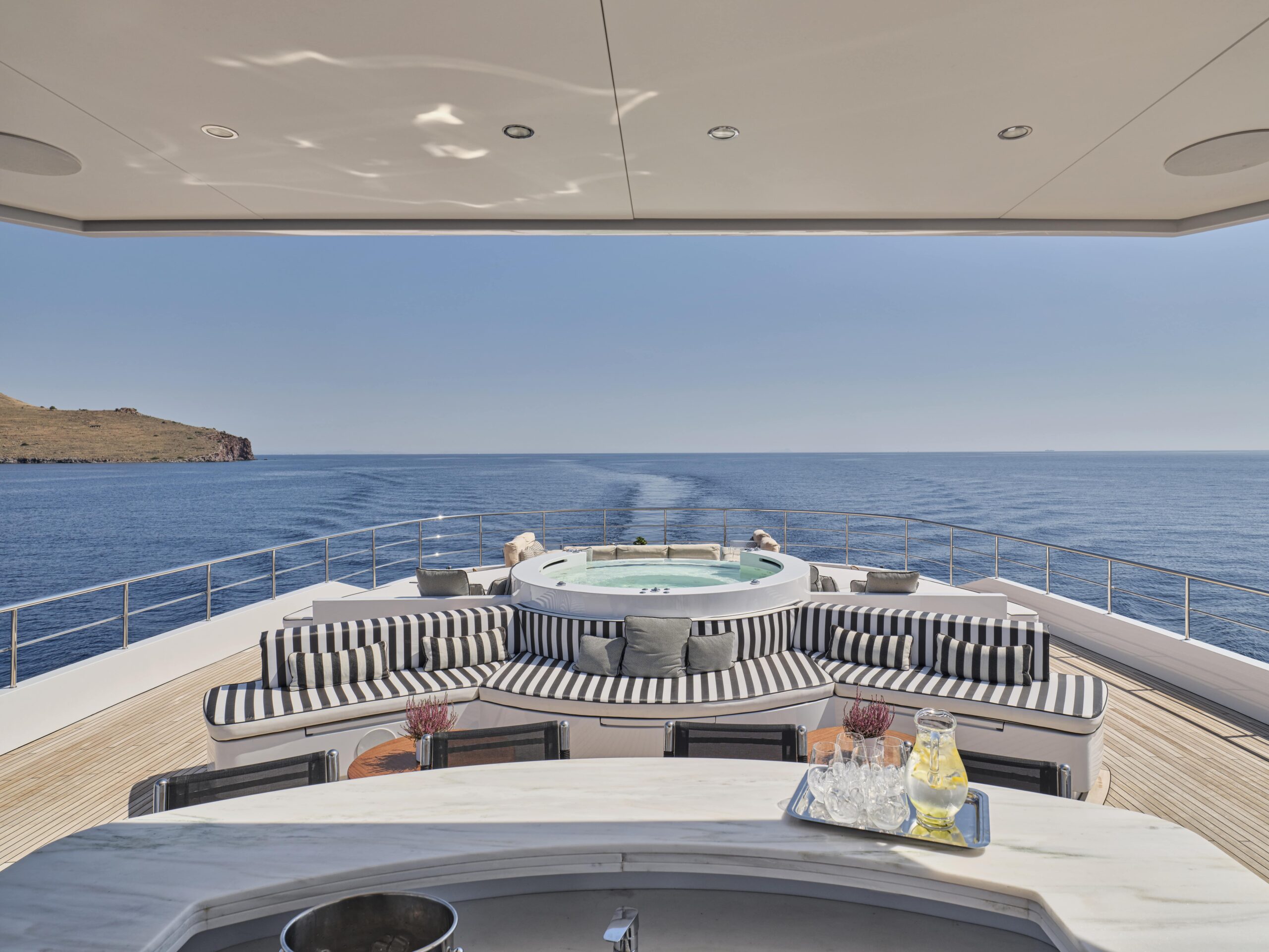 OMNIA’s sundeck is a uniquely versatile space which can be used for socialising or entertaining friends and family in the sunshine. A large jacuzzi pool is surrounded by sunpads while an open-air wet bar and lounge area will ensure you enjoy a panoramic view as you cruise towards your next destination.
