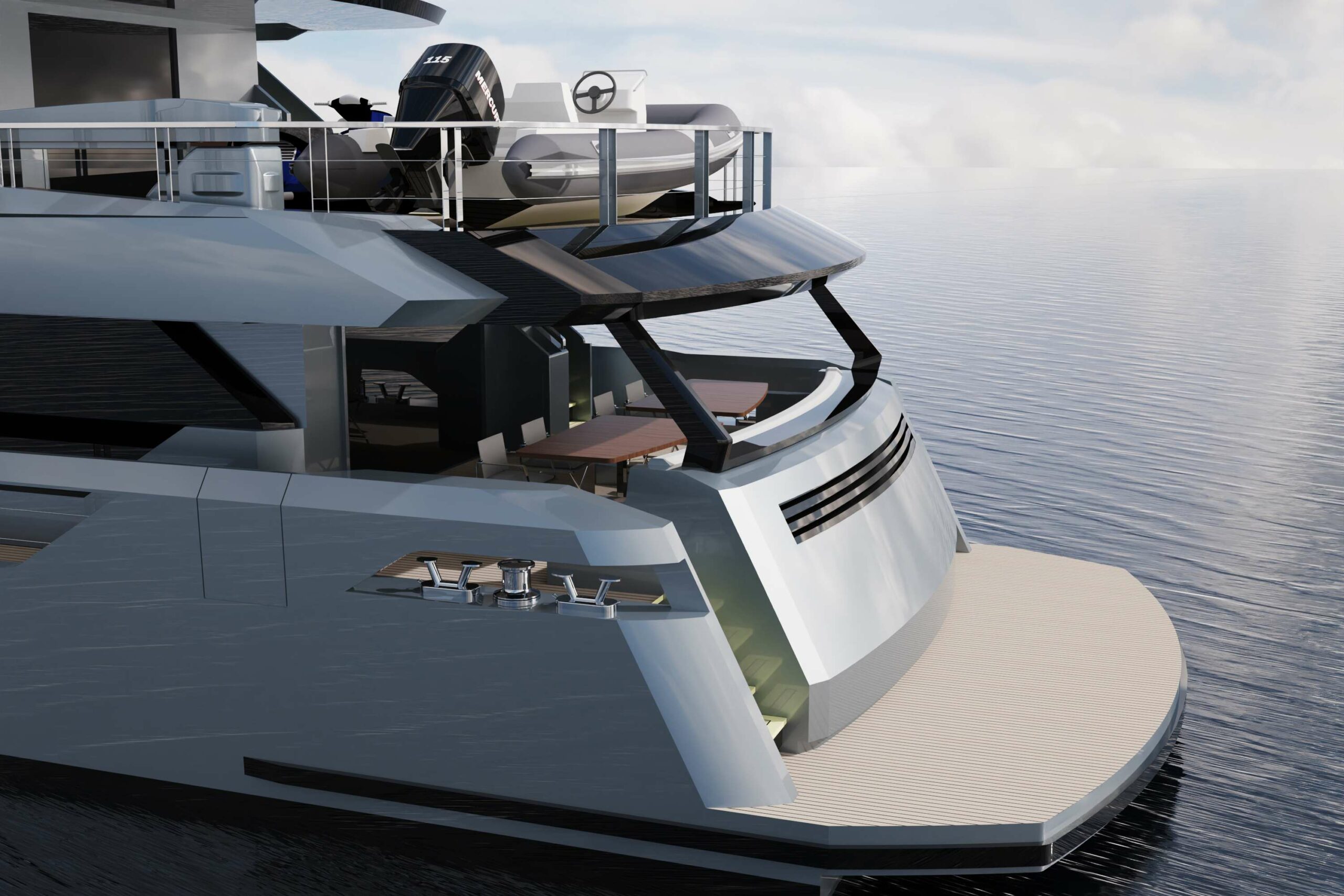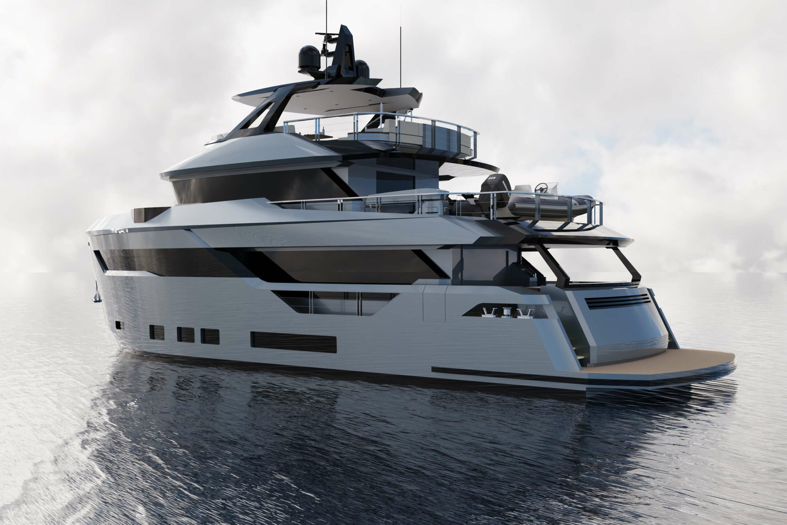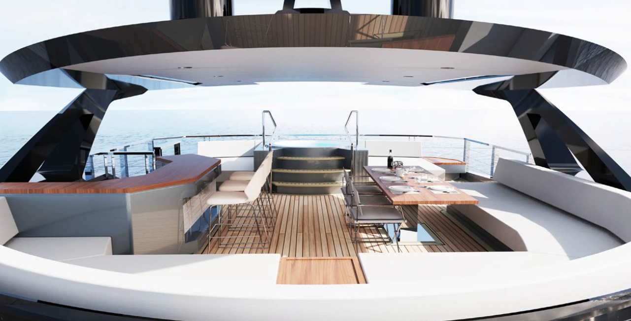 AES 85 boasts an exceptional array of outdoor spaces, thoughtfully crafted for both relaxation and adventure. The expansive bridge deck offers ample storage for tenders and toys, keeping everything within easy reach for on-water activities including a large swimming platform at the aft for easy access to the sea.