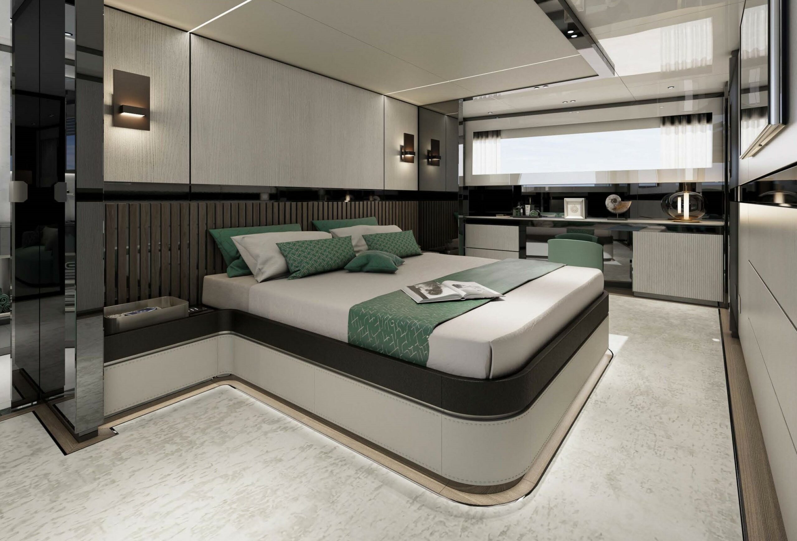 Situated on the Main deck, the Master cabin offers an elegant sanctuary, complete with a private study, a spacious walk-in wardrobe, and the indulgence of separate his and her bathrooms. Thoughtfully designed to blend luxury and functionality, this sophisticated suite provides a tranquil escape, perfectly suited for relaxation and privacy.