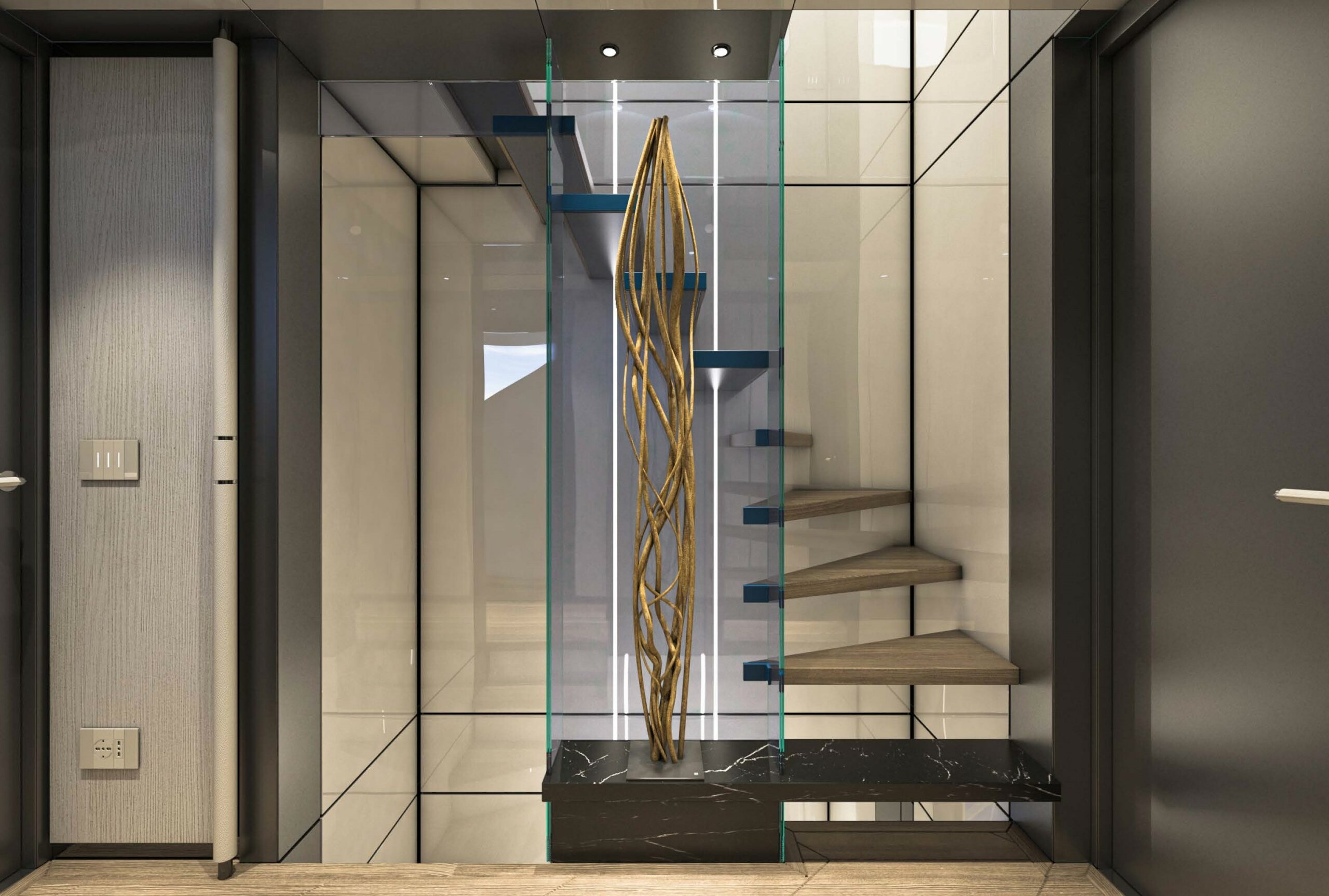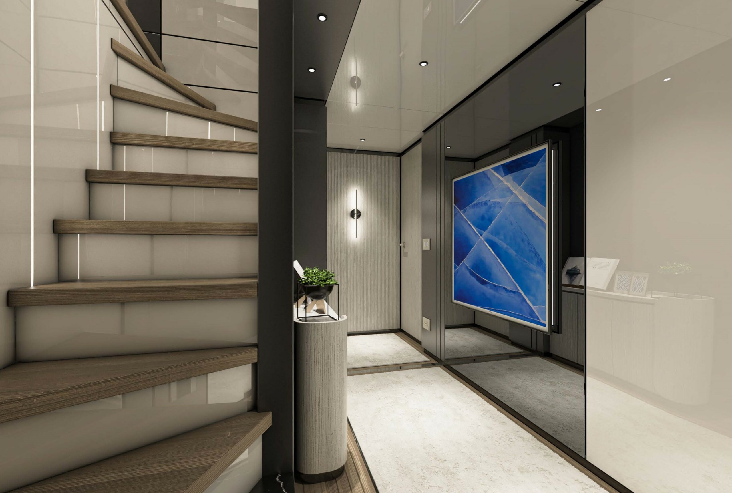 - Yacht for sale AES 85 Hull#01 was styled by Hot Lab, featuring modern, elegant interiors with Carrara marble and dark wood parquet